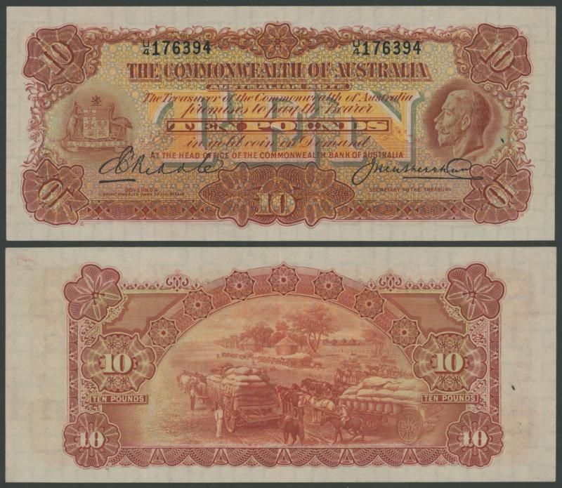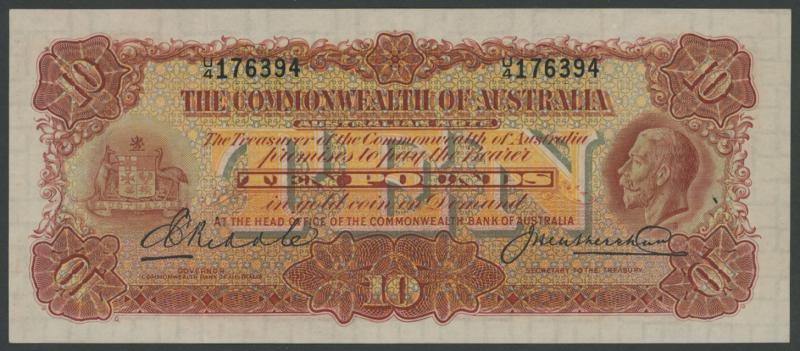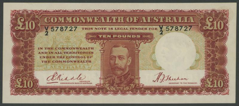 3248 image1934 KGV £10 Riddle/Sheehan R57 serial 'V/2 578727', a natural crisp note with raised ink in white-line lacework borders, traces of centre bend, aUnc/Unc, Cat $7100 for aUnc, $11,500 for Unc. (Image1) (Image2)