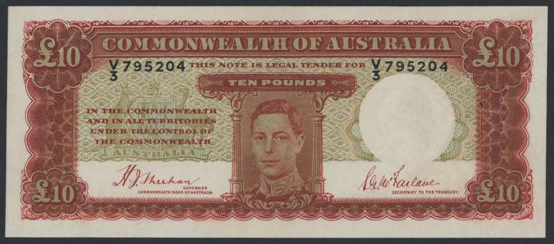 3249 image1940 KGVI £10 Sheehan/McFarlane R58F First Prefix serial 'V/3 795204', cleaned and flattened. (Image1) (Image2)
