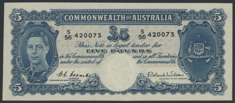 3244 image1952 KGVI £5 Coombs/Wilson R48 serial 'S/56 420073', Uncirculated, Cat $1900. (Image1) (Image2)