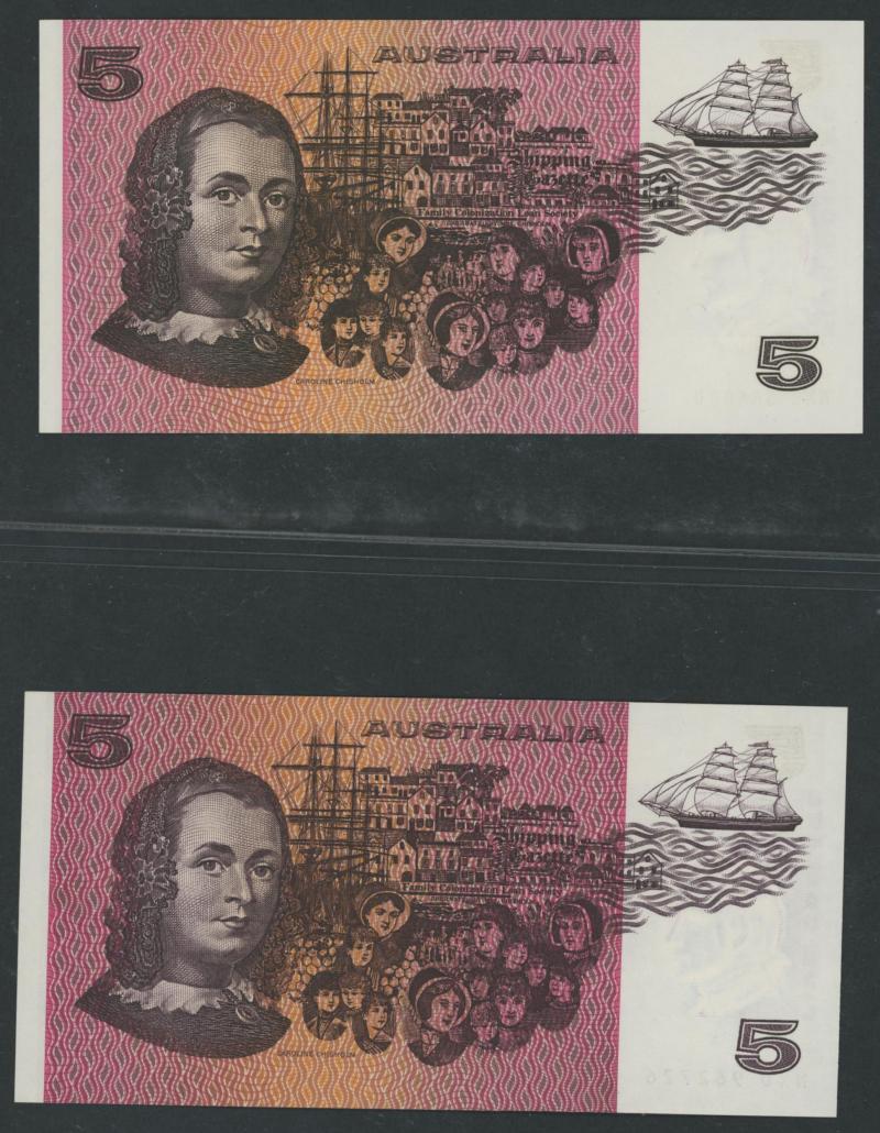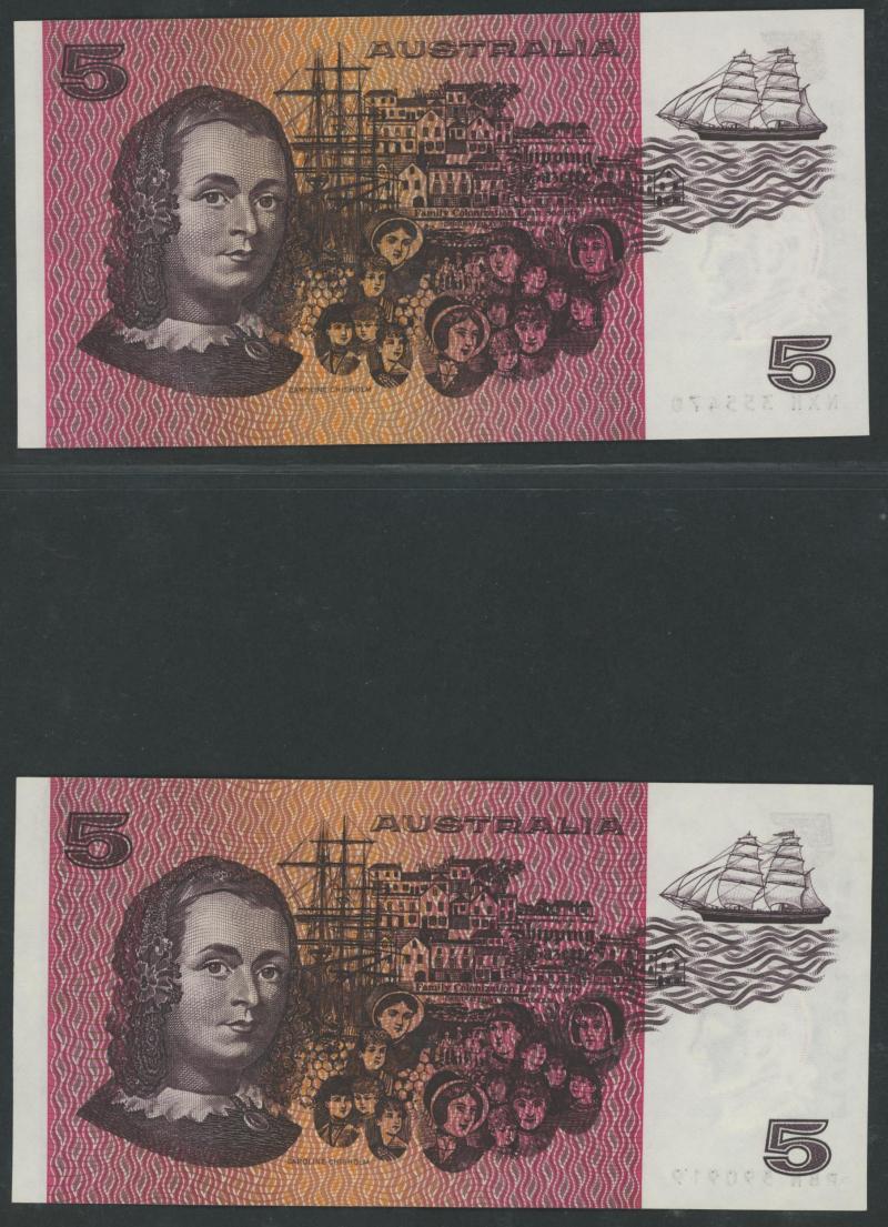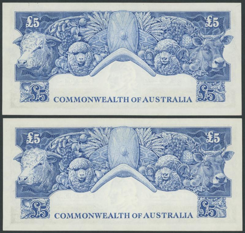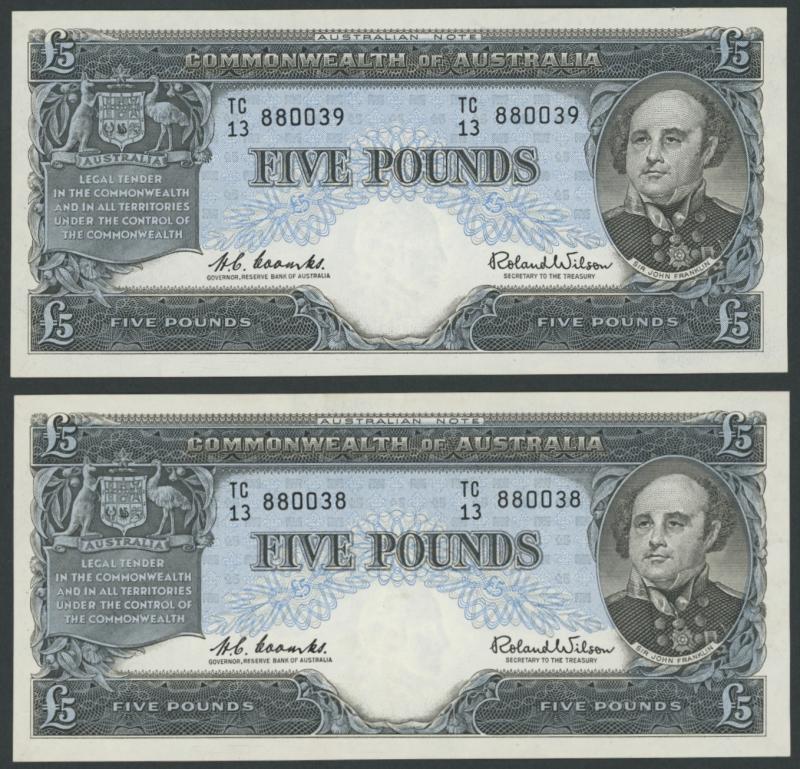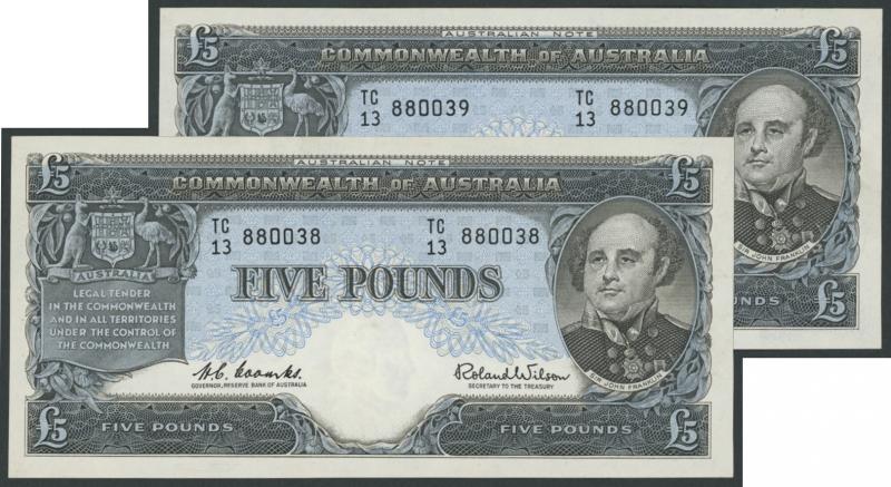 3245 image1954 £5 Coombs/Wilson Reserve Bank R50 consecutive pair serials 'TC/13 880038'-'039', Uncirculated, Cat $1000. (2) (Image1) (Image2) (Image3)