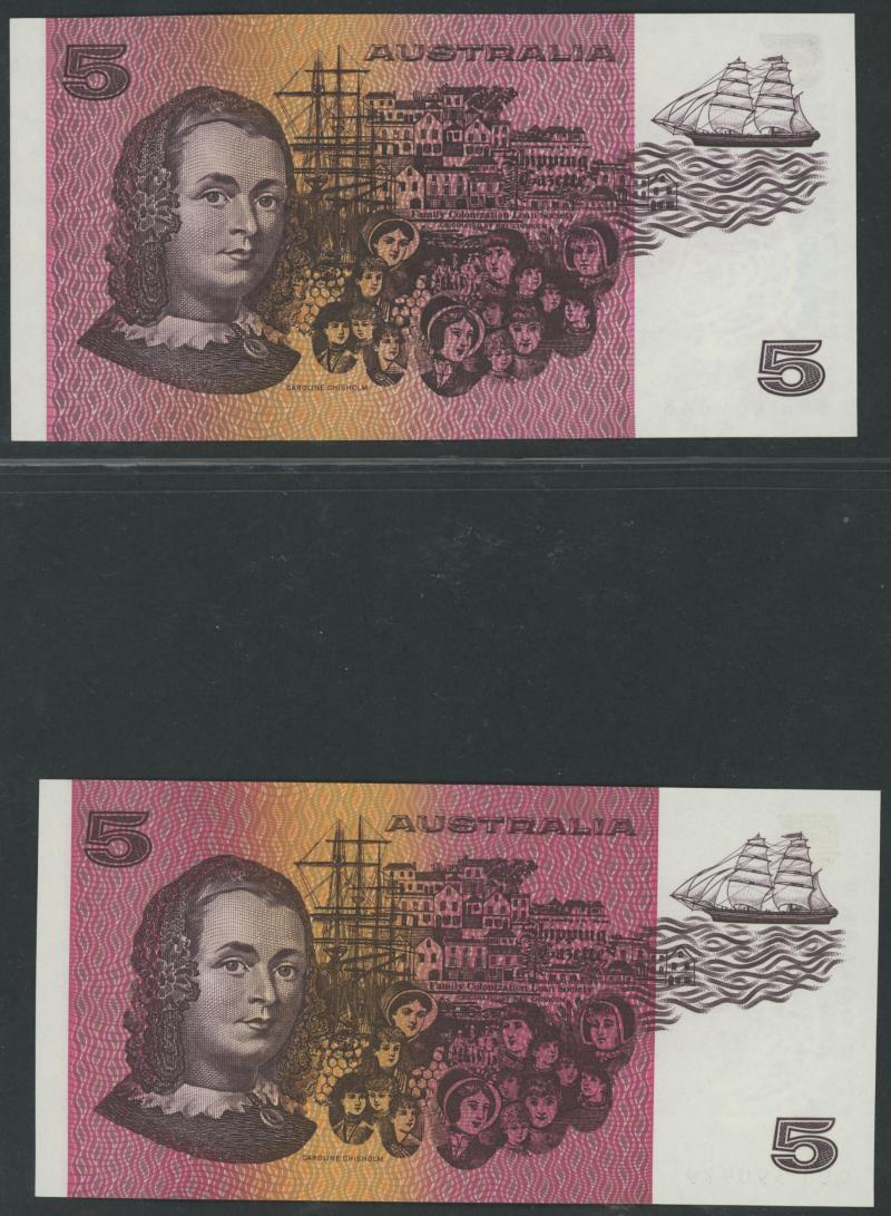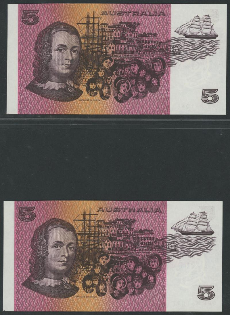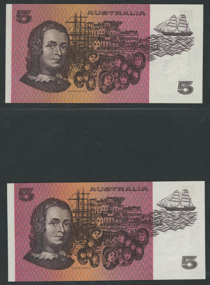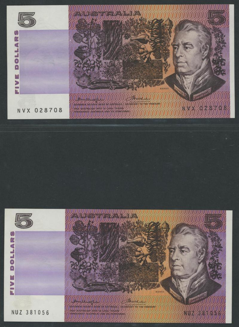 3245 image1954 £5 Coombs/Wilson Reserve Bank R50 consecutive pair serials 'TC/13 880038'-'039', Uncirculated, Cat $1000. (2) (Image1) (Image2) (Image3)