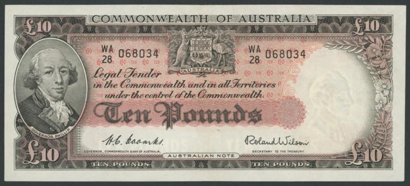 3253 image1954 £10 Coombs/Wilson Commonwealth Bank R62L Last Prefix serial 'WA/28 068034', flattened centre bend/fold, aUnc, Cat $2000. (Image1) (Image2)