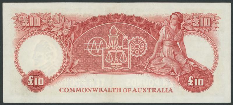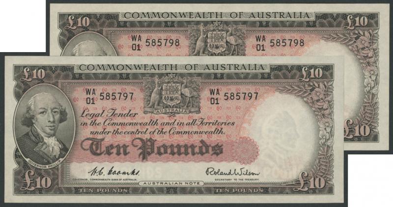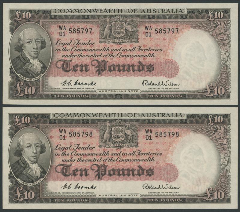 3252 image1954 £10 Coombs/Wilson Commonwealth Bank R62 consecutive pair serials 'WA/01 585797'-'798', a little aged, Uncirculated, Cat $2000. (2) (Image1) (Image2) (Image3)