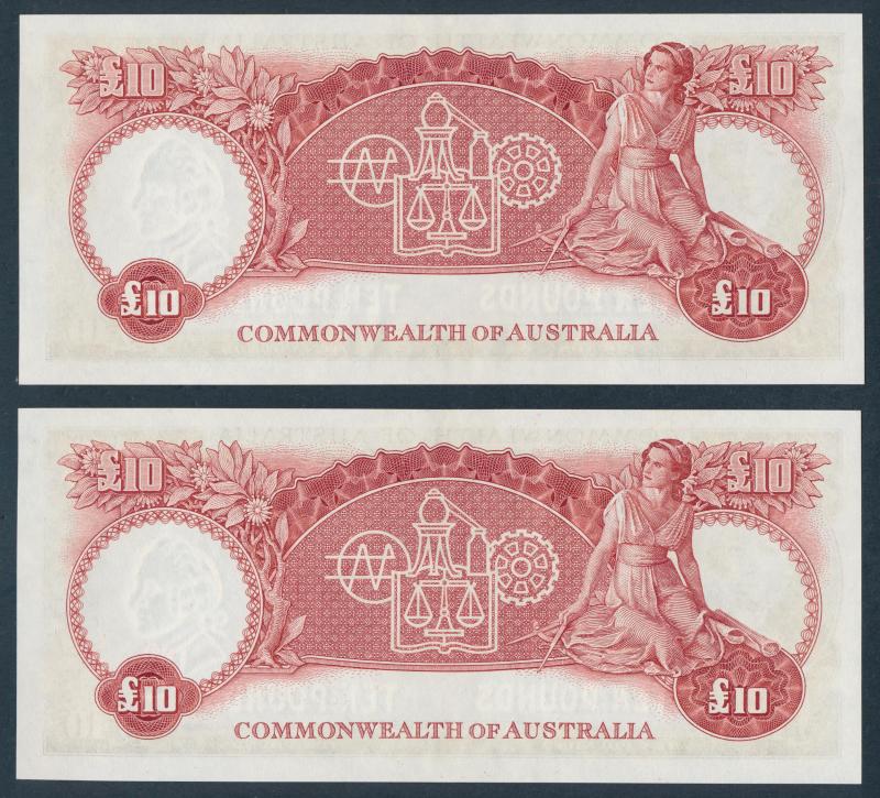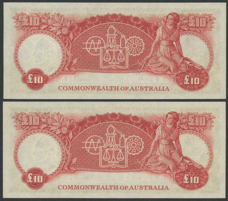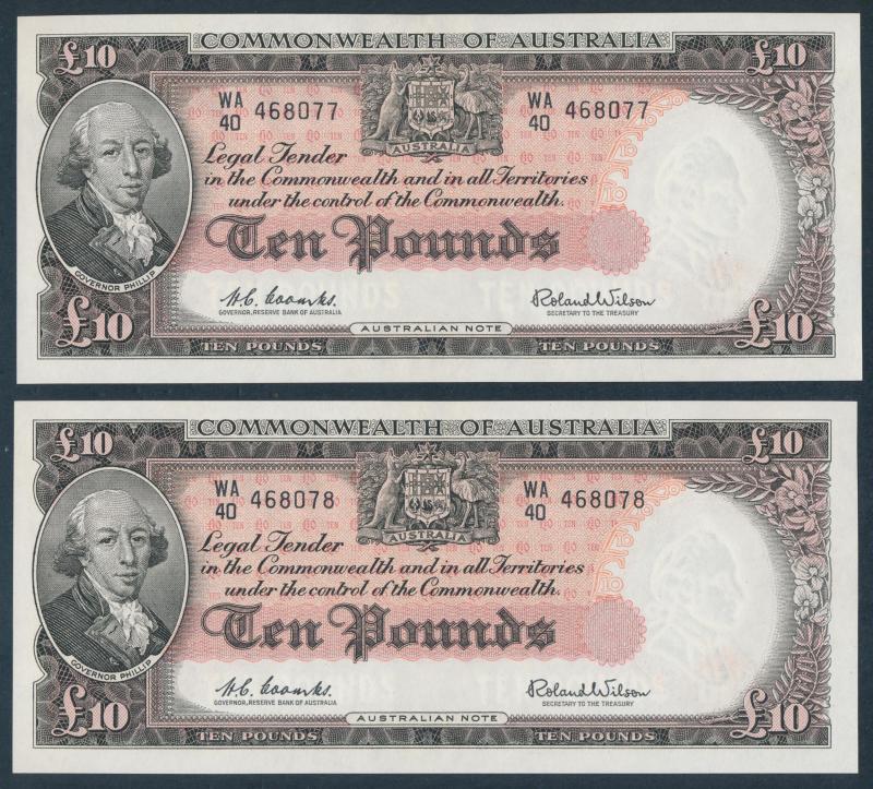 3254 image1960 £10 Coombs/Wilson Reserve Bank R63 consecutive pair serials 'WA/40 468077'-'078', Uncirculated, Cat $1800. (2) (Image1) (Image2)