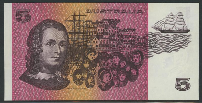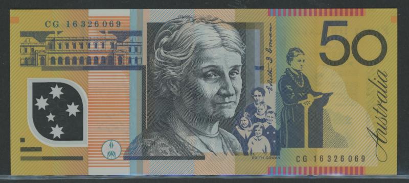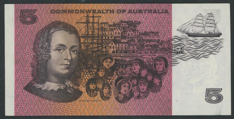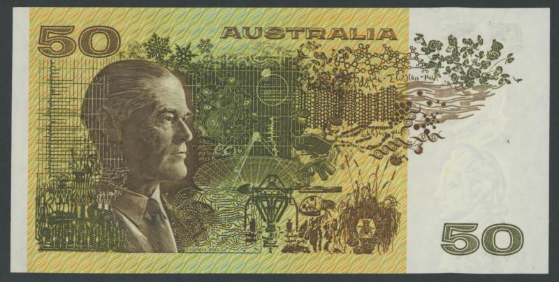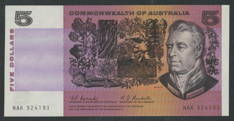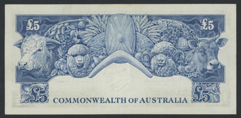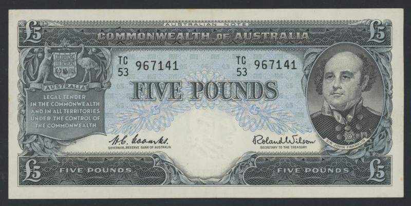 3246 image1961 £5 Coombs/Wilson Reserve Bank R50 serial 'TC/53 967141', light rust mark at top, wavy paper, aUnc, Cat $275. (Image1) (Image2)