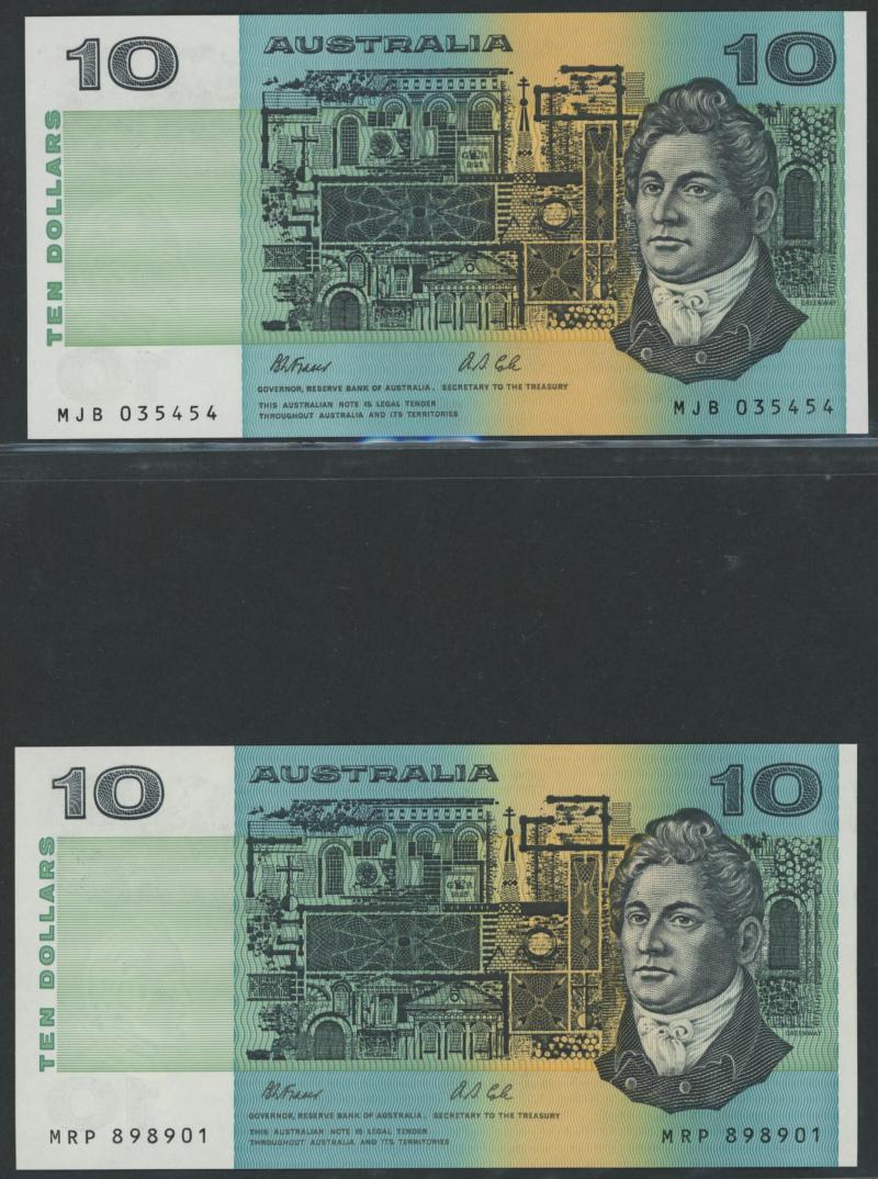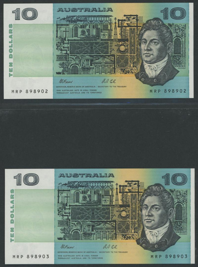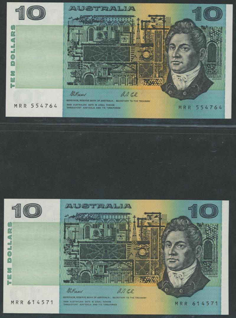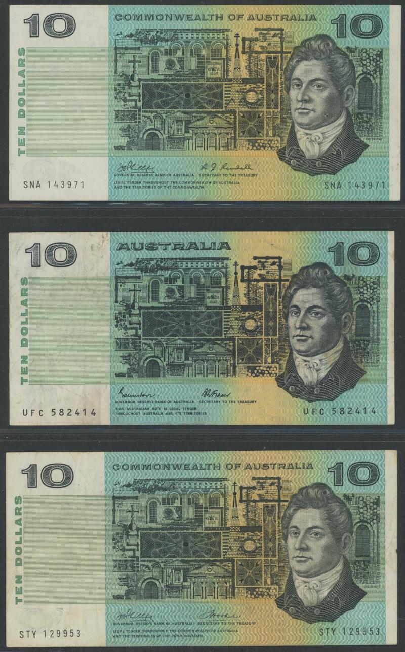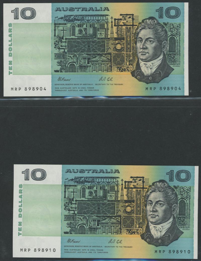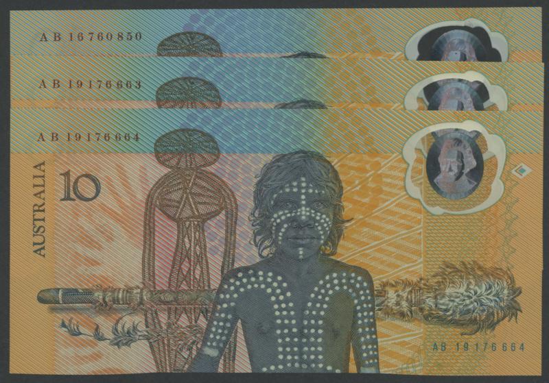 3258 image1982 $1 Johnston/Stone R78 consecutive run of ten; 1985 $2 Johnston/Fraser R89 consecutive run of ninety; and 1988 $10 Bicentenary Reissue R310b (14) including First Prefix 'AB10 178967' (three vertical bends/light folds); condition variable, most with pay-packet bends, EF-Unc. (124) (Image1) (Image2) (Image3) (Image4) (Image5) (Image6)