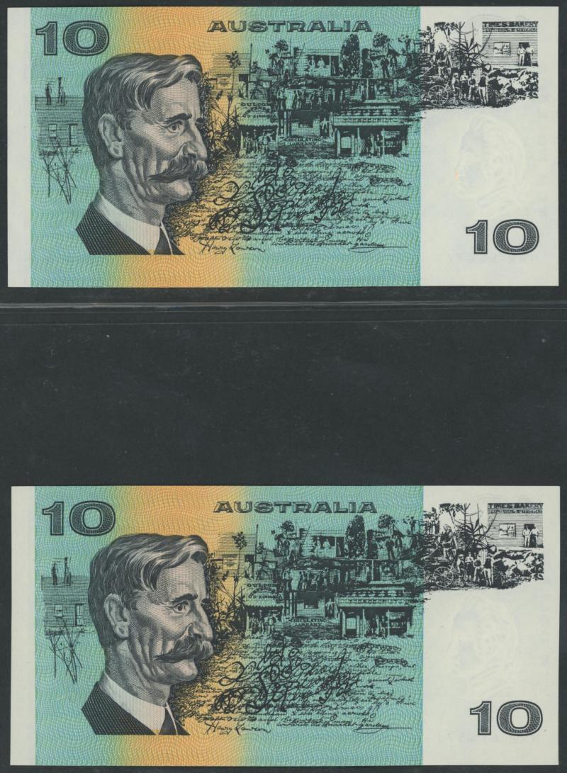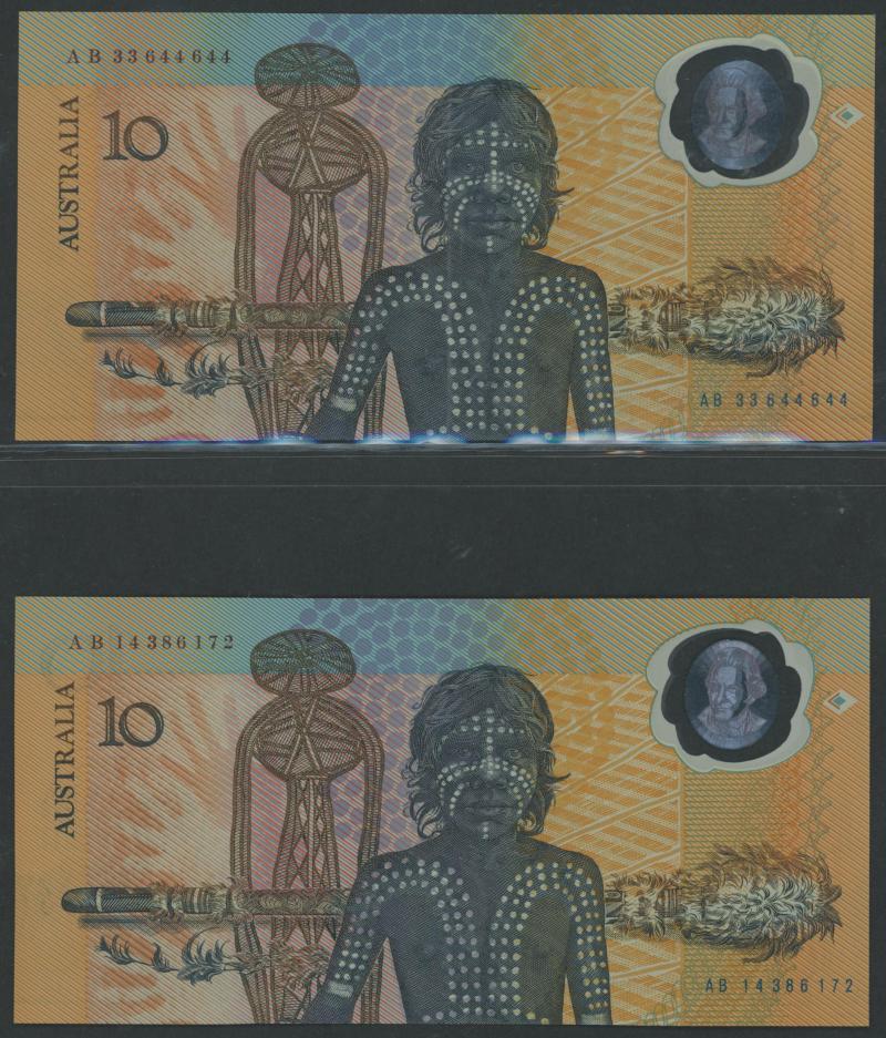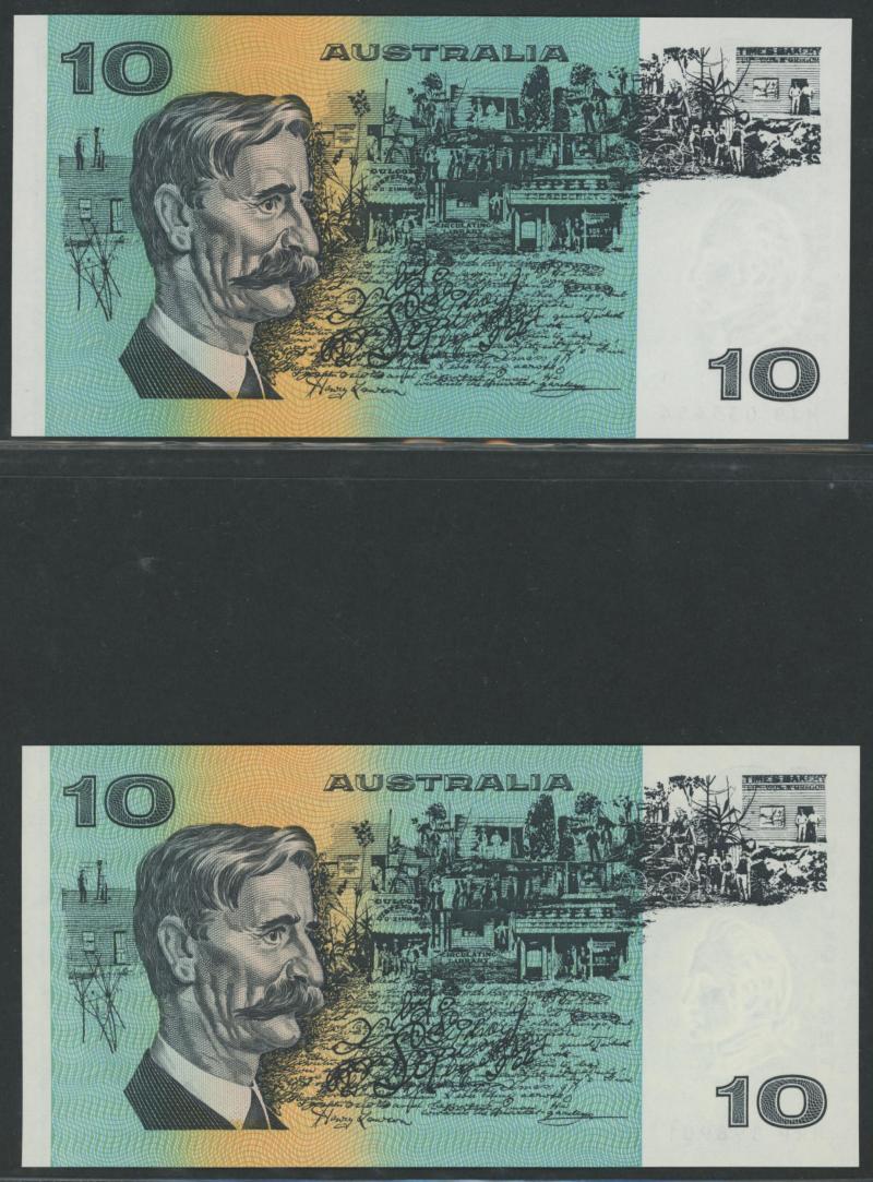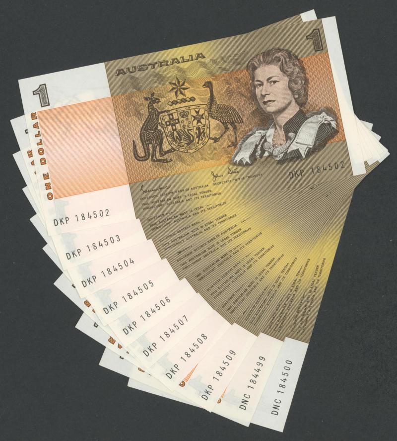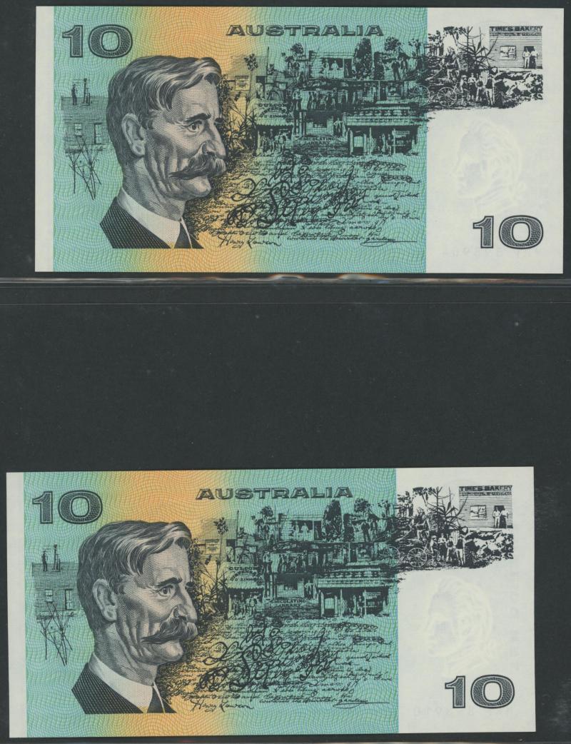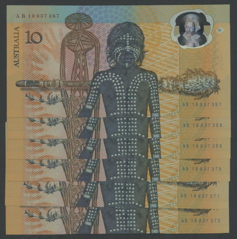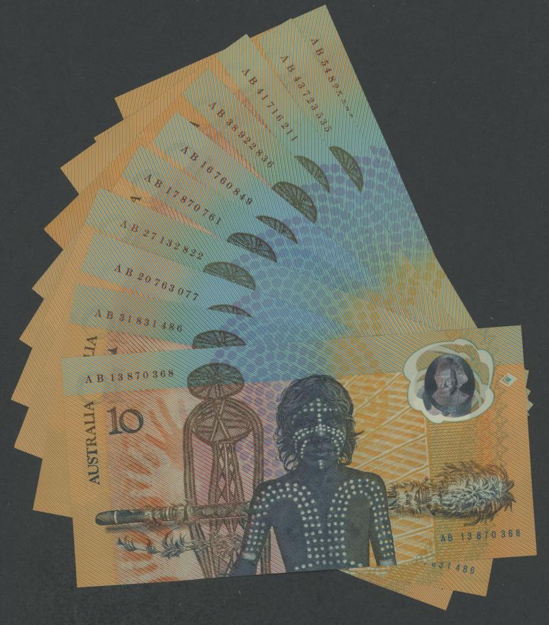 3258 image1982 $1 Johnston/Stone R78 consecutive run of ten; 1985 $2 Johnston/Fraser R89 consecutive run of ninety; and 1988 $10 Bicentenary Reissue R310b (14) including First Prefix 'AB10 178967' (three vertical bends/light folds); condition variable, most with pay-packet bends, EF-Unc. (124) (Image1) (Image2) (Image3) (Image4) (Image5) (Image6)