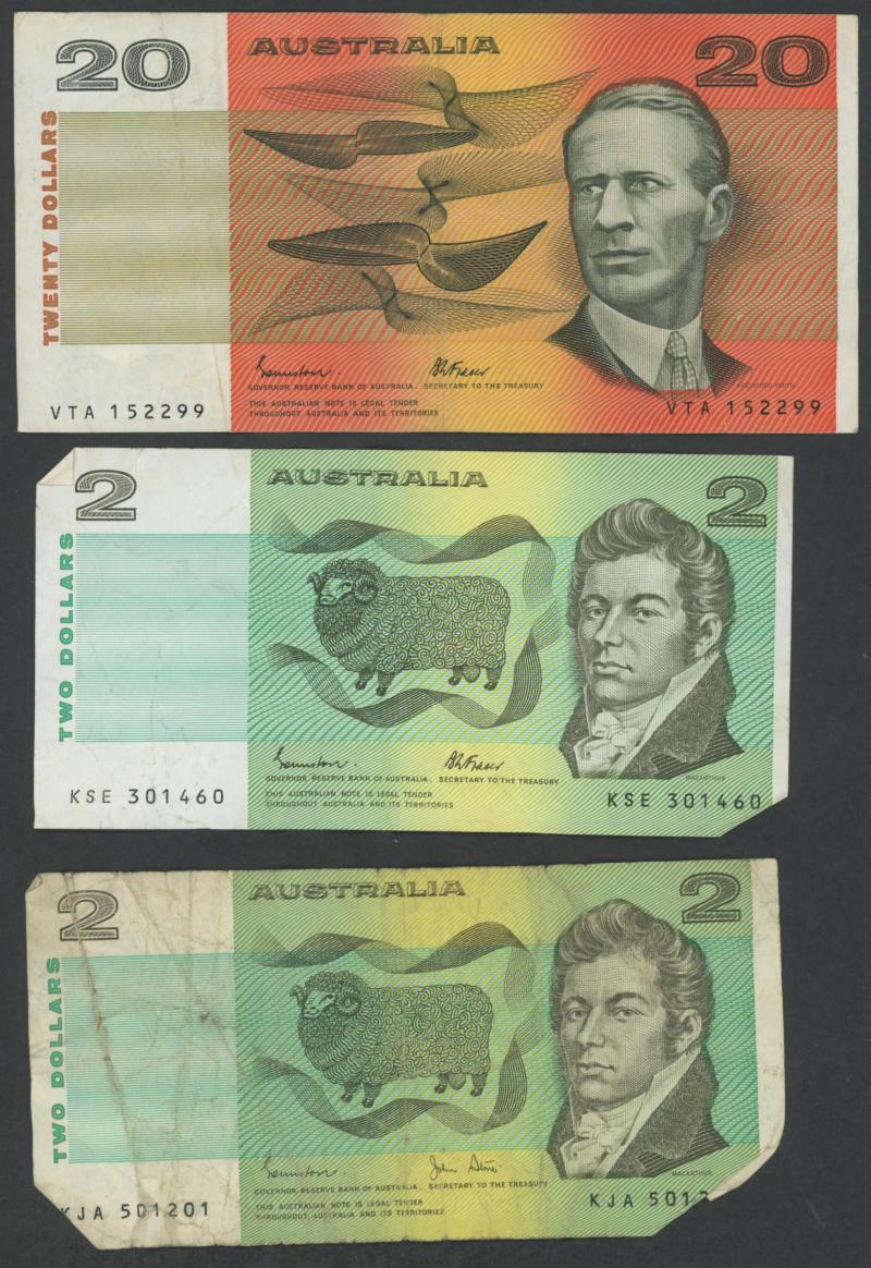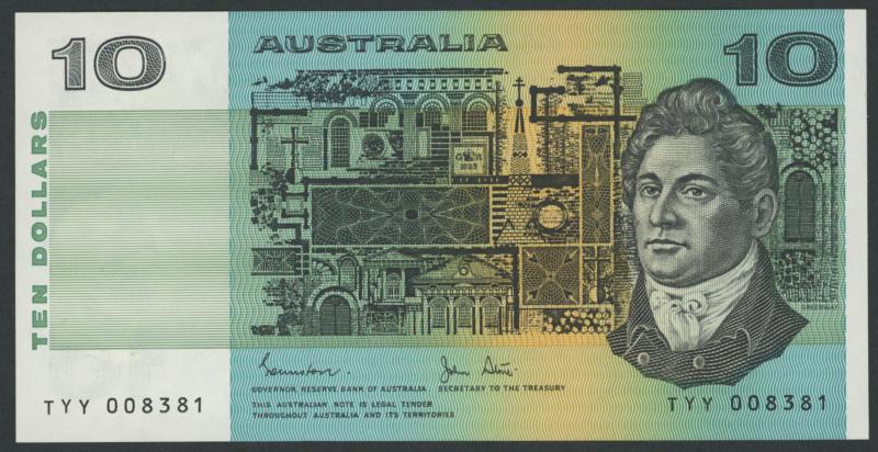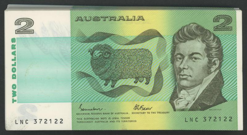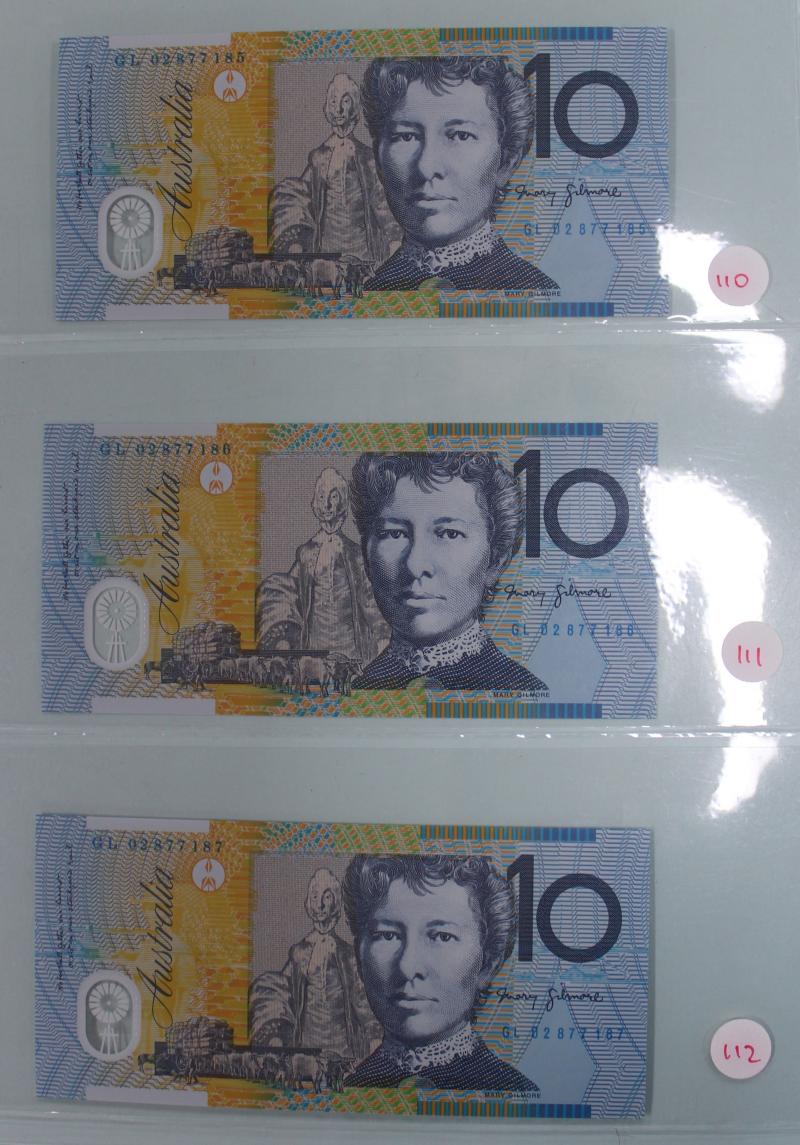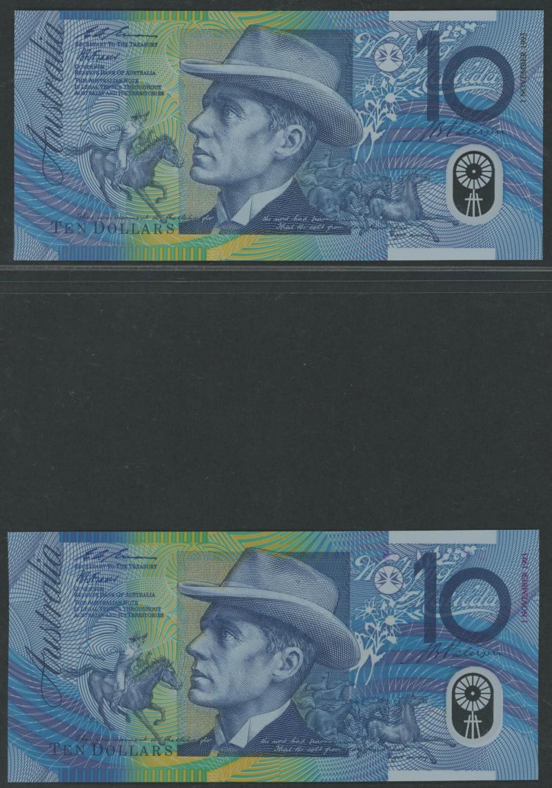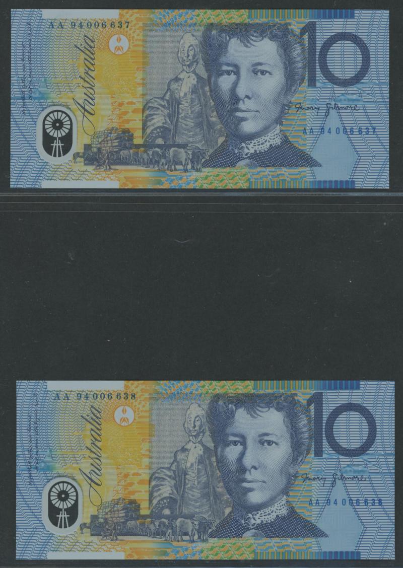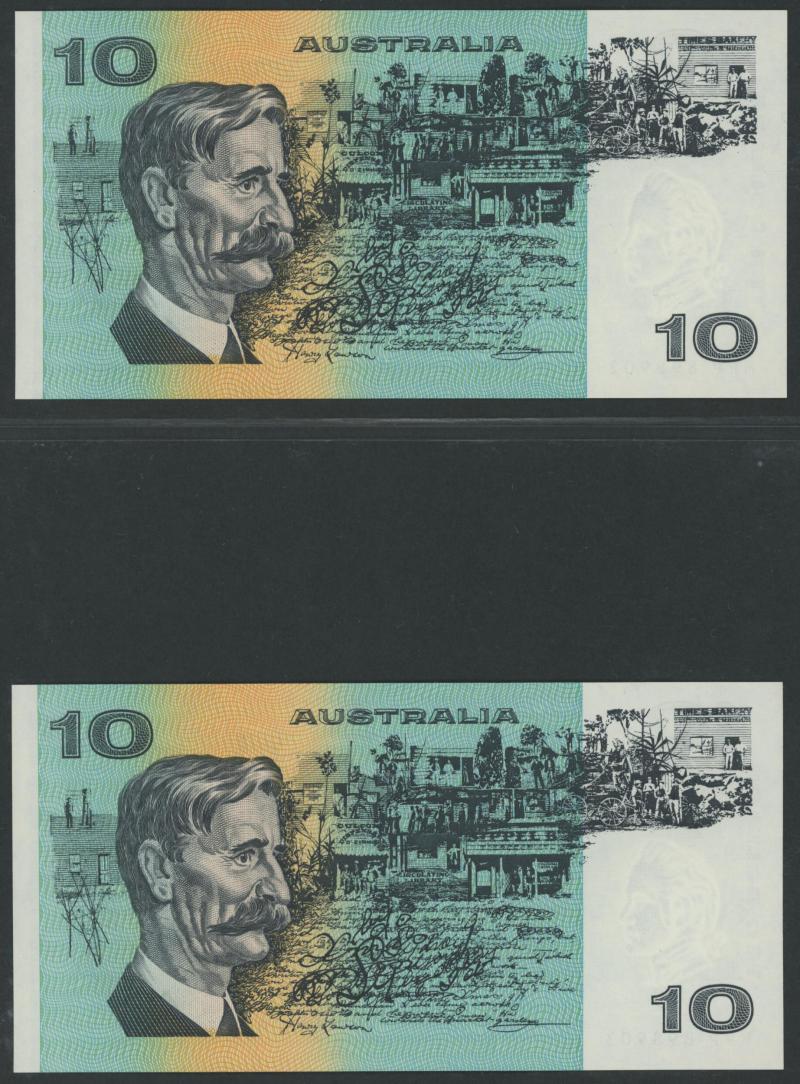 3258 image1982 $1 Johnston/Stone R78 consecutive run of ten; 1985 $2 Johnston/Fraser R89 consecutive run of ninety; and 1988 $10 Bicentenary Reissue R310b (14) including First Prefix 'AB10 178967' (three vertical bends/light folds); condition variable, most with pay-packet bends, EF-Unc. (124) (Image1) (Image2) (Image3) (Image4) (Image5) (Image6)