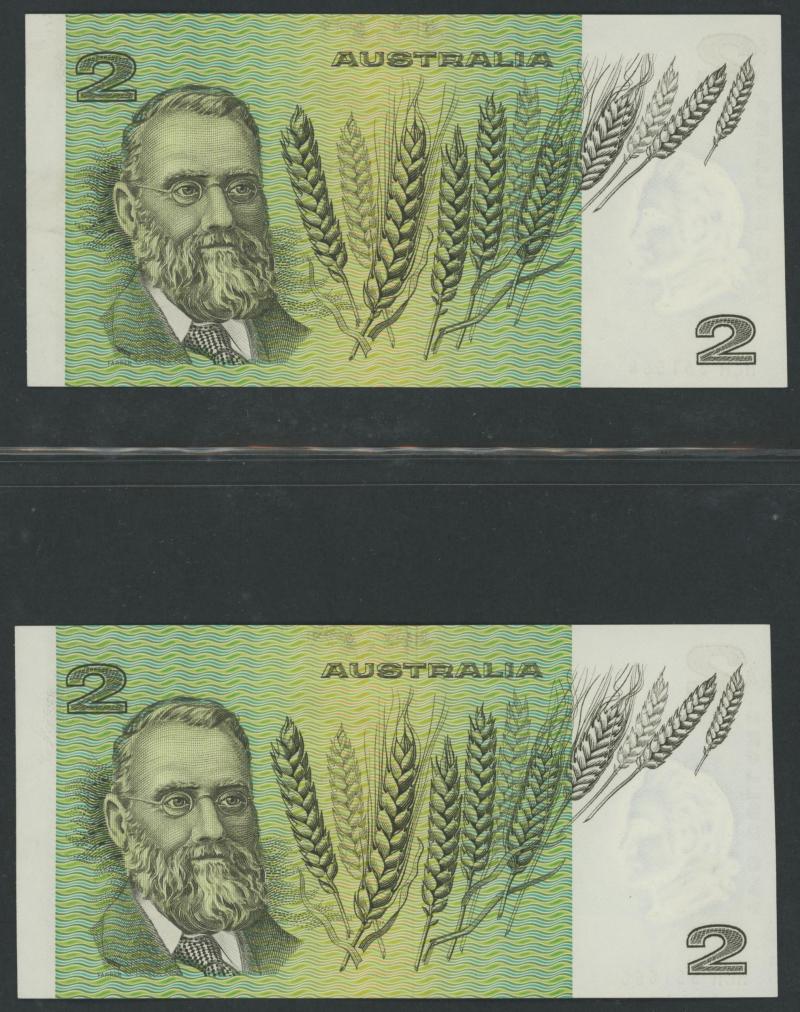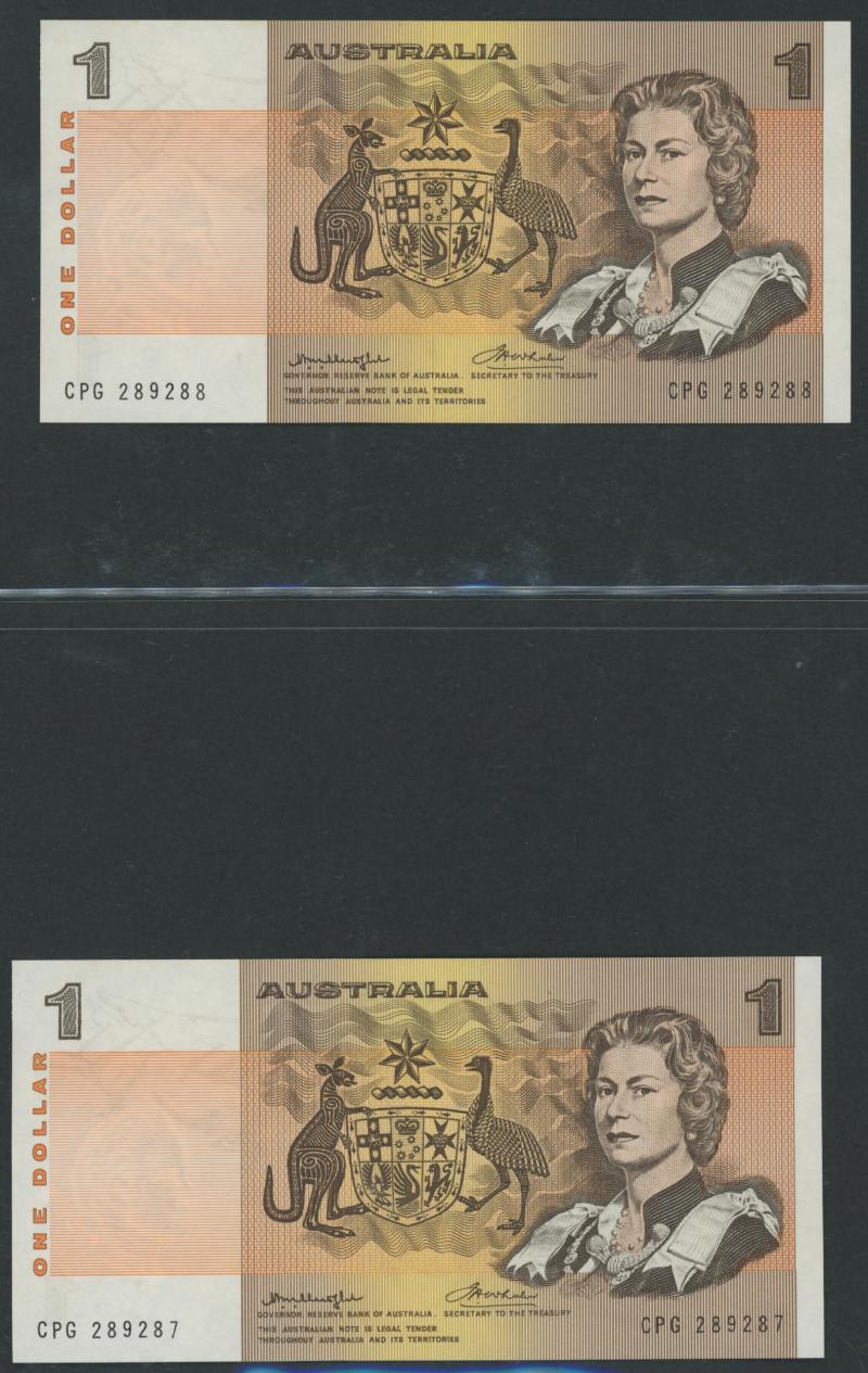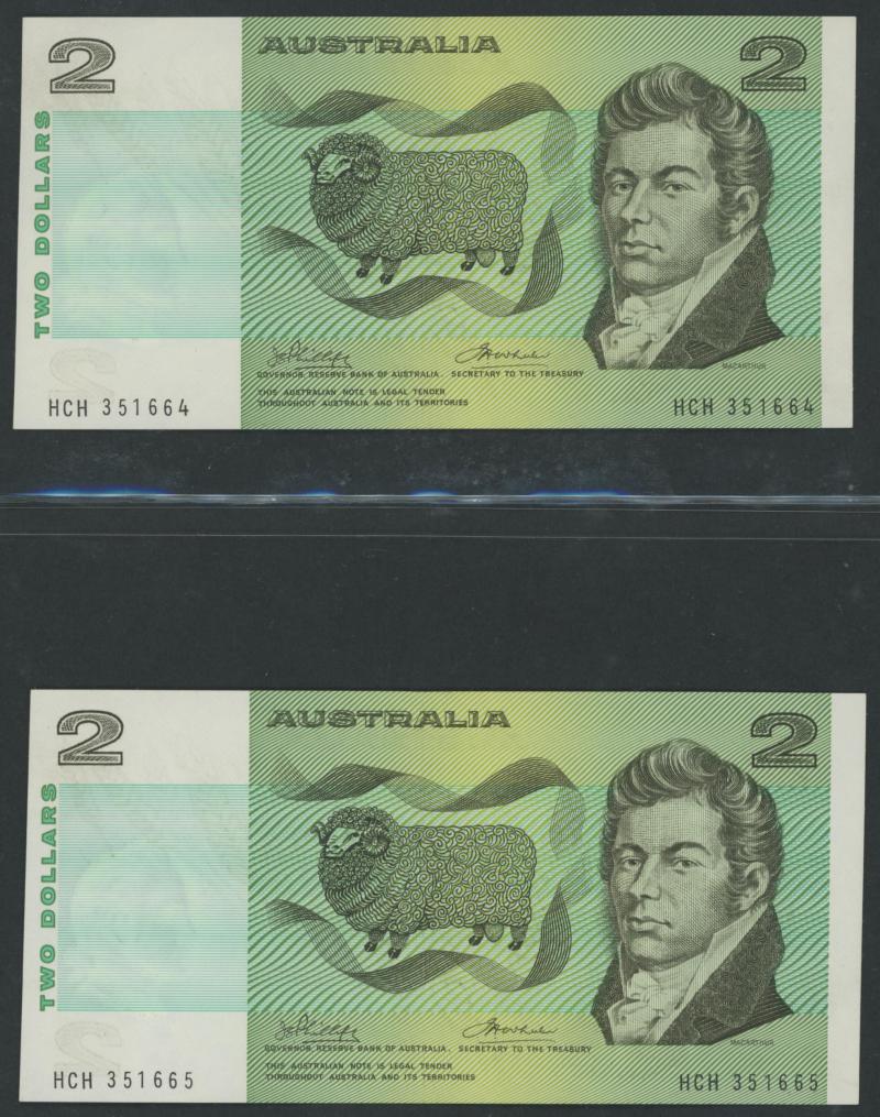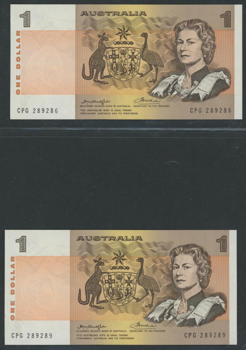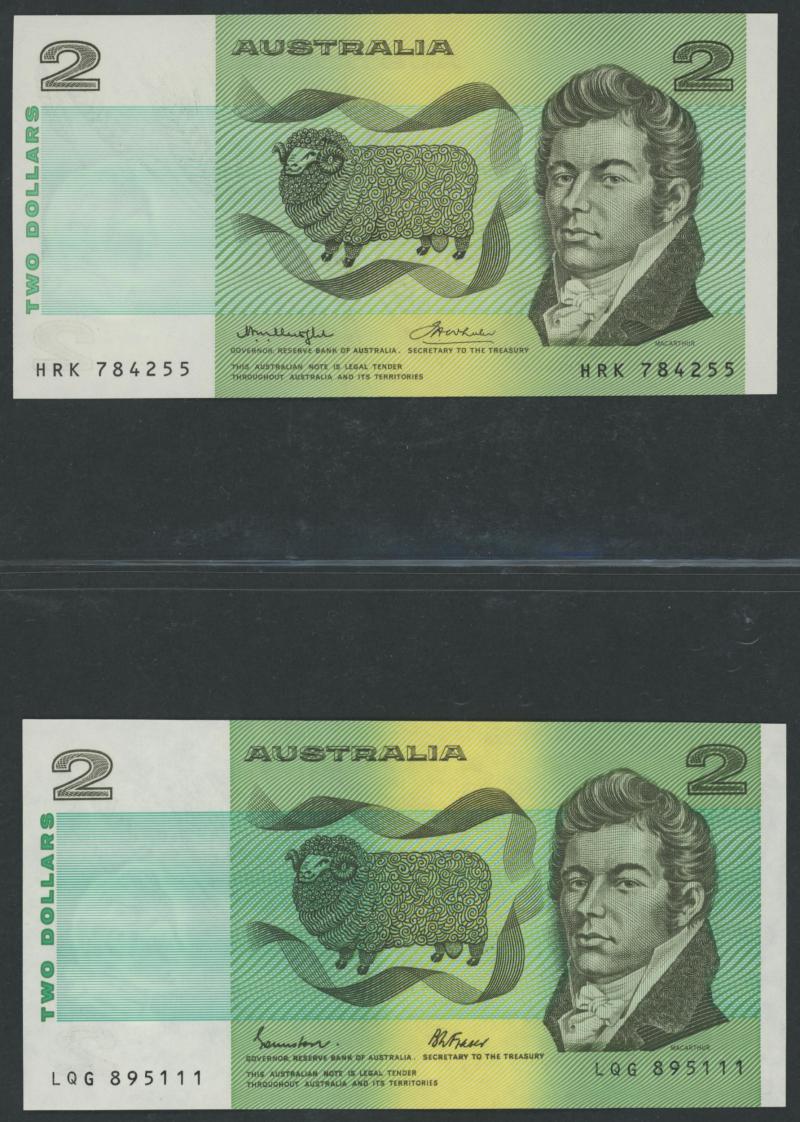 3257 imagePaper note collection in Lighthouse album with slipcase comprising $1 (10) including 1982 Johnston/Stone R78L Last Prefix 'DPS'; $2 (7) including Phillips/Wheeler 1972 R84 'COMMONWEALTH' x2, 1974 R85 'AUSTRALIA' x2; $5 (15) including 1967 Coombs/Randall R202, 1974 Phillips/Wheeler 'AUSTRALIA' R205, 1976 Knight/Wheeler R216 Gothic and OCR-B serials; $10 (9) including 1966 Coombs/Wilson R301, 1991 Fraser/Cole R313aL Last Prefix 'MRR' With Plate Letter, R313bL Last Prefix 'MRR' Without Plate Letter; $20 (6) including 1966 Coombs/Wilson R401, 1991 Fraser/Cole R413i Prefix 'AAA' (NPA issue); $50 1985 Johnston/Fraser Gothic Serial R509a, 1993 Fraser/Evans R515 consecutive run of four; and $100 1992 Fraser/Cole R613; condition variable, virtually all Uncirculated. (53) (Image1) (Image2) (Image3) (Image4) (Image5) (Image6) (Image7) (Image8) (Image9) (Image10) (Image11) (Image12) (Image13) (Image14) (Image15) (Image16) (Image17) (Image18) (Image19) (Image20) (Image21) (Image22) (Image23) (Image24) (Image25) (Image26) (Image27) (Image28) (Image29) (Image30) (Image31) (Image32) (Image33) (Image34) (Image35) (Image36) (Image37) (Image38) (Image39) (Image40) (Image41) (Image42) (Image43) (Image44) (Image45) (Image46) (Image47) (Image48) (Image49) (Image50) (Image51) (Image52) (Image53) (Image54) (Image55) (Image56)