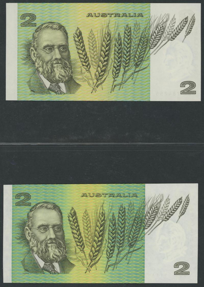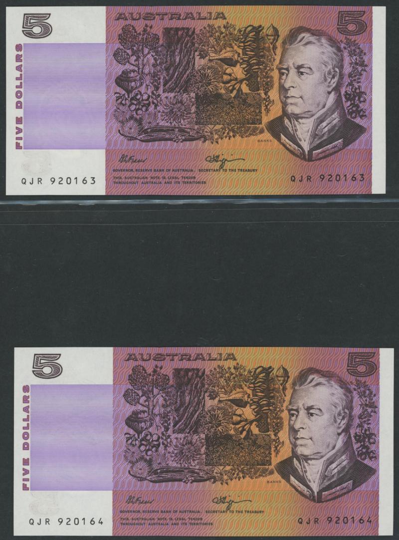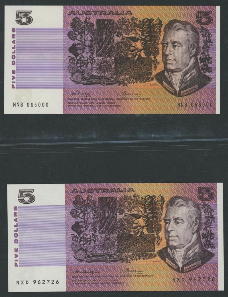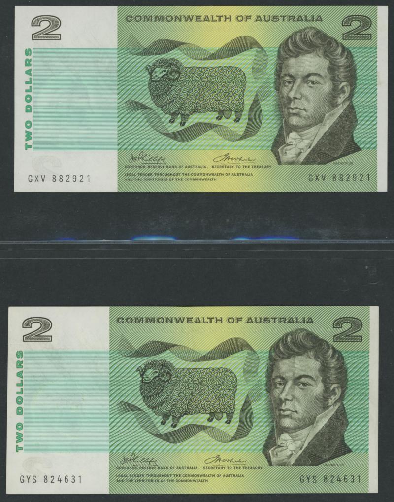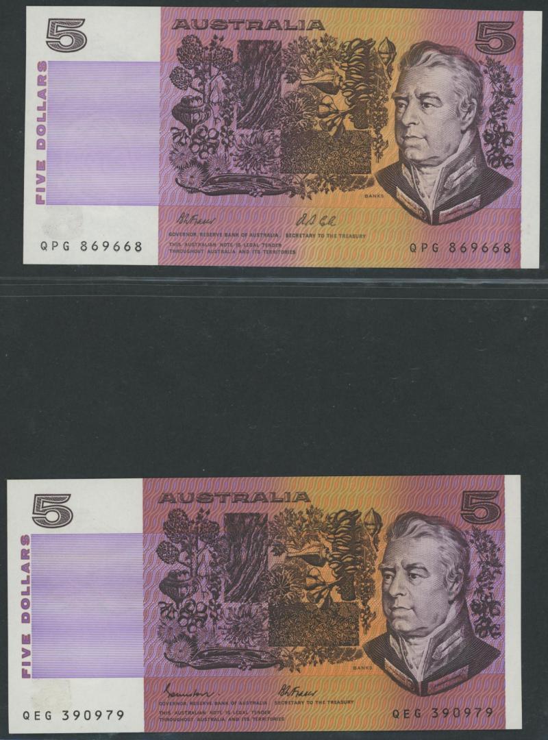 3257 imagePaper note collection in Lighthouse album with slipcase comprising $1 (10) including 1982 Johnston/Stone R78L Last Prefix 'DPS'; $2 (7) including Phillips/Wheeler 1972 R84 'COMMONWEALTH' x2, 1974 R85 'AUSTRALIA' x2; $5 (15) including 1967 Coombs/Randall R202, 1974 Phillips/Wheeler 'AUSTRALIA' R205, 1976 Knight/Wheeler R216 Gothic and OCR-B serials; $10 (9) including 1966 Coombs/Wilson R301, 1991 Fraser/Cole R313aL Last Prefix 'MRR' With Plate Letter, R313bL Last Prefix 'MRR' Without Plate Letter; $20 (6) including 1966 Coombs/Wilson R401, 1991 Fraser/Cole R413i Prefix 'AAA' (NPA issue); $50 1985 Johnston/Fraser Gothic Serial R509a, 1993 Fraser/Evans R515 consecutive run of four; and $100 1992 Fraser/Cole R613; condition variable, virtually all Uncirculated. (53) (Image1) (Image2) (Image3) (Image4) (Image5) (Image6) (Image7) (Image8) (Image9) (Image10) (Image11) (Image12) (Image13) (Image14) (Image15) (Image16) (Image17) (Image18) (Image19) (Image20) (Image21) (Image22) (Image23) (Image24) (Image25) (Image26) (Image27) (Image28) (Image29) (Image30) (Image31) (Image32) (Image33) (Image34) (Image35) (Image36) (Image37) (Image38) (Image39) (Image40) (Image41) (Image42) (Image43) (Image44) (Image45) (Image46) (Image47) (Image48) (Image49) (Image50) (Image51) (Image52) (Image53) (Image54) (Image55) (Image56)