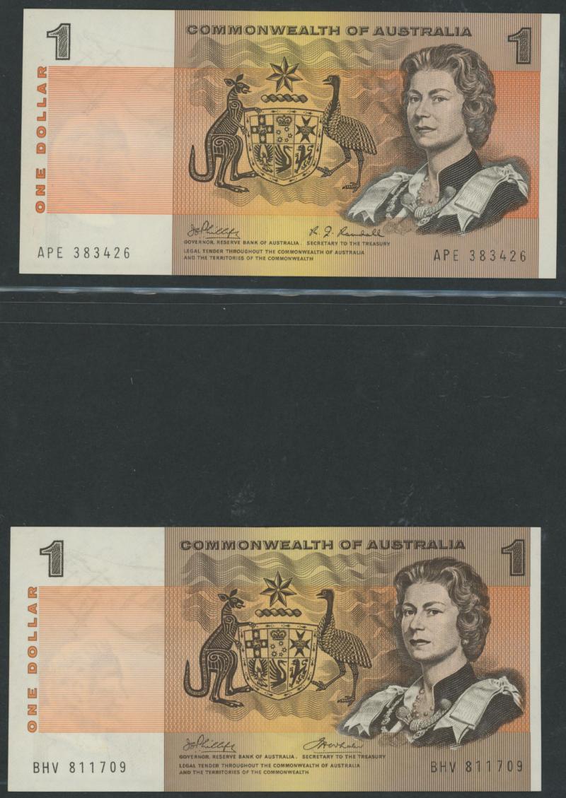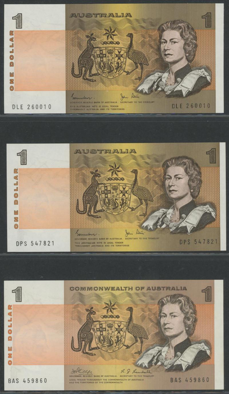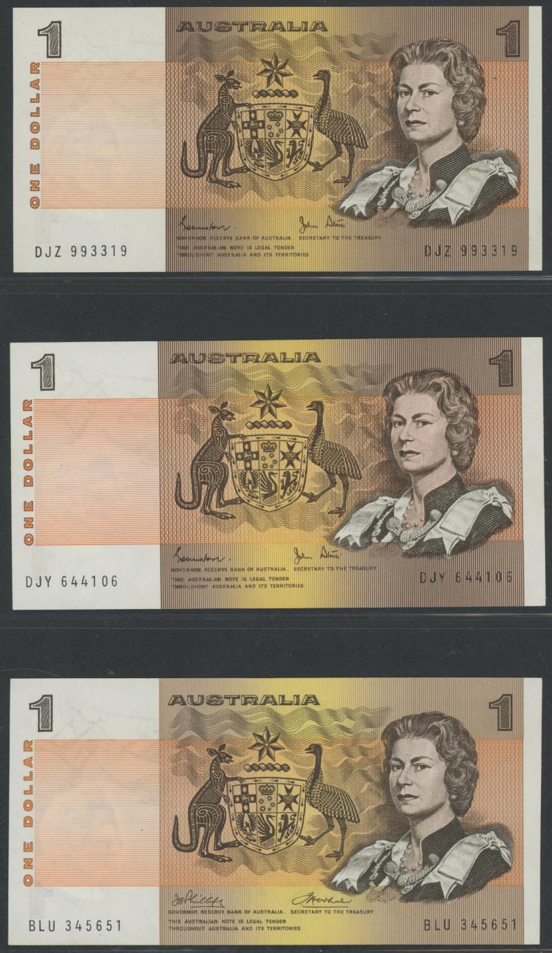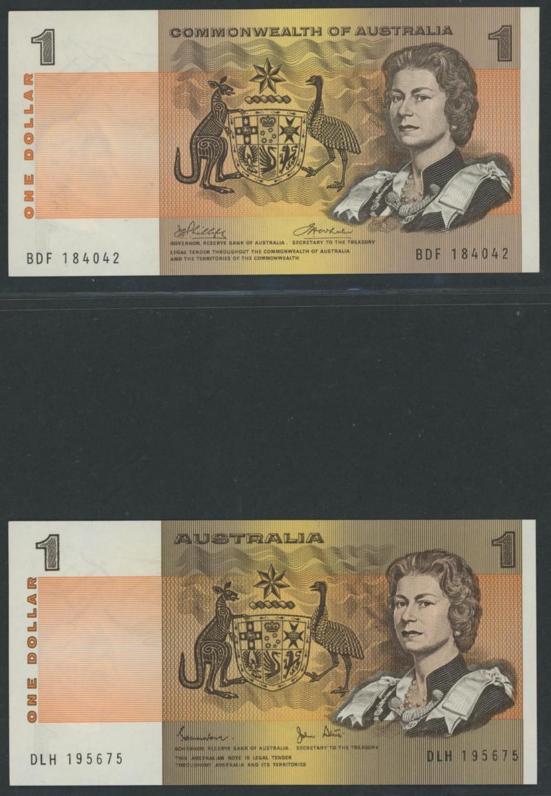 3261 image1966-1968 $1 to $100 paper collection mostly in Lighthouse Vario sleeves with $1 (x70) including 1969 Phillips/Randall R73 (Unc), 1972-74 Phillips/Wheeler 'COMMONWEALTH' & 'AUSTRALIA' R74-75 (Unc), 1976 Knight/Wheeler Centre Thread, and Side Thread R76a&c, 1982 Johston/Stone R78L Last Prefix 'DPS' (Unc); $2 (x67) 1966 Coombs/Wilson R81 (11) with run of ten (pay-packet bend/folds), 1976 Knight/Wheeler OCR-B Centre Thread R86b run of four (light centre folds), 1985 Johnston/Fraser R89 run of twenty-nine; $5 (x34) 1979 Knight/Stone R207 (12) with run of ten (centre folds), 1990 Fraser/Higgins R212 run of ten (centre bends); $10 (x4 circulated); $20 1991 Fraser/Cole R413 (Unc); $50 1990 Fraser/Higgins R512 (VF); and $100 1985 Johnston/Fraser R612 (circulated); condition variable. (178) (Image1) (Image2) (Image3) (Image4) (Image5) (Image6) (Image7) (Image8)