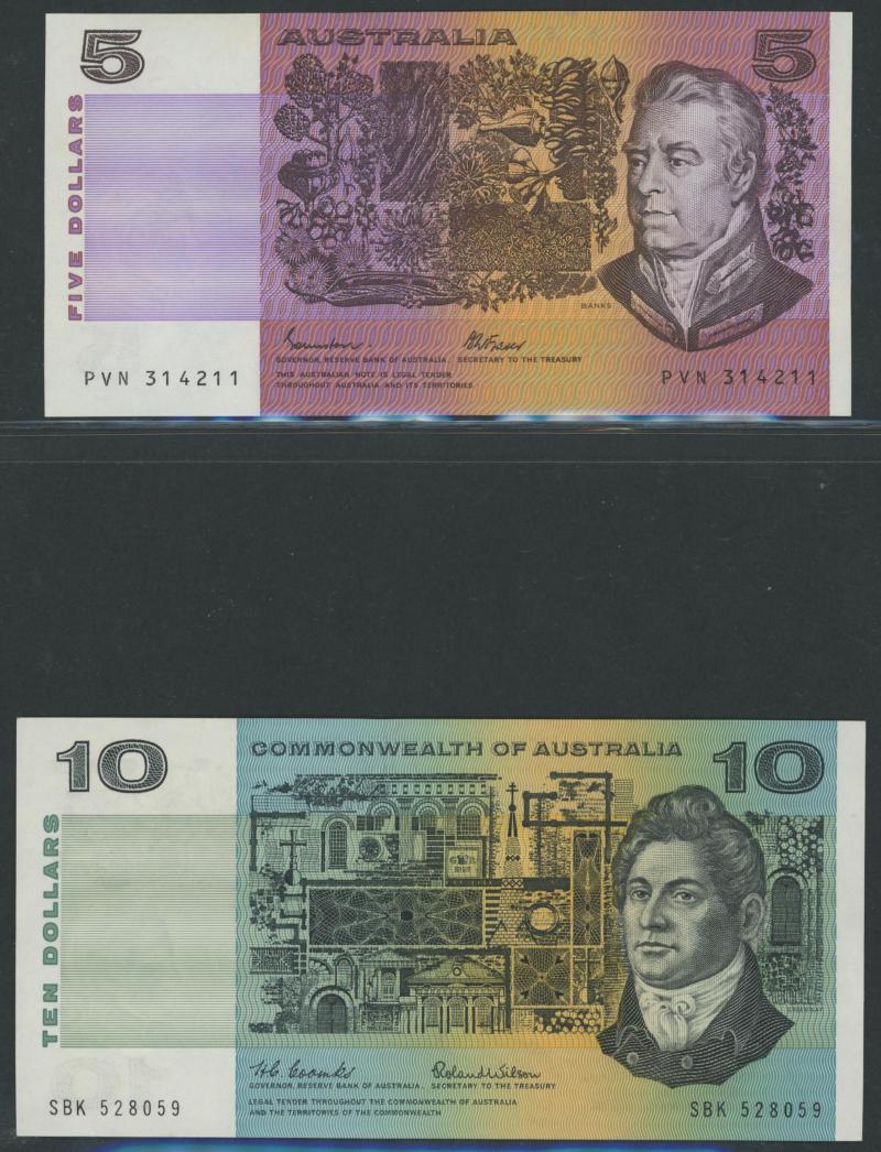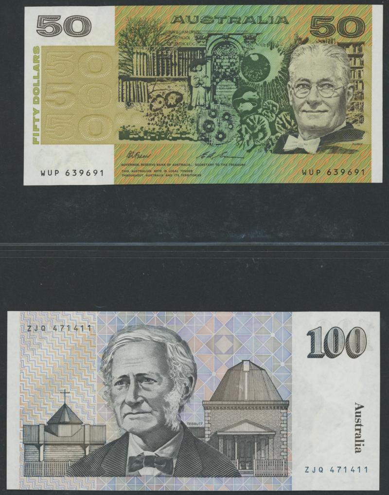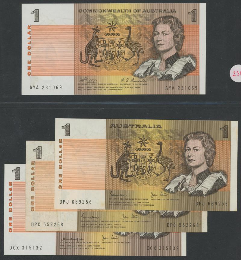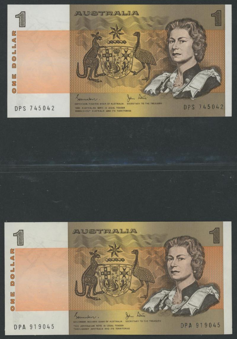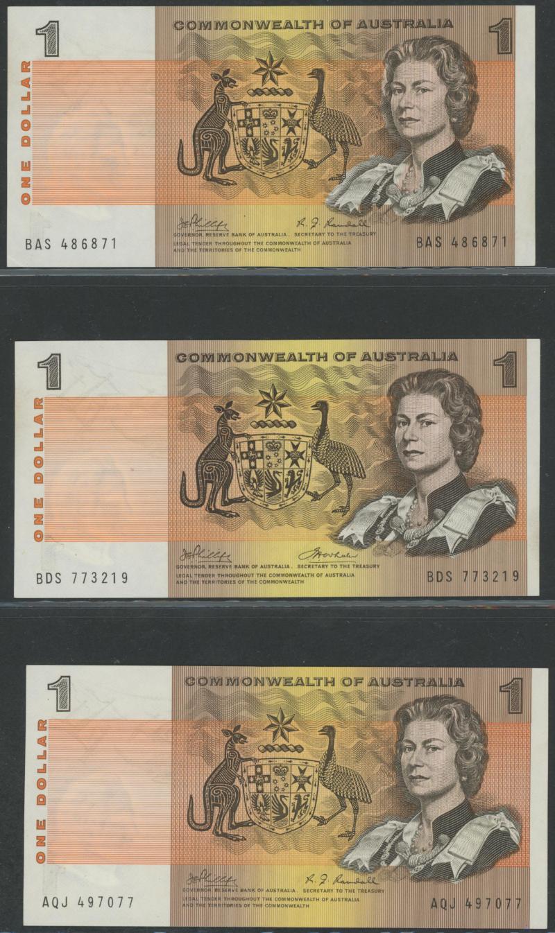 3261 image1966-1968 $1 to $100 paper collection mostly in Lighthouse Vario sleeves with $1 (x70) including 1969 Phillips/Randall R73 (Unc), 1972-74 Phillips/Wheeler 'COMMONWEALTH' & 'AUSTRALIA' R74-75 (Unc), 1976 Knight/Wheeler Centre Thread, and Side Thread R76a&c, 1982 Johston/Stone R78L Last Prefix 'DPS' (Unc); $2 (x67) 1966 Coombs/Wilson R81 (11) with run of ten (pay-packet bend/folds), 1976 Knight/Wheeler OCR-B Centre Thread R86b run of four (light centre folds), 1985 Johnston/Fraser R89 run of twenty-nine; $5 (x34) 1979 Knight/Stone R207 (12) with run of ten (centre folds), 1990 Fraser/Higgins R212 run of ten (centre bends); $10 (x4 circulated); $20 1991 Fraser/Cole R413 (Unc); $50 1990 Fraser/Higgins R512 (VF); and $100 1985 Johnston/Fraser R612 (circulated); condition variable. (178) (Image1) (Image2) (Image3) (Image4) (Image5) (Image6) (Image7) (Image8)