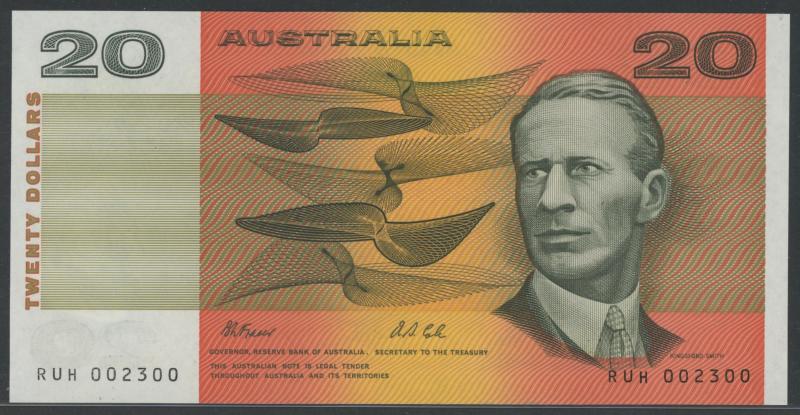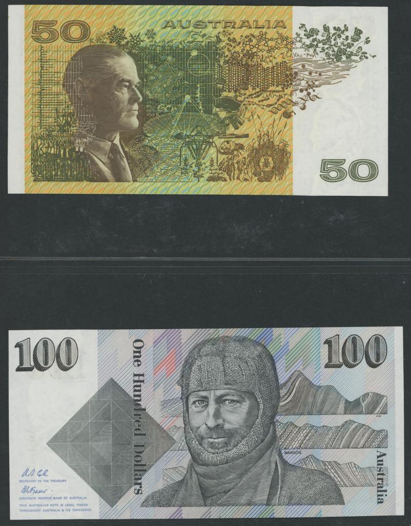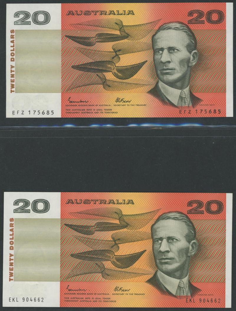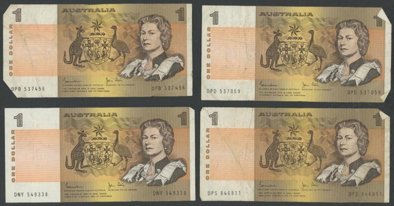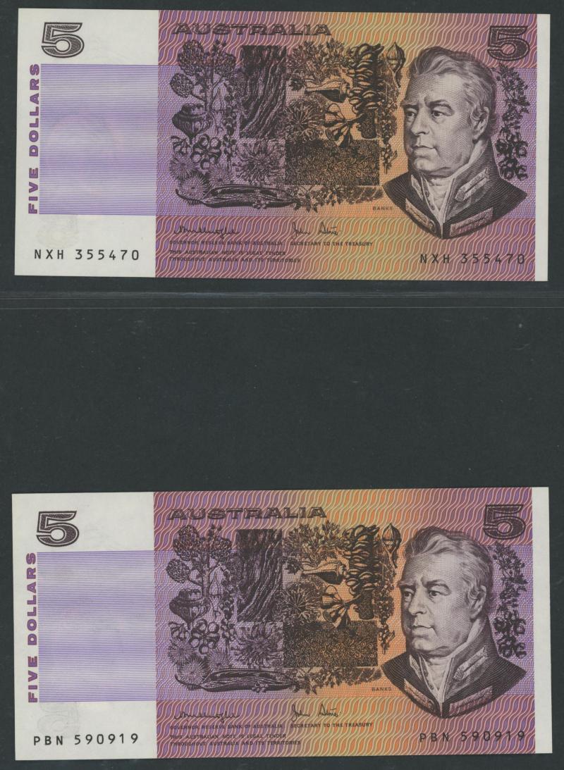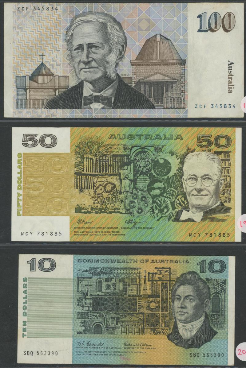 3261 image1966-1968 $1 to $100 paper collection mostly in Lighthouse Vario sleeves with $1 (x70) including 1969 Phillips/Randall R73 (Unc), 1972-74 Phillips/Wheeler 'COMMONWEALTH' & 'AUSTRALIA' R74-75 (Unc), 1976 Knight/Wheeler Centre Thread, and Side Thread R76a&c, 1982 Johston/Stone R78L Last Prefix 'DPS' (Unc); $2 (x67) 1966 Coombs/Wilson R81 (11) with run of ten (pay-packet bend/folds), 1976 Knight/Wheeler OCR-B Centre Thread R86b run of four (light centre folds), 1985 Johnston/Fraser R89 run of twenty-nine; $5 (x34) 1979 Knight/Stone R207 (12) with run of ten (centre folds), 1990 Fraser/Higgins R212 run of ten (centre bends); $10 (x4 circulated); $20 1991 Fraser/Cole R413 (Unc); $50 1990 Fraser/Higgins R512 (VF); and $100 1985 Johnston/Fraser R612 (circulated); condition variable. (178) (Image1) (Image2) (Image3) (Image4) (Image5) (Image6) (Image7) (Image8)