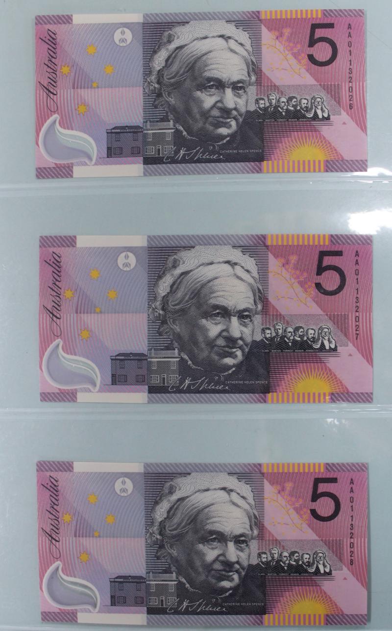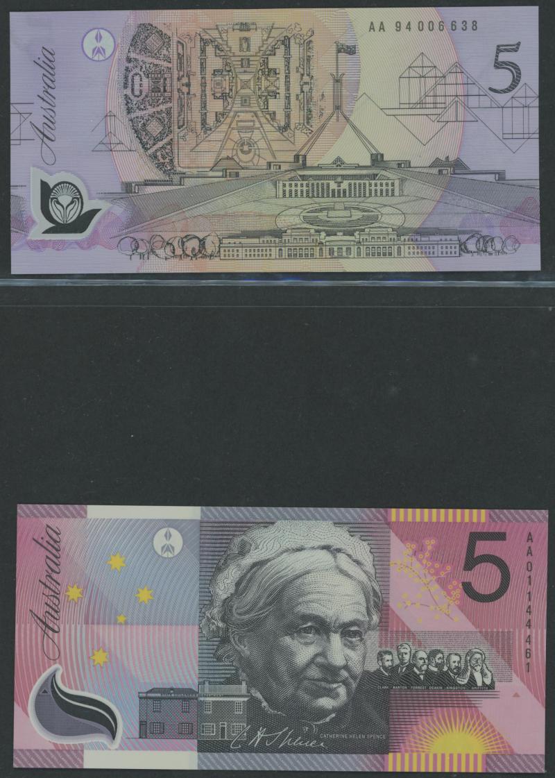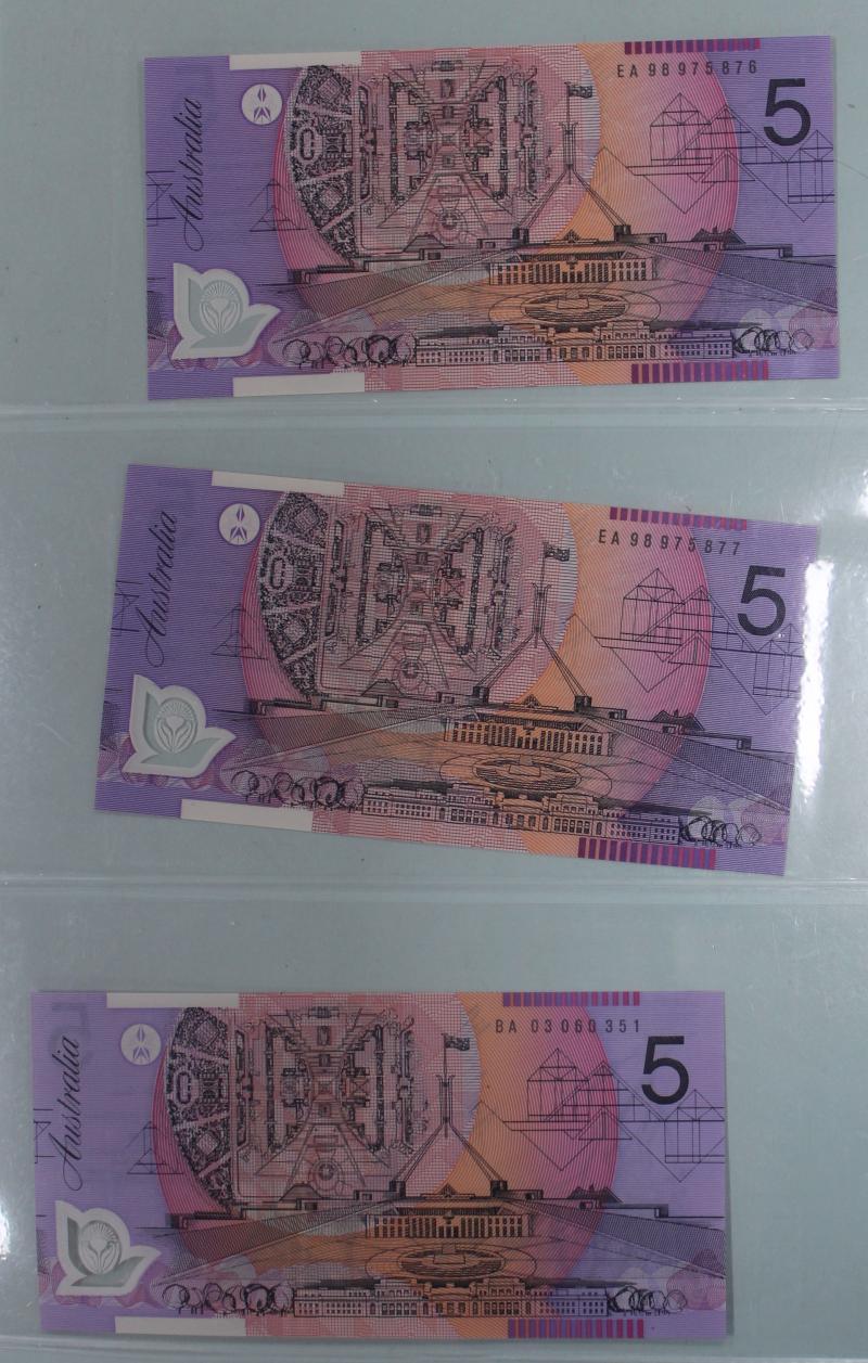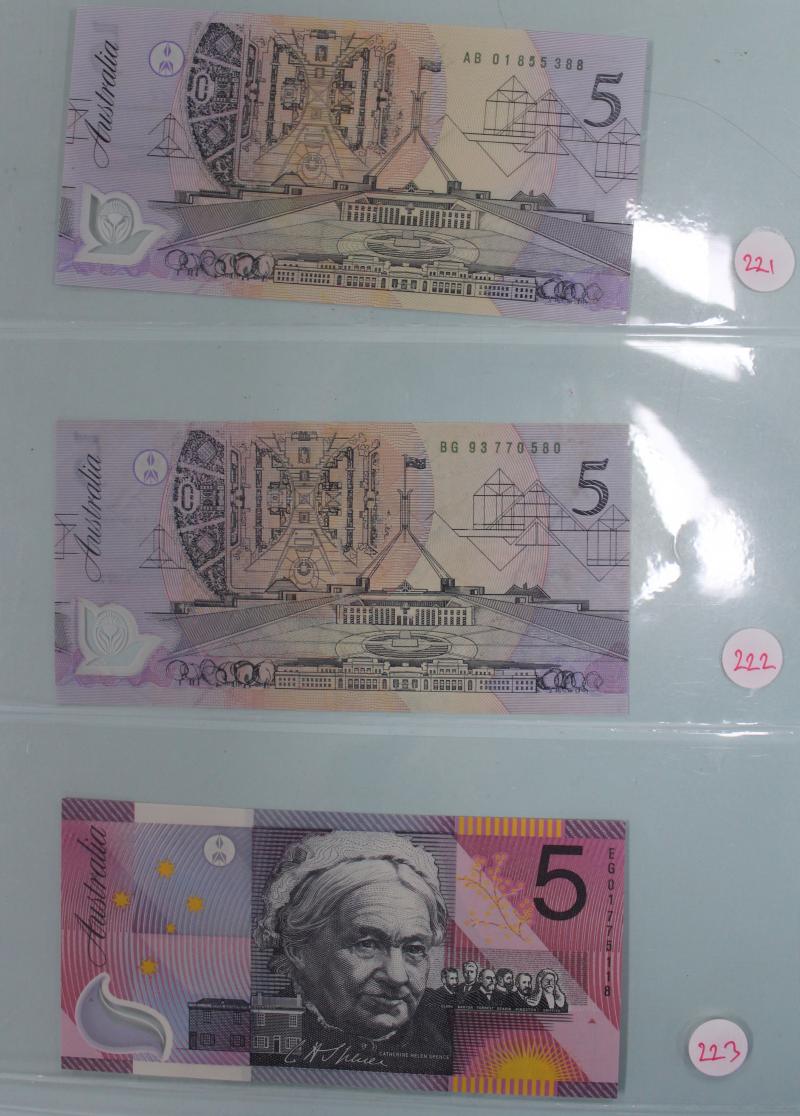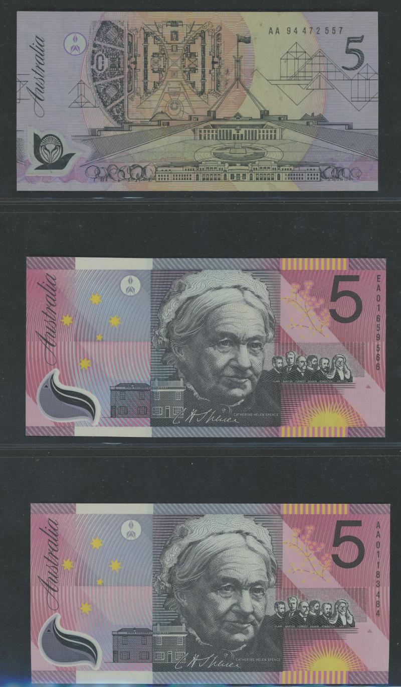 3260 imageDated polymer note collection from NPA folders (notes only) comprising $5 1992 Fraser/Cole, 1993 Fraser/Evans Last Prefix 'EA93' overprinted 'First Issued/7 July 1992'; $10 1988 Bicentenary (2), 1993 Fraser/Evans First Prefix Green Serial 'AA93 001490', and Red Serial 'DB93'; $50 1995 First Prefix 'AA95 010320'; $100 1996 First Prefix Red Serial 'AA96 000723', and First Prefix Black Serial 'AA96 005642'; all Uncirculated. (9) (Image1) (Image2) (Image3) (Image4) (Image5) (Image6) (Image7) (Image8)