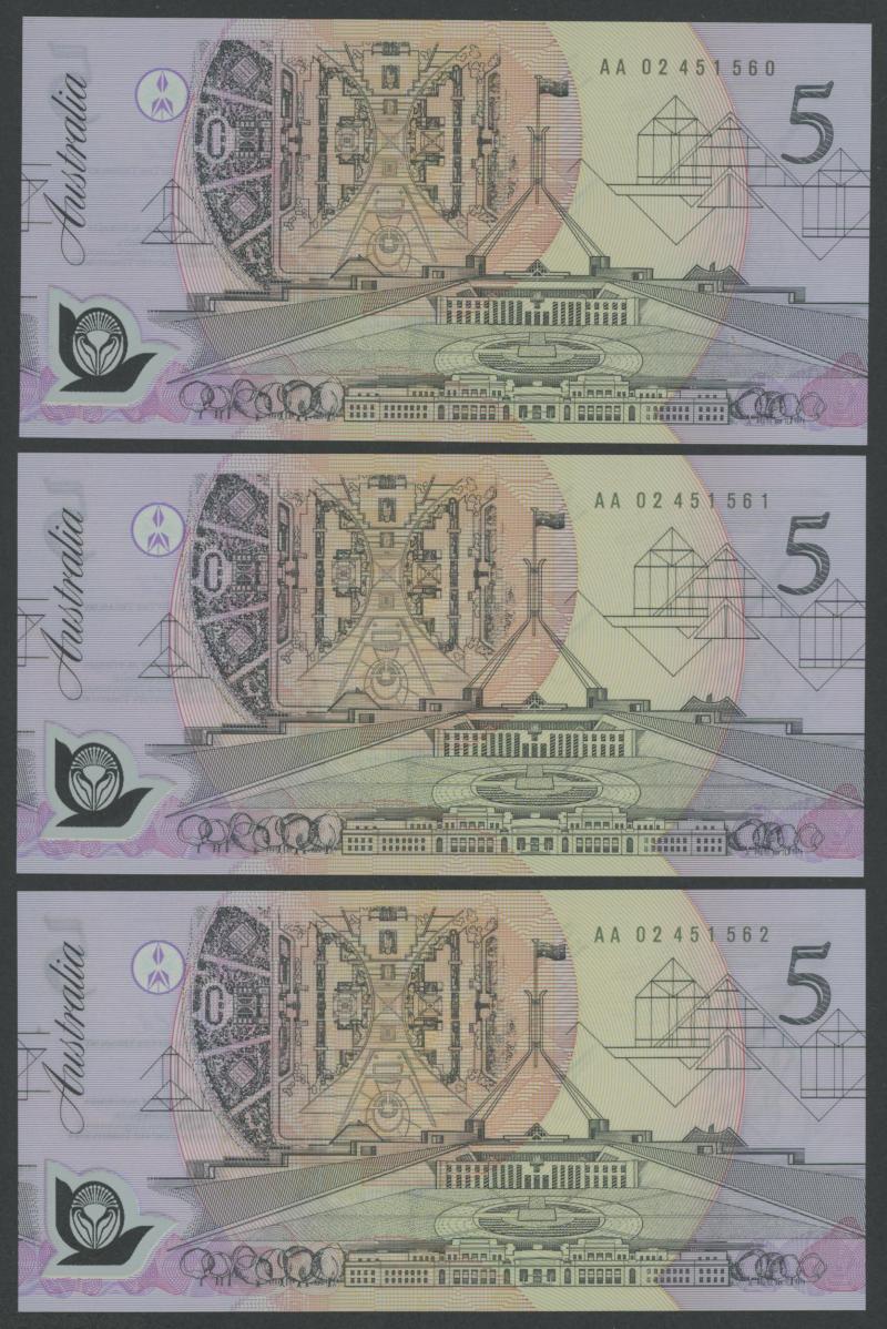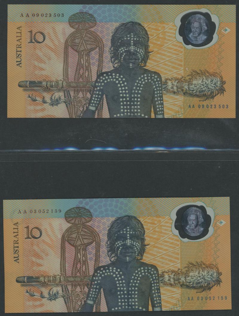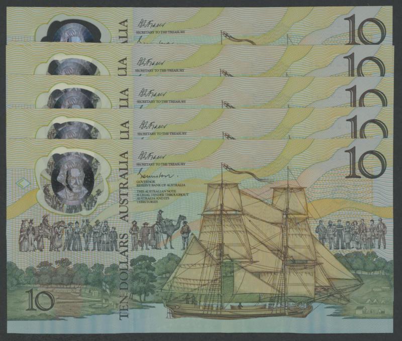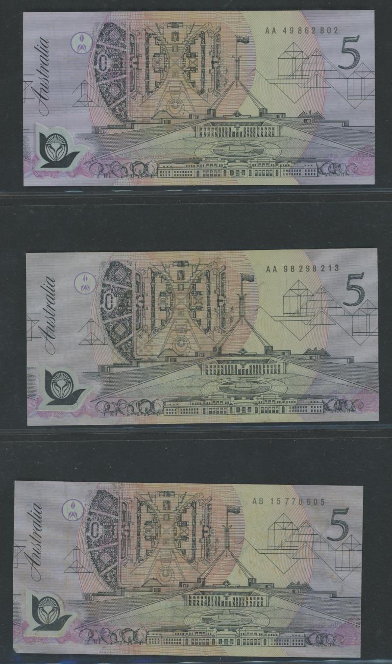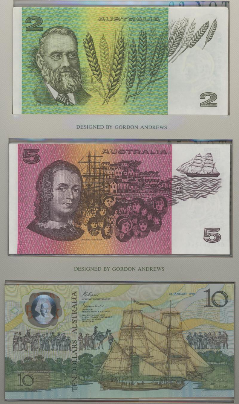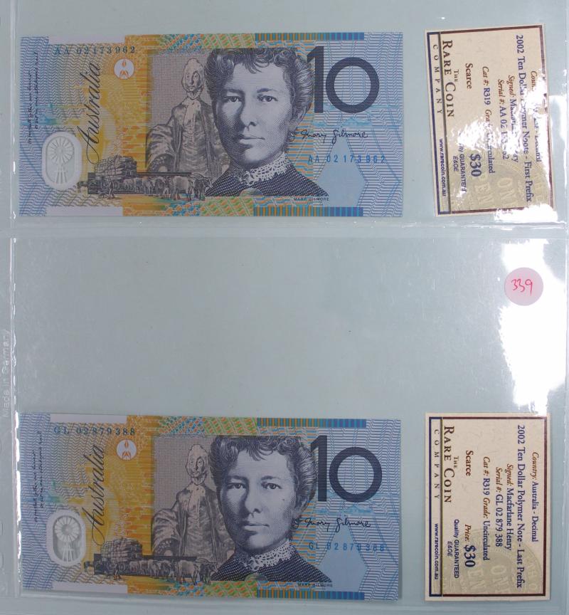 3260 imageDated polymer note collection from NPA folders (notes only) comprising $5 1992 Fraser/Cole, 1993 Fraser/Evans Last Prefix 'EA93' overprinted 'First Issued/7 July 1992'; $10 1988 Bicentenary (2), 1993 Fraser/Evans First Prefix Green Serial 'AA93 001490', and Red Serial 'DB93'; $50 1995 First Prefix 'AA95 010320'; $100 1996 First Prefix Red Serial 'AA96 000723', and First Prefix Black Serial 'AA96 005642'; all Uncirculated. (9) (Image1) (Image2) (Image3) (Image4) (Image5) (Image6) (Image7) (Image8)