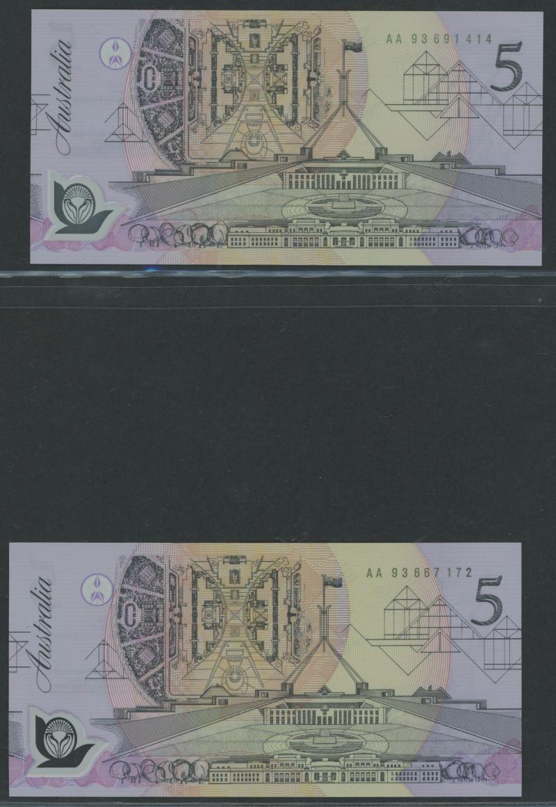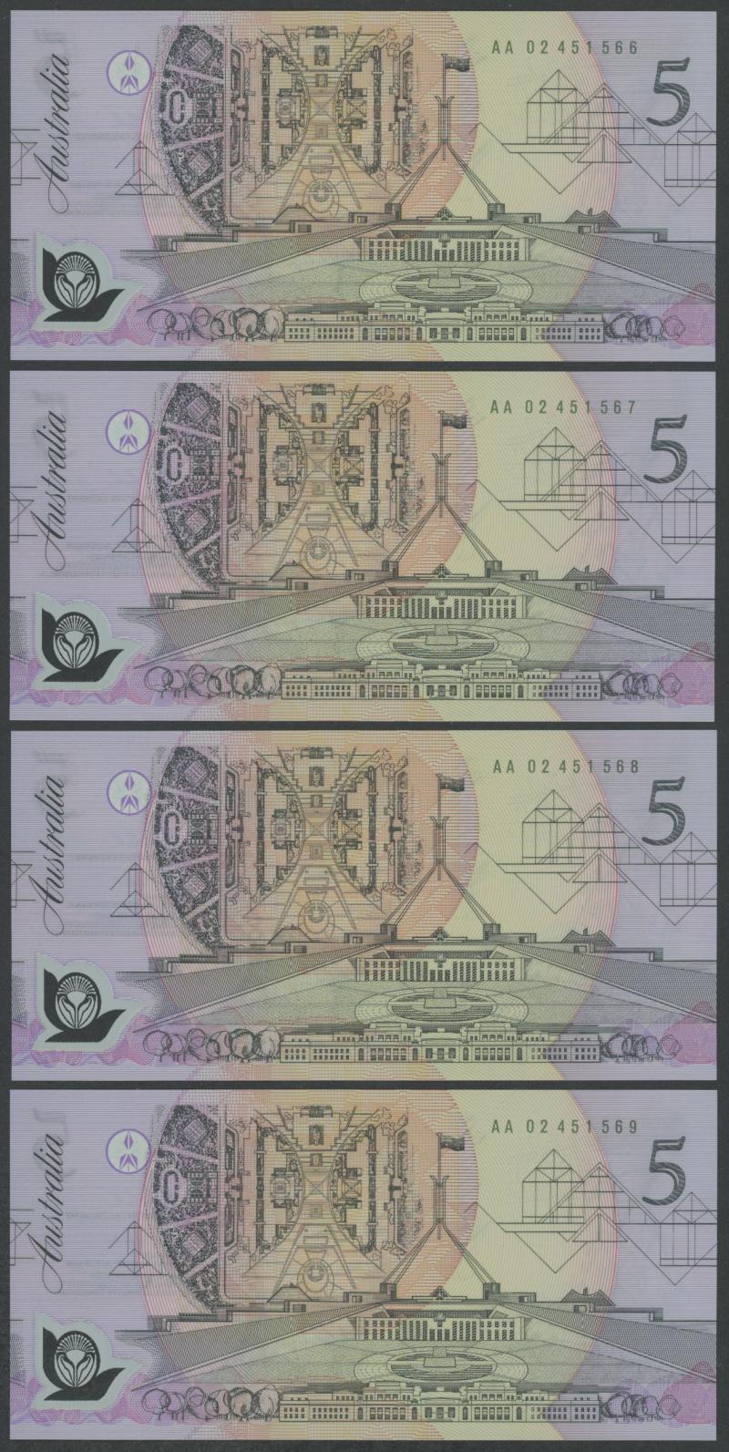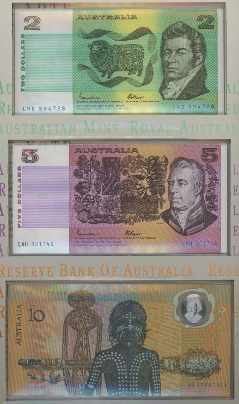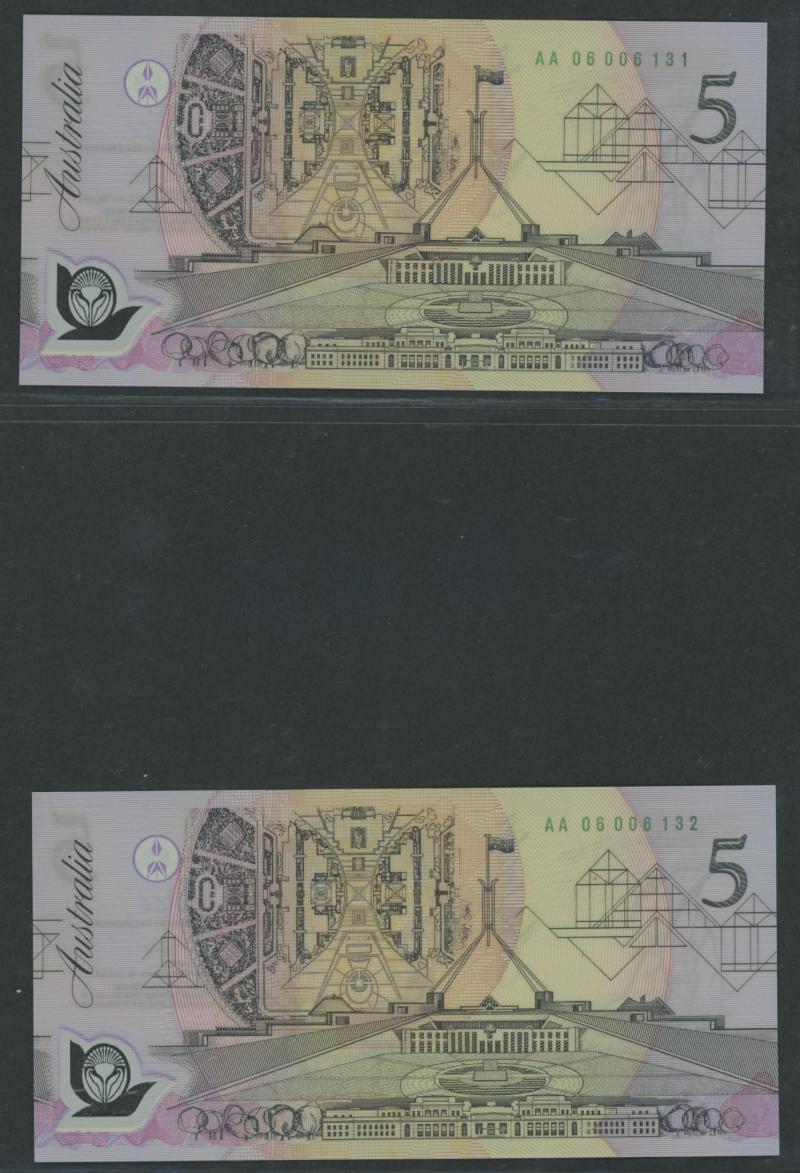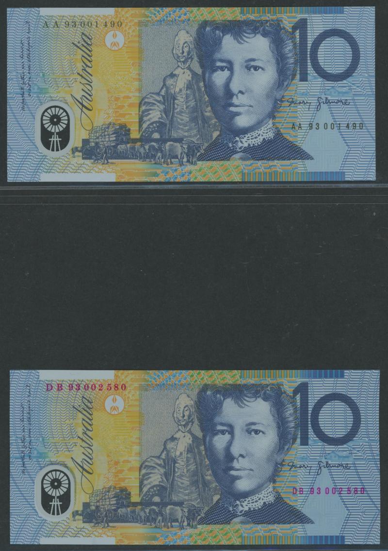 3260 imageDated polymer note collection from NPA folders (notes only) comprising $5 1992 Fraser/Cole, 1993 Fraser/Evans Last Prefix 'EA93' overprinted 'First Issued/7 July 1992'; $10 1988 Bicentenary (2), 1993 Fraser/Evans First Prefix Green Serial 'AA93 001490', and Red Serial 'DB93'; $50 1995 First Prefix 'AA95 010320'; $100 1996 First Prefix Red Serial 'AA96 000723', and First Prefix Black Serial 'AA96 005642'; all Uncirculated. (9) (Image1) (Image2) (Image3) (Image4) (Image5) (Image6) (Image7) (Image8)