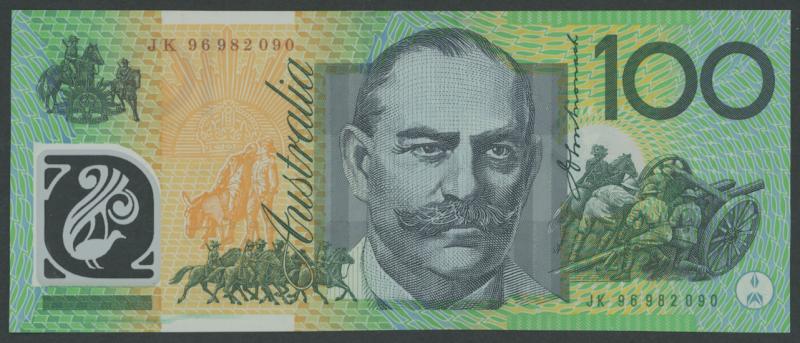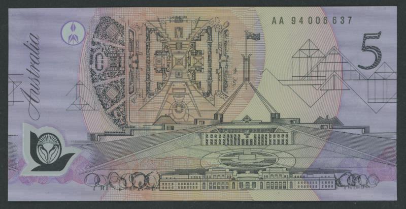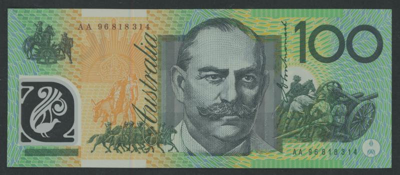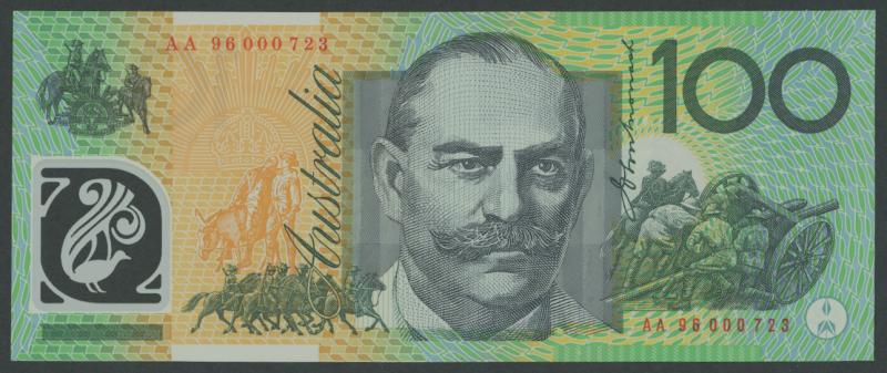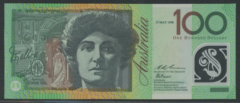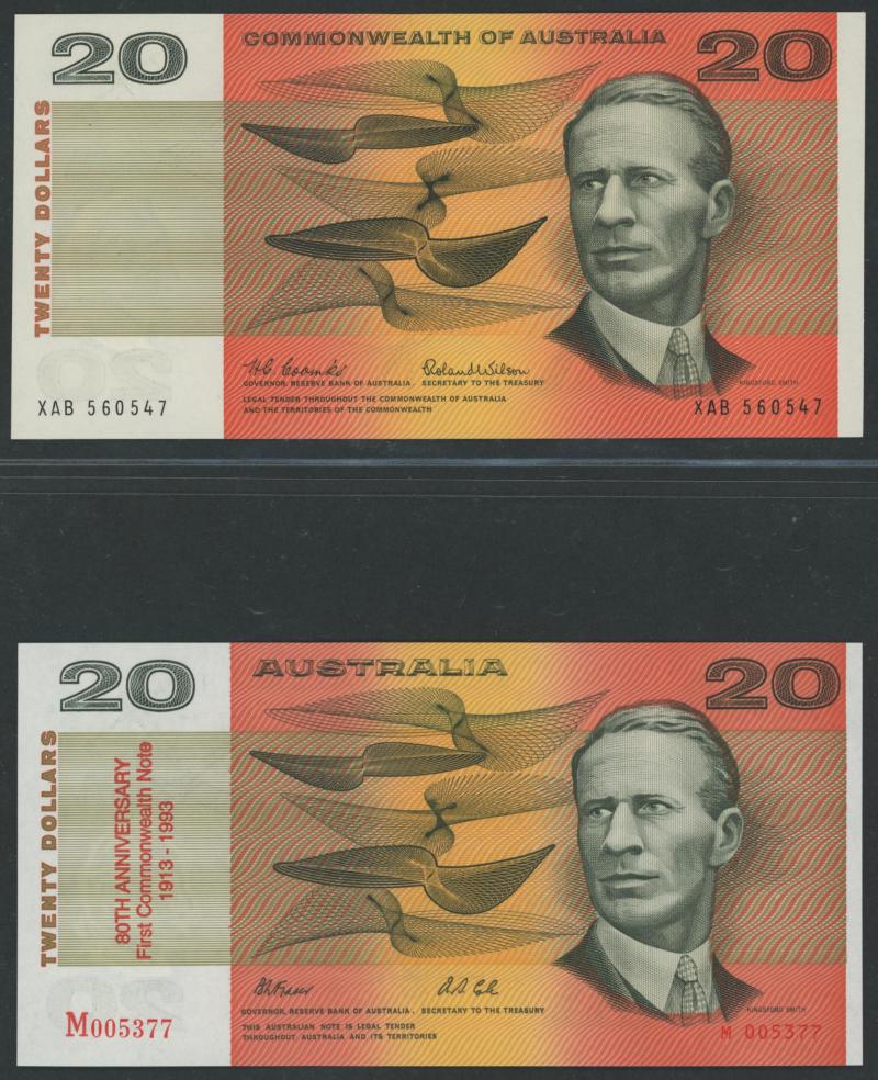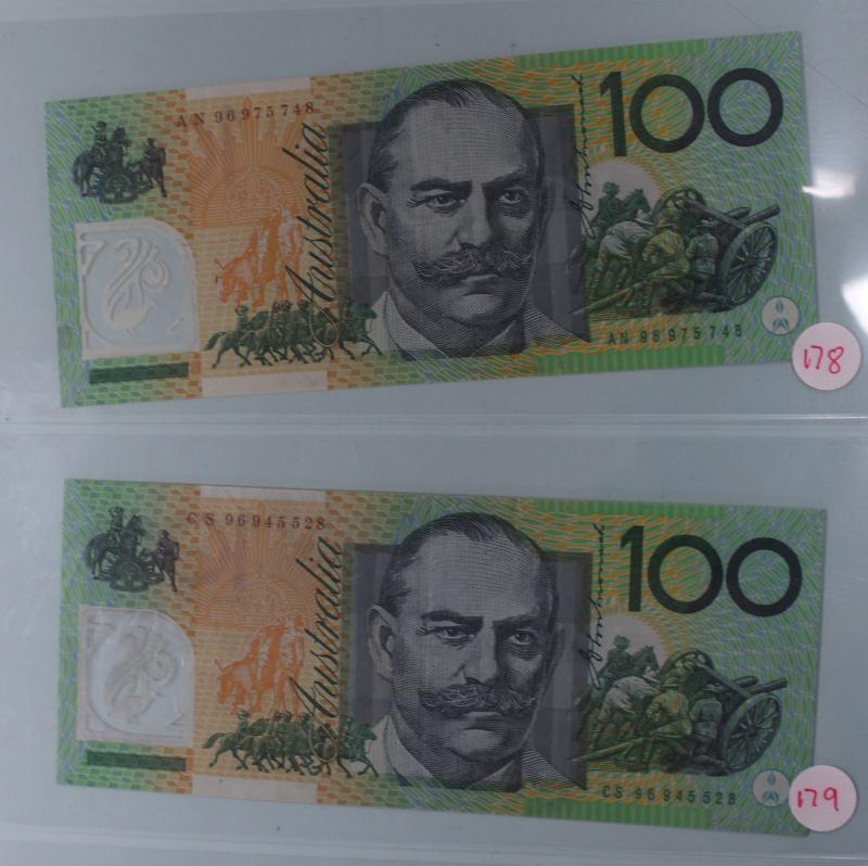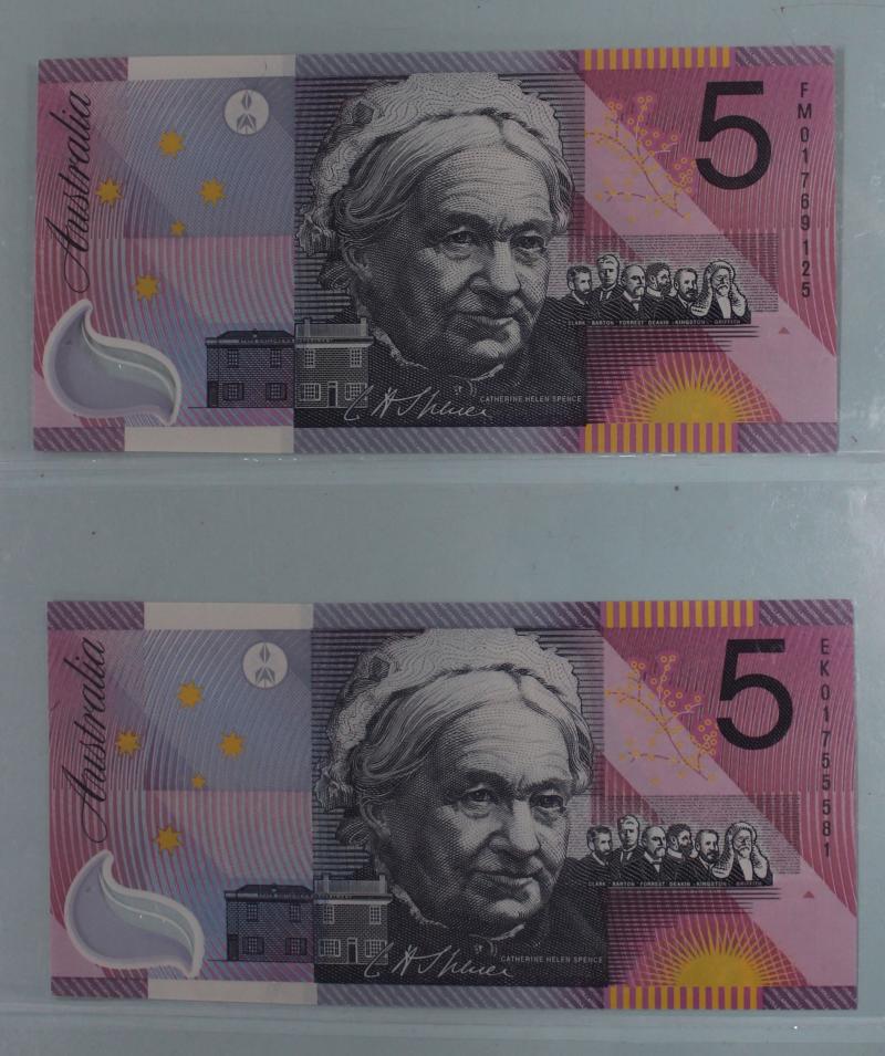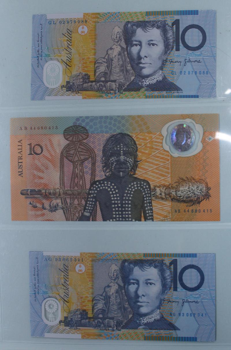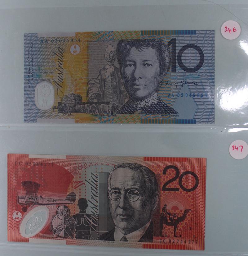 3260 imageDated polymer note collection from NPA folders (notes only) comprising $5 1992 Fraser/Cole, 1993 Fraser/Evans Last Prefix 'EA93' overprinted 'First Issued/7 July 1992'; $10 1988 Bicentenary (2), 1993 Fraser/Evans First Prefix Green Serial 'AA93 001490', and Red Serial 'DB93'; $50 1995 First Prefix 'AA95 010320'; $100 1996 First Prefix Red Serial 'AA96 000723', and First Prefix Black Serial 'AA96 005642'; all Uncirculated. (9) (Image1) (Image2) (Image3) (Image4) (Image5) (Image6) (Image7) (Image8)
