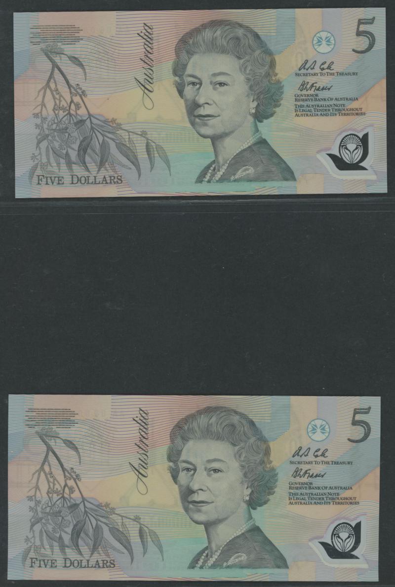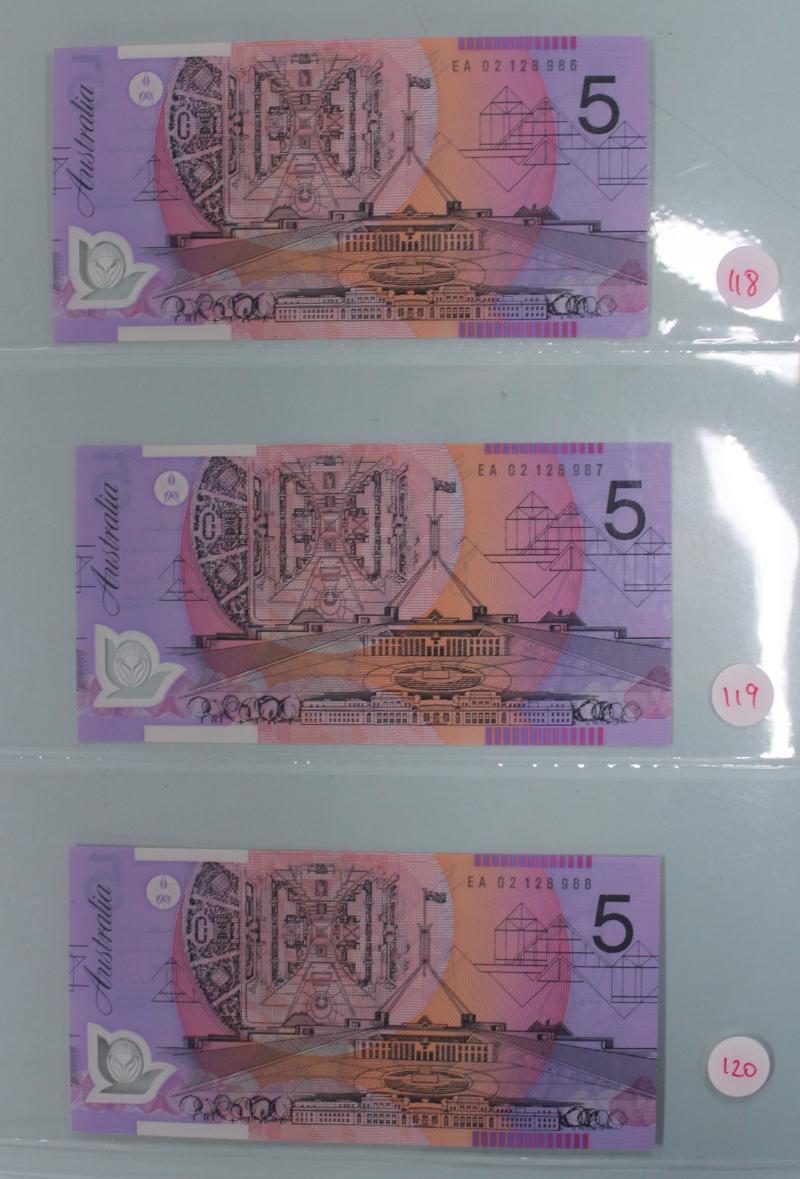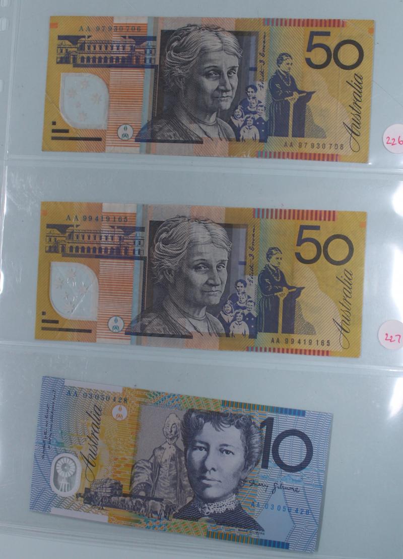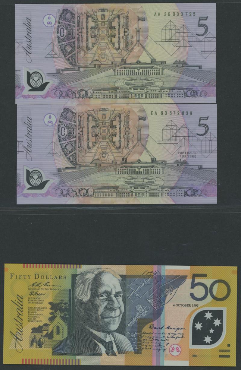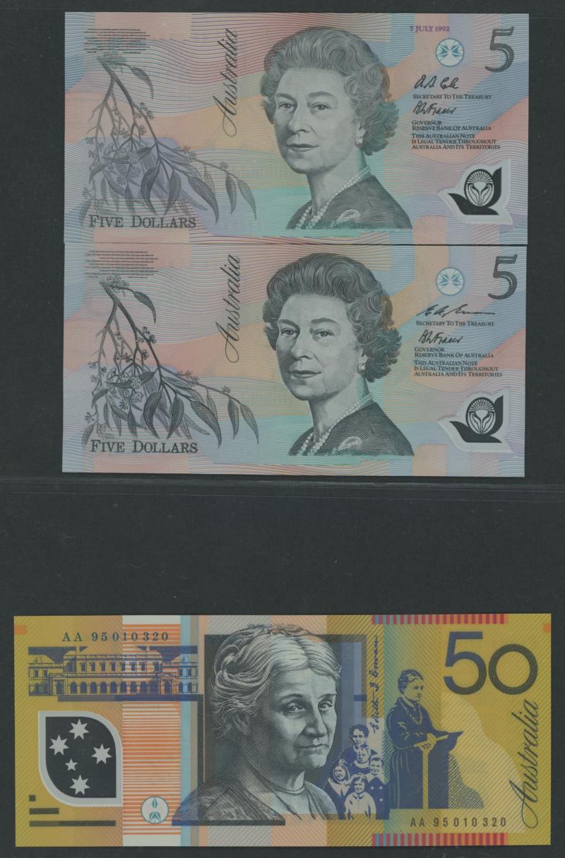 3256 imageRemainder group comprising 1992 $5 Fraser/Cole R214 consecutive run of ten serials 'AA02 541560'-'569' (Unc, Cat $500); and NPA 1995 $50 dated folder note serial 'AA95 009458' (Unc). (11) (Image1) (Image2) (Image3) (Image4)