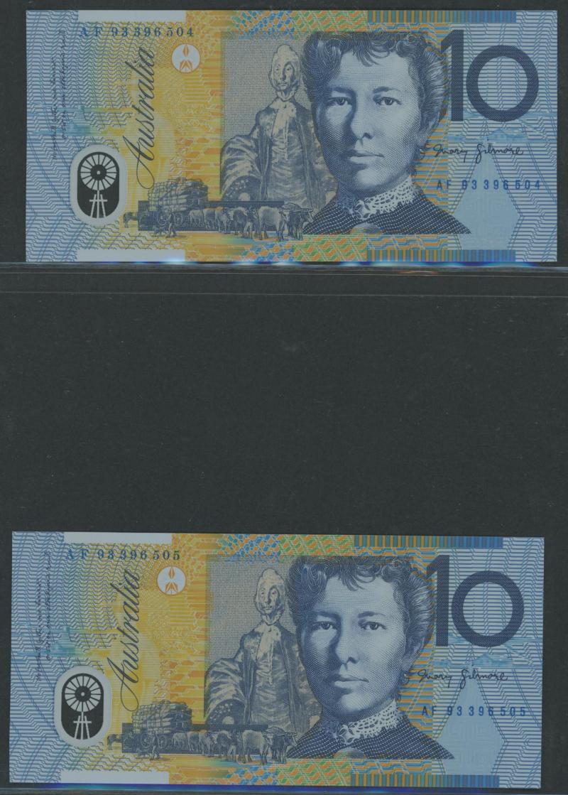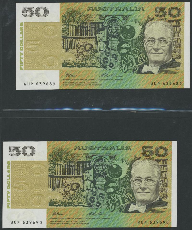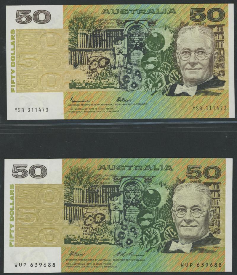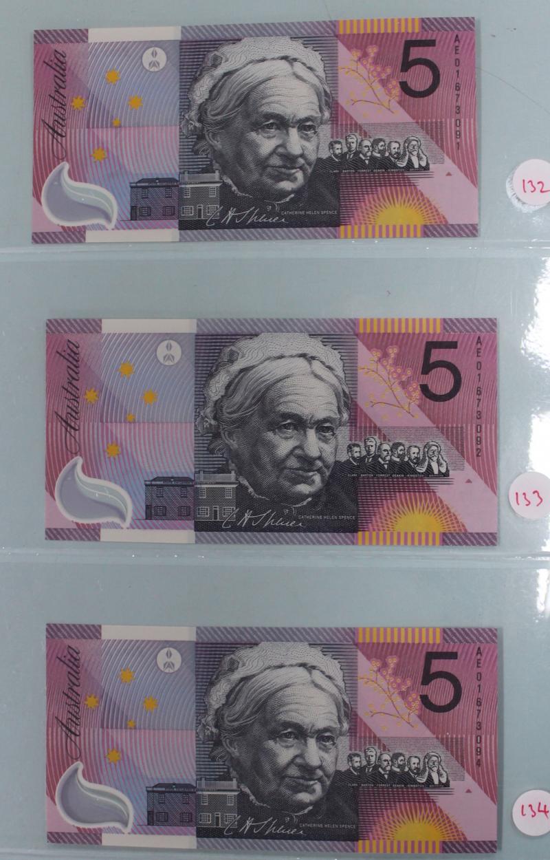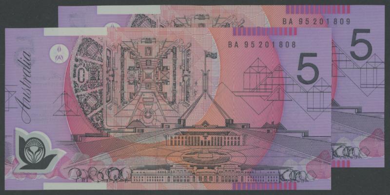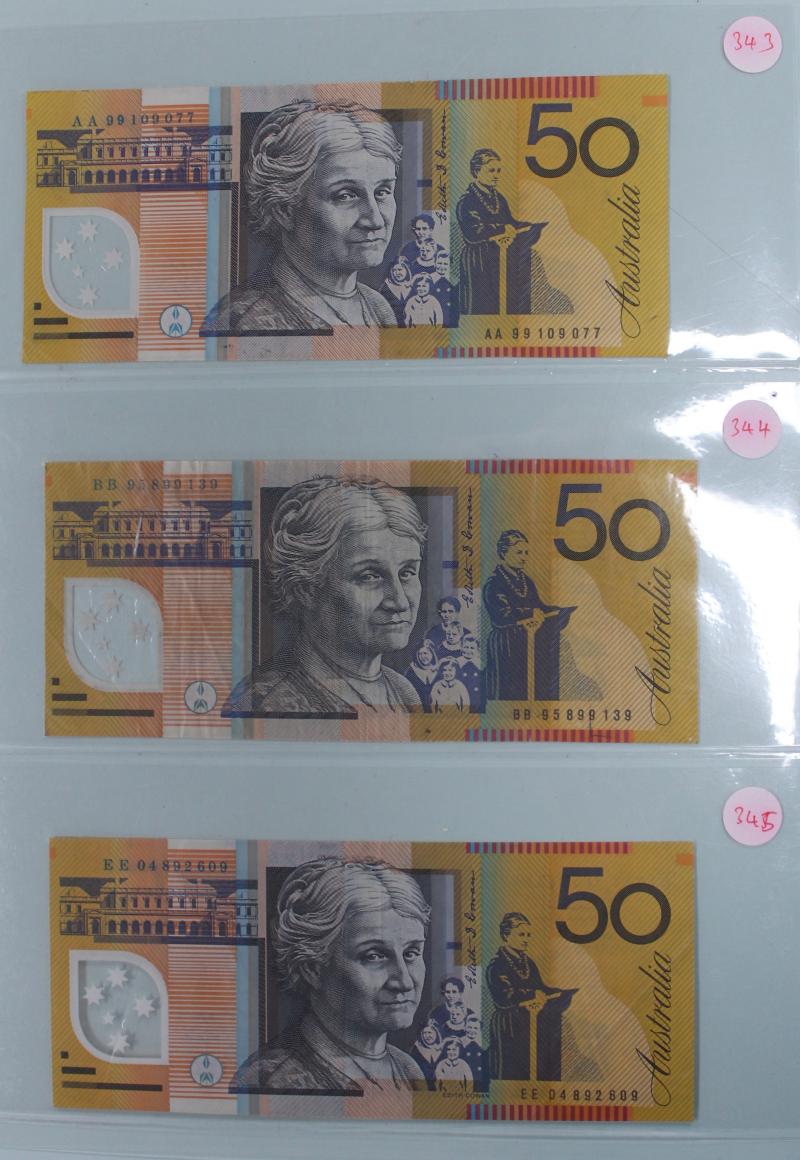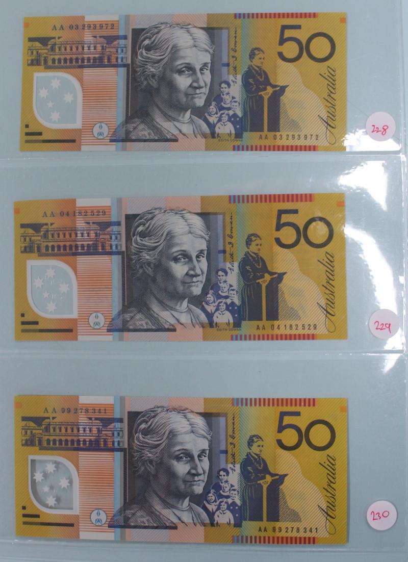 3256 imageRemainder group comprising 1992 $5 Fraser/Cole R214 consecutive run of ten serials 'AA02 541560'-'569' (Unc, Cat $500); and NPA 1995 $50 dated folder note serial 'AA95 009458' (Unc). (11) (Image1) (Image2) (Image3) (Image4)