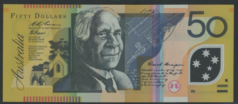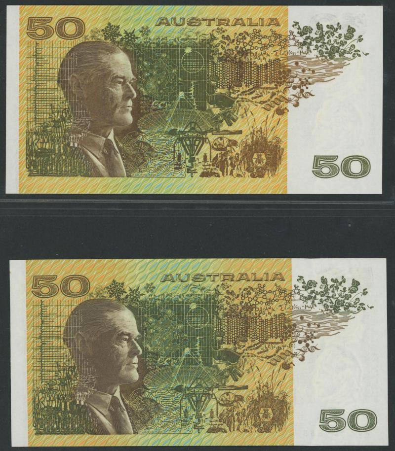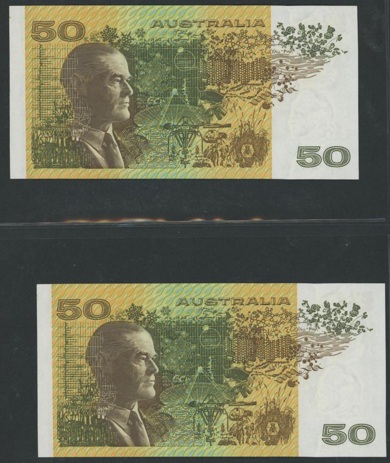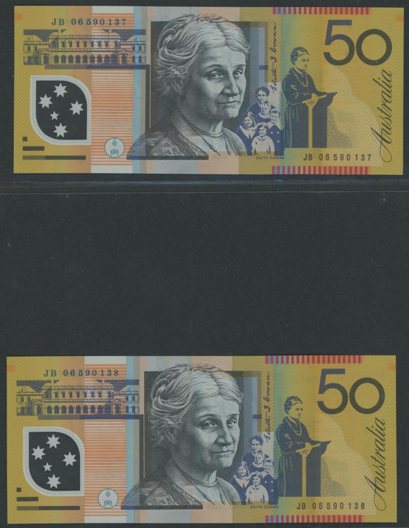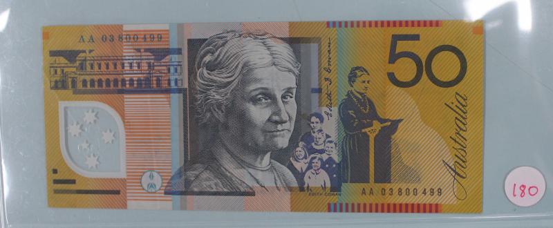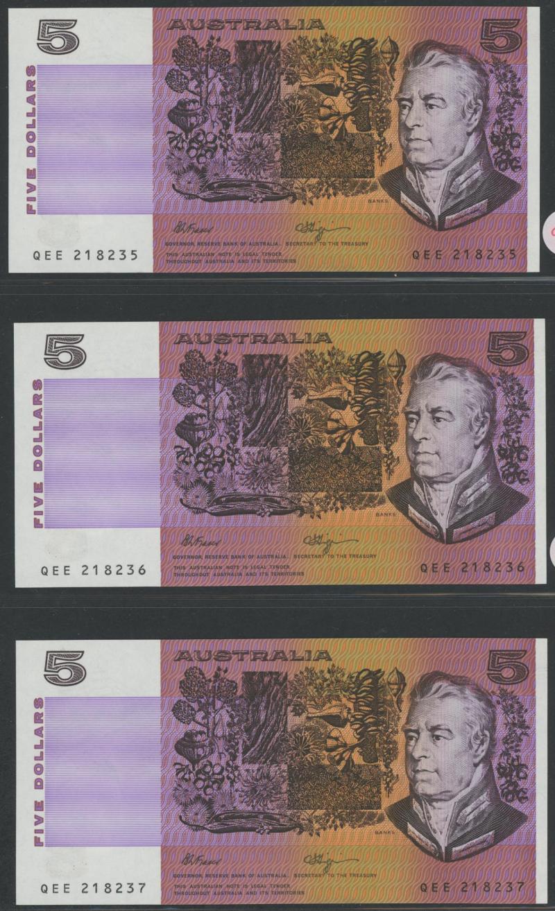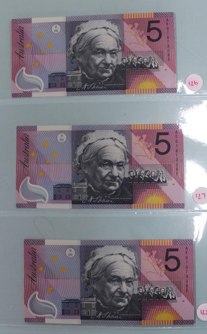 3256 imageRemainder group comprising 1992 $5 Fraser/Cole R214 consecutive run of ten serials 'AA02 541560'-'569' (Unc, Cat $500); and NPA 1995 $50 dated folder note serial 'AA95 009458' (Unc). (11) (Image1) (Image2) (Image3) (Image4)