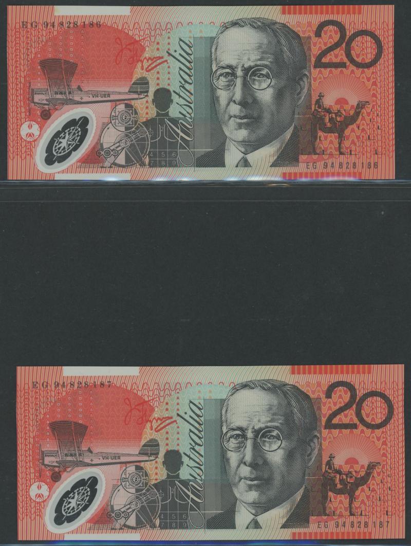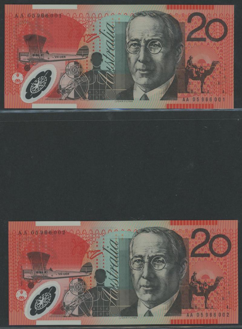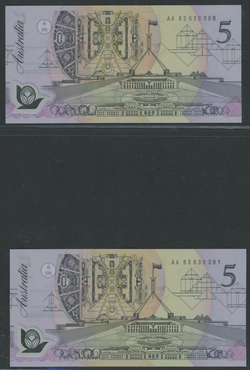 3263 image1988-2005 $5 to $100 polymer collection in Lighthouse album with slipcase comprising $5 (15) including 1992 Fraser/Cole R214i Pale Green Serials pair 'AA06 006131'-'132', 2001 Federation R219 consecutive run of three First Prefix 'AA01'; $10 1988 Bicentenary R310b Reissue (2), 1993 Fraser/Evans R316a pair, 1994 Fraser/Evans R316biF First Prefix 'AA94' pair (from folders); $20 1994 Fraser/Evans R416a pair, 2005 Macfarlane/Henry R420cF First prefix 'AA05', 2019 Lowe/Fraser R426 run of three; $50 1995 Fraser/Evans R516a, 2006 Macfarlane/Henry R520d pair, 2016 Stevens/Fraser R523, 2018 Lowe/Fraser R526 pair; $100 1996 Fraser/Evans R616F First Prefix 'AA96' (Cat $525), and R616L Last Prefix 'JK96' (Cat $750), 1999 Macfarlane/Evans R618bL Last Prefix 'JK99'; all Uncirculated. (40) (Image1) (Image2) (Image3) (Image4) (Image5) (Image6) (Image7) (Image8) (Image9) (Image10) (Image11) (Image12) (Image13) (Image14) (Image15) (Image16) (Image17)