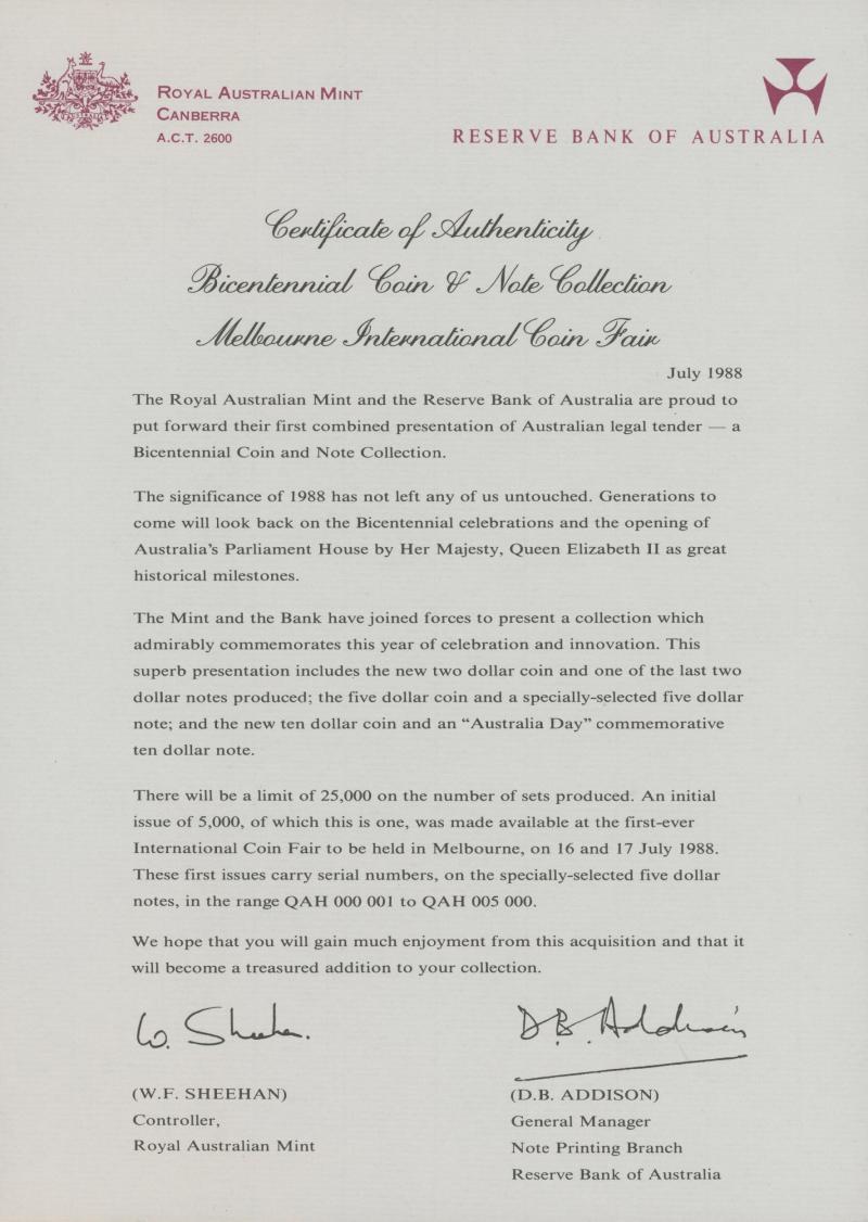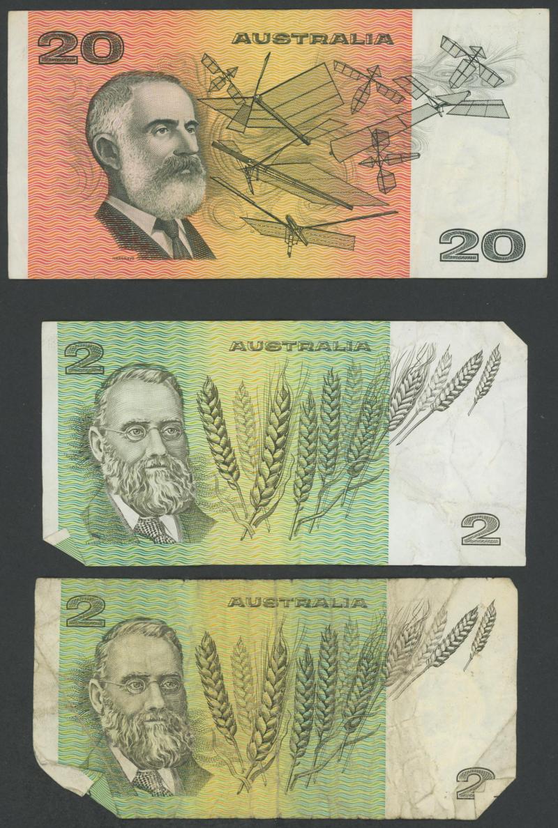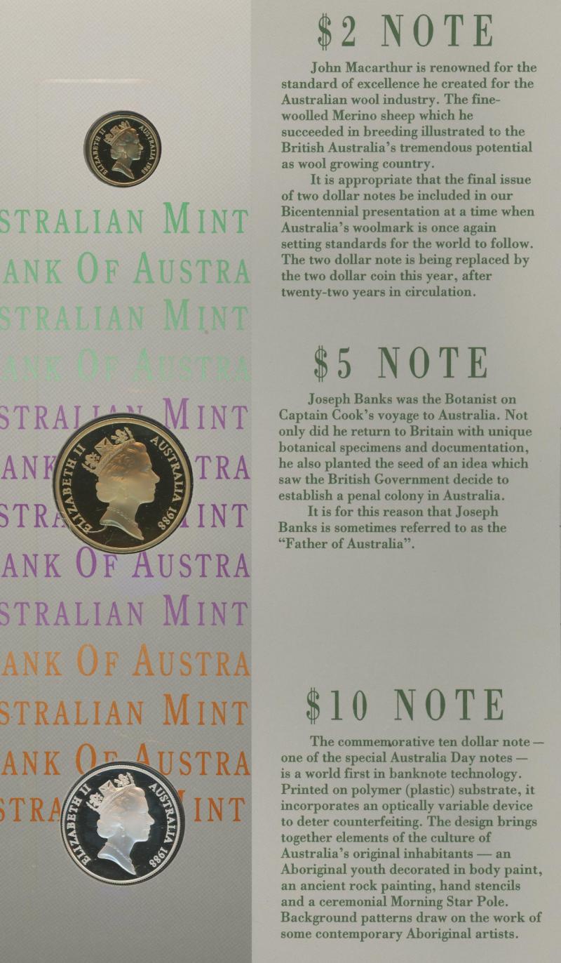 3255 imageGroup comprising 1988 Bicentennial Coin & Note Collection (aged folder), $10 Bicentenary First Issue R310a consecutive run of six, NPA 2017 $5 & $10 'Two Generations' folders, and $10 'Next generation' folder; plus paper $1 (4), $2 (2), & $20 (circulated). (20 notes, 3 coins) (Image1) (Image2) (Image3) (Image4) (Image5) (Image6) (Image7) (Image8) (Image9) (Image10) (Image11) (Image12) (Image13) (Image14)