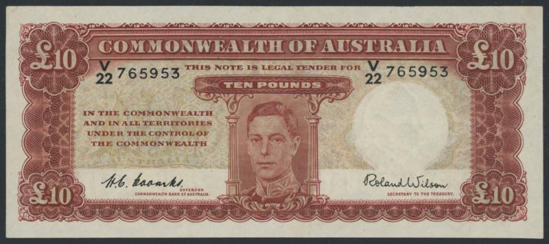 3250 image1952 KGVI £10 Coombs/Wilson R61F First Prefix serial 'V/22 765953', flattened creases, light soiling, VF, Cat $1200. (Image1) (Image2)