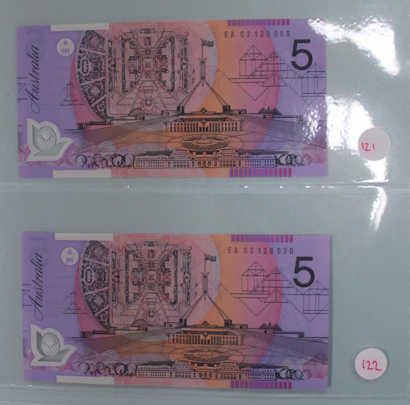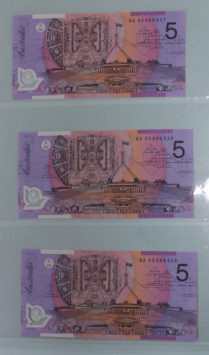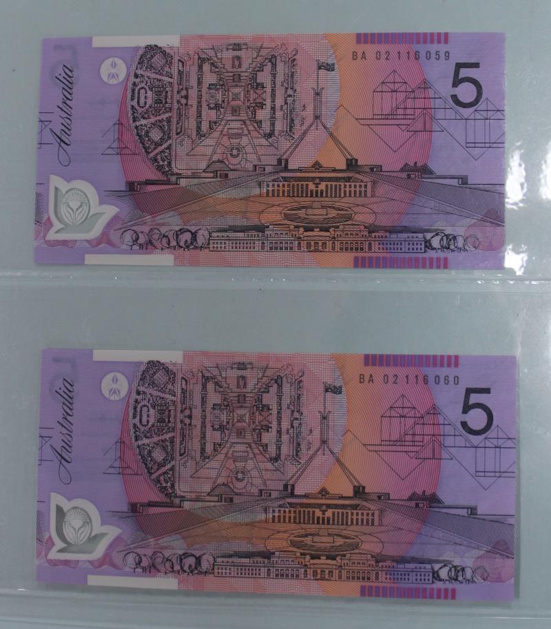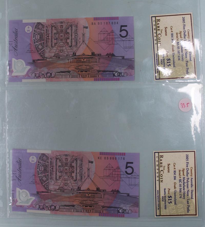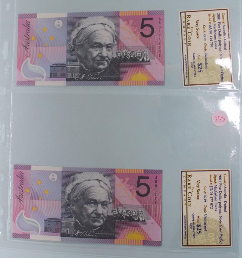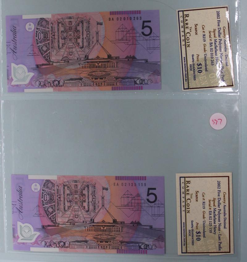 3262 image1988-2005 $5 to $100 polymer collection in Lighthouse Vario sleeves with $5 (x52) including 1995 Fraser/Evans R217aF consecutive pair First Prefix serials 'BA95 201808'-'809' (Cat $1300, see also lots 3278-3279), 1998 Macfarlane/Evans R218c Last Prefix 'EA98' pair, 2001 Federation R219 (17) with First Prefix 'AA01' x4, 2002 Macfarlane/Henry R220aF First Prefix x4 including Low Number serial 'BA02 000979', Last Prefix 'EA02' consecutive run of five; $10 (x12) 1988 Bicentenary Reissue R310b, 2002 Macfarlane/Henry R320a (9) including Last Prefix 'GL' consecutive run of four; $20 (x5) including 2002 Macfarlane/Henry R420aL Last Prefix 'KM02' (2); $50 (x9) First Prefix includes 'AA99' 'AA03' & 'AA04'; $100 1996 Test Notes First 'AN96' and Last Prefix 'CS96' (circulated); condition variable, individually described notes are all Unc (ex $100). (78) (Image1) (Image2) (Image3) (Image4) (Image5) (Image6) (Image7) (Image8) (Image9) (Image10) (Image11) (Image12) (Image13) (Image14) (Image15) (Image16) (Image17) (Image18) (Image19) (Image20) (Image21) (Image22) (Image23) (Image24) (Image25) (Image26) (Image27) (Image28) (Image29) (Image30) (Image31) (Image32)