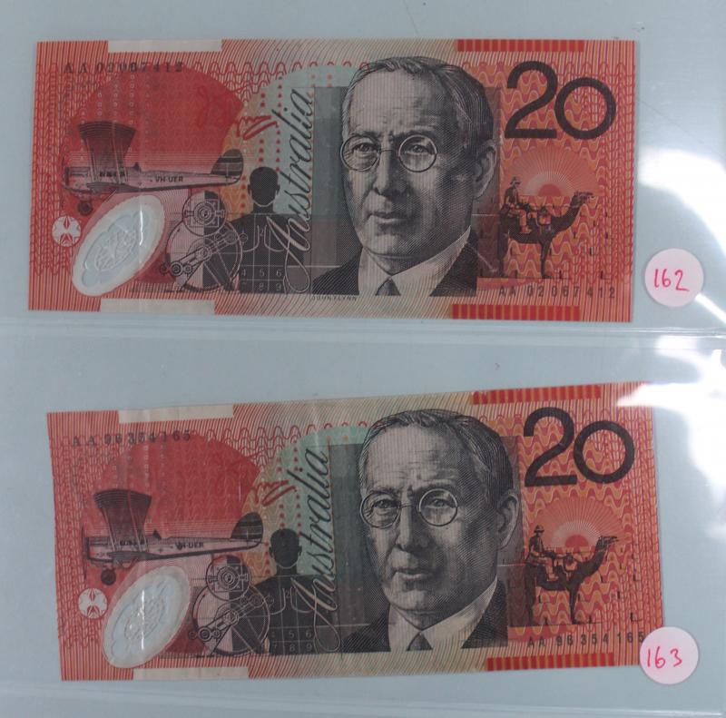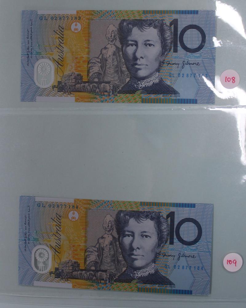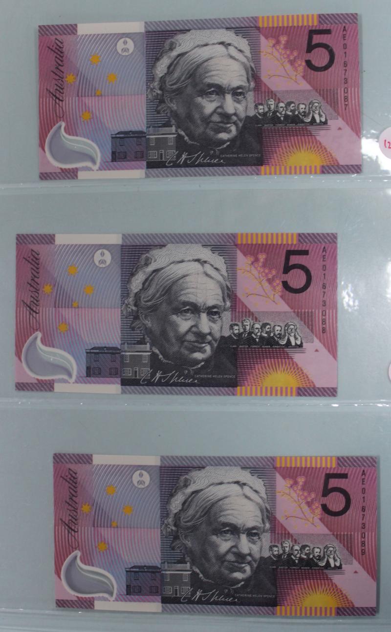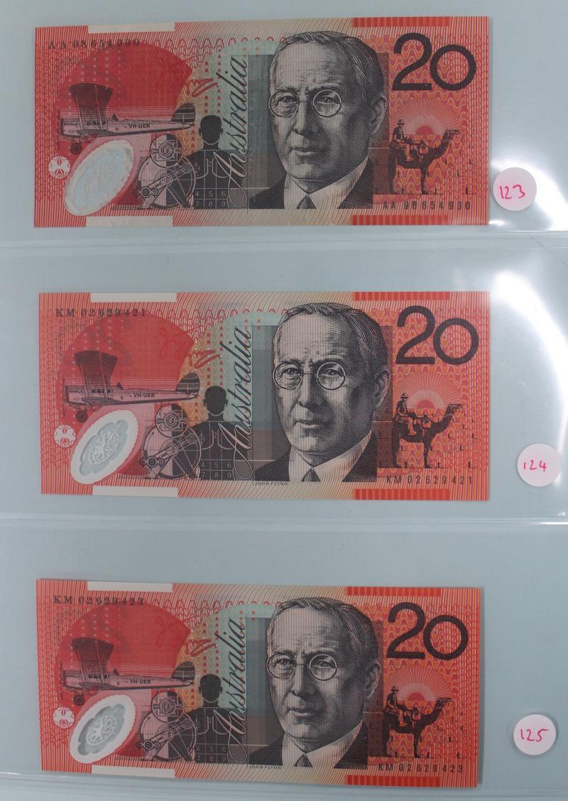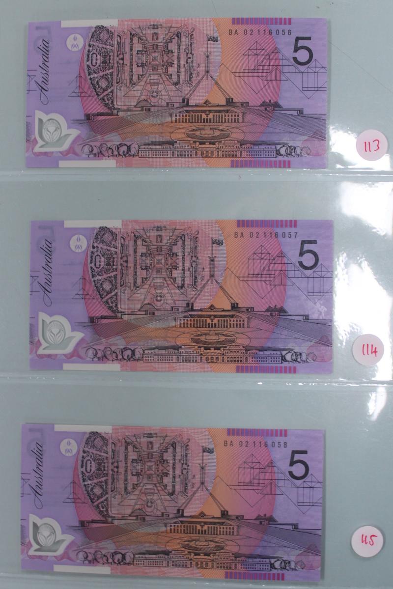 3262 image1988-2005 $5 to $100 polymer collection in Lighthouse Vario sleeves with $5 (x52) including 1995 Fraser/Evans R217aF consecutive pair First Prefix serials 'BA95 201808'-'809' (Cat $1300, see also lots 3278-3279), 1998 Macfarlane/Evans R218c Last Prefix 'EA98' pair, 2001 Federation R219 (17) with First Prefix 'AA01' x4, 2002 Macfarlane/Henry R220aF First Prefix x4 including Low Number serial 'BA02 000979', Last Prefix 'EA02' consecutive run of five; $10 (x12) 1988 Bicentenary Reissue R310b, 2002 Macfarlane/Henry R320a (9) including Last Prefix 'GL' consecutive run of four; $20 (x5) including 2002 Macfarlane/Henry R420aL Last Prefix 'KM02' (2); $50 (x9) First Prefix includes 'AA99' 'AA03' & 'AA04'; $100 1996 Test Notes First 'AN96' and Last Prefix 'CS96' (circulated); condition variable, individually described notes are all Unc (ex $100). (78) (Image1) (Image2) (Image3) (Image4) (Image5) (Image6) (Image7) (Image8) (Image9) (Image10) (Image11) (Image12) (Image13) (Image14) (Image15) (Image16) (Image17) (Image18) (Image19) (Image20) (Image21) (Image22) (Image23) (Image24) (Image25) (Image26) (Image27) (Image28) (Image29) (Image30) (Image31) (Image32)