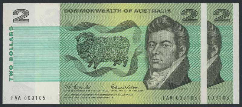 1966 $2 Coombs/Wilson R71F consecutive First Prefix serial pair 'FAA 009105'-'9106', fresh Uncirculated, Cat $4800+. (2) (Image1) (Image2)