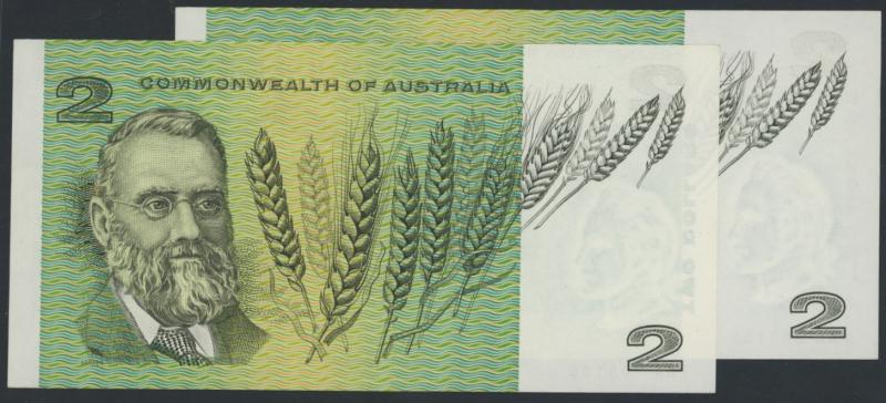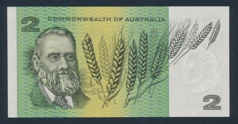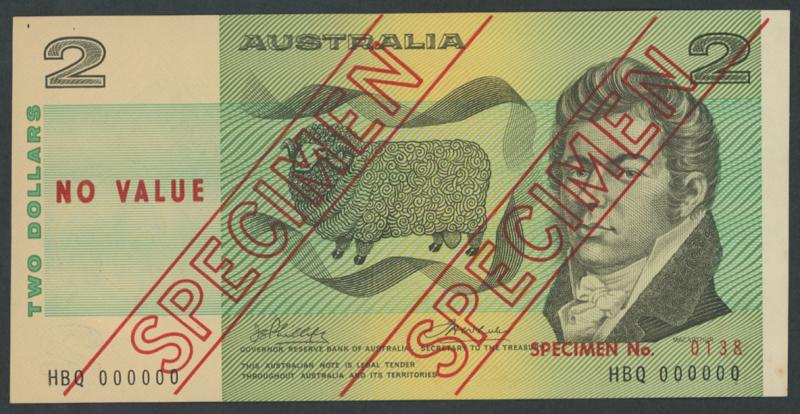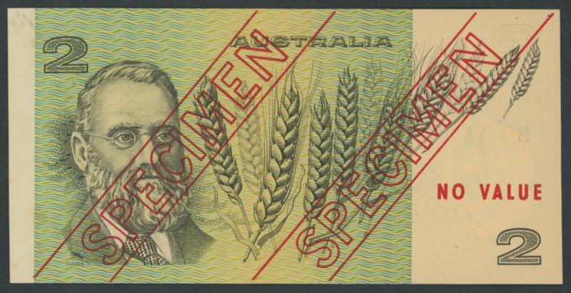SPECIMEN: 1974 $2 Phillips/Wheeler 'AUSTRALIA' Specimen Type 3 R#SP17, obv. 'SPECIMEN' twice diagonally 'NO VALUE' left and
