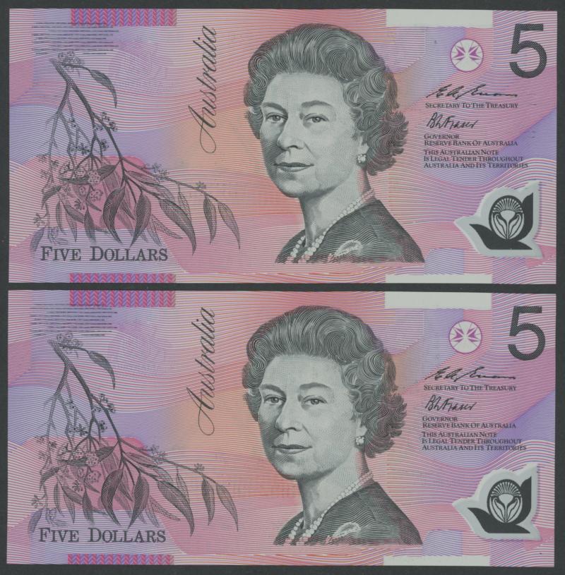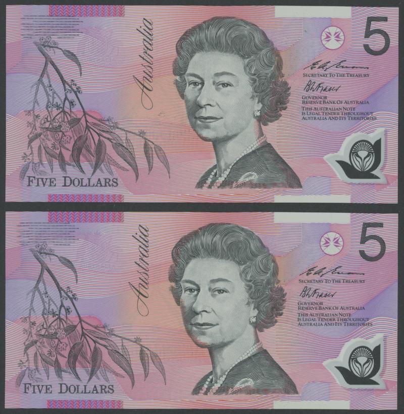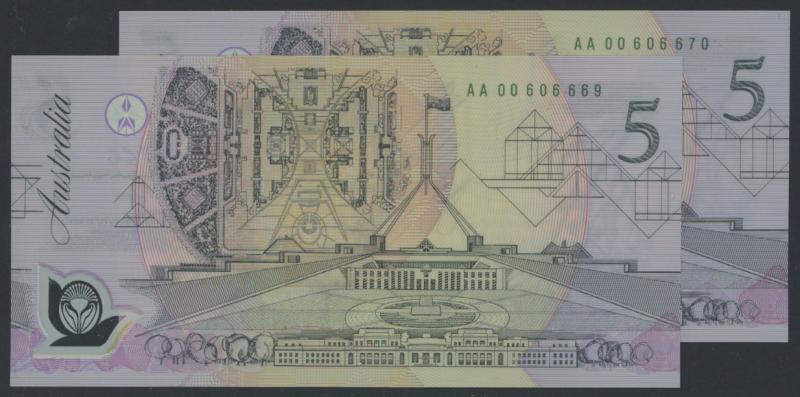 1992 $5 Fraser/Cole R214F pair First Prefix Medium to Dark Green Serials 'AA00 606669'-'670, Uncirculated, Cat $570. (2) (Image1) (Image2)