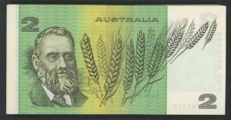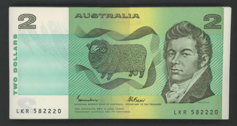 1985 $2 Johnston/Fraser R89 banded run of 95 serials 'LKR 582220'-'314, includes RADAR '582285' Unc, Cat $1140.