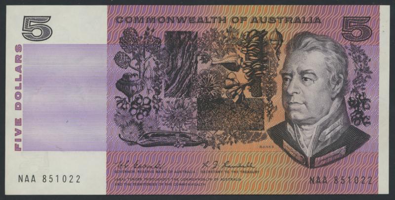 1967 $5 Coombs/Randall R202F First Prefix serial 'NAA 851022', three light vertical folds and a couple of teller bends, EF, Cat