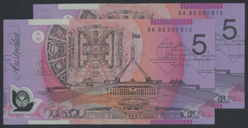 1995 $5 Fraser/Evans R217aF consecutive pair First Prefix serials 'BA95 201813'-'813', Uncirculated, Cat $1300. Continued serials