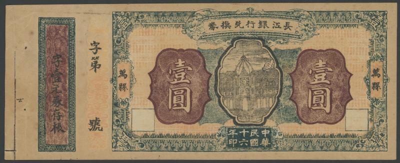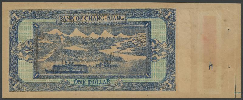 Bank of Chang-Kiang 1927 (year 16) $1 blue-green & brown on yellow underprint with counterfoil ('4'), Pick Unlisted, rev.