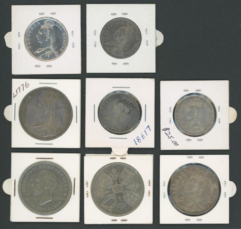4/- Arabic '1' in Date S3923, Crown 5/- 1887 S3921; plus Crowns KGVI 1951, & QEII 1952, condition variable. (8) (Image1) (Image2)