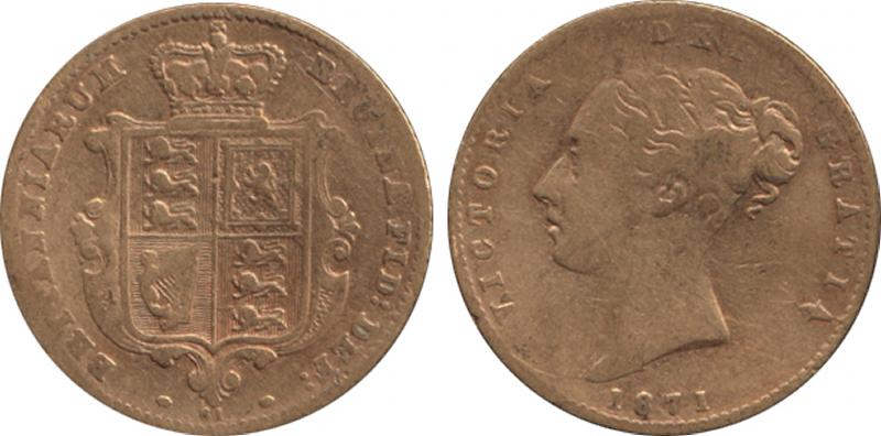 HALF-SOVEREIGN: 1871 QV Young Head Shield reverse, Die '20' (not listed in Numbers So far Known Marsh), Marsh 442, Spink 3860D,