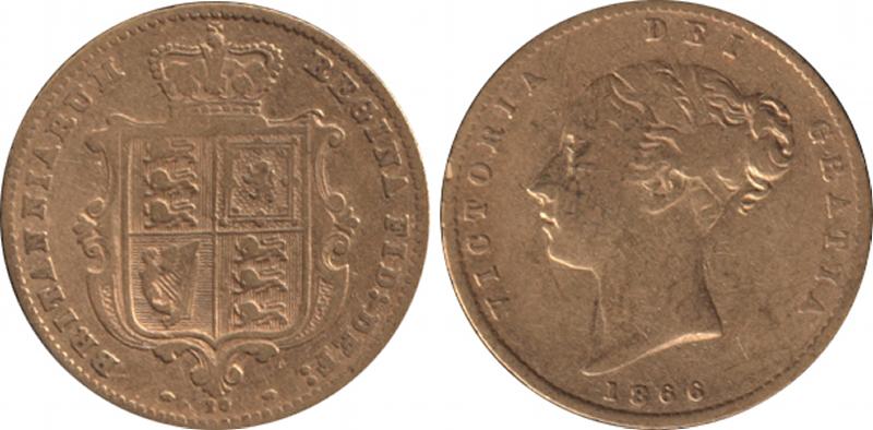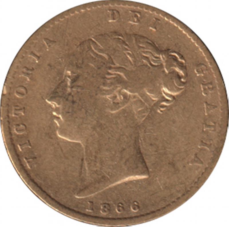 HALF-SOVEREIGN: 1866 QV Young Head Shield reverse, Marsh 30, Spink 3852, gFine. (Image1) (Image2)