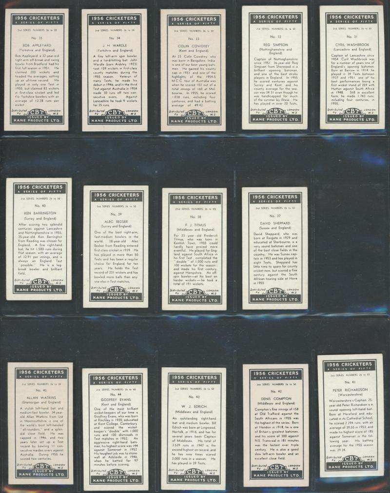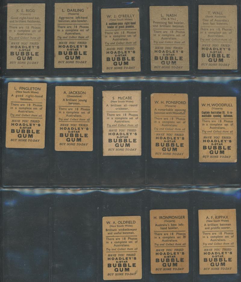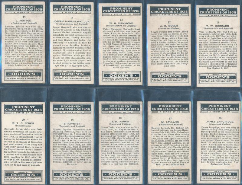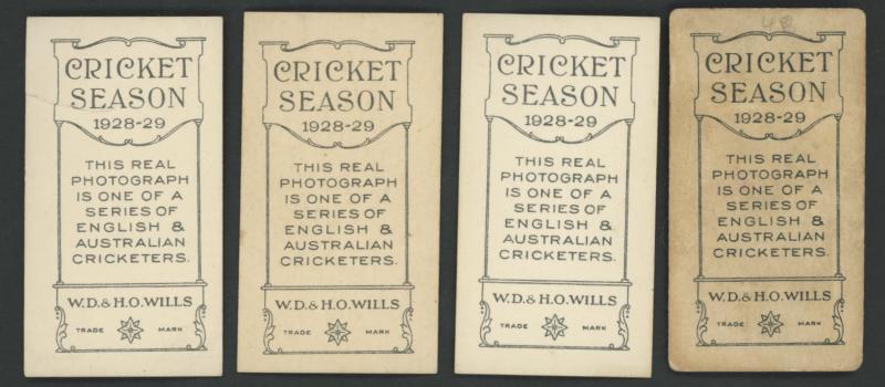 English Cricketers' (30); 1926 Wills 'Real Photo Cricketers' (34); Players 'Cricketers 1930' [50] & 'Cricketers 1938' [50]; Godfrey Phillips 'Test Cricketers 1932-1933' [38]; 1948 Nabisco 'Leading Cricketers' [32]; 1974 Sunicrust 'Cricketers' [40],