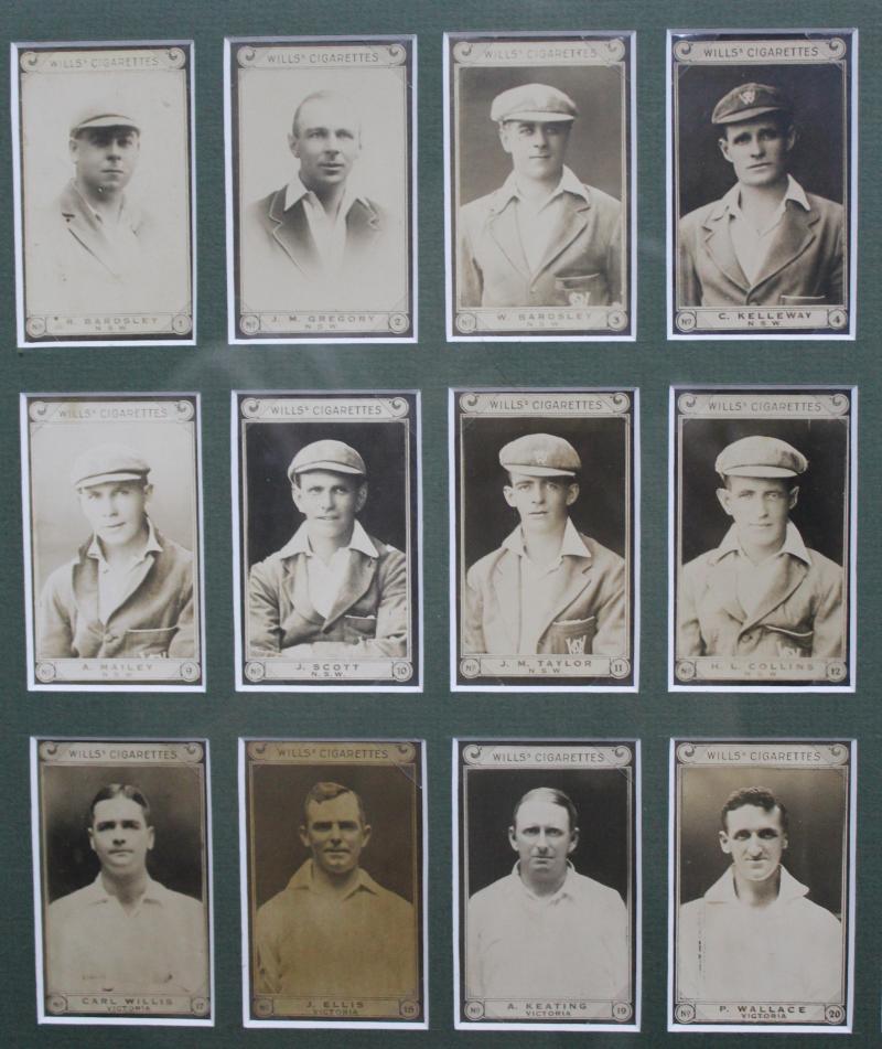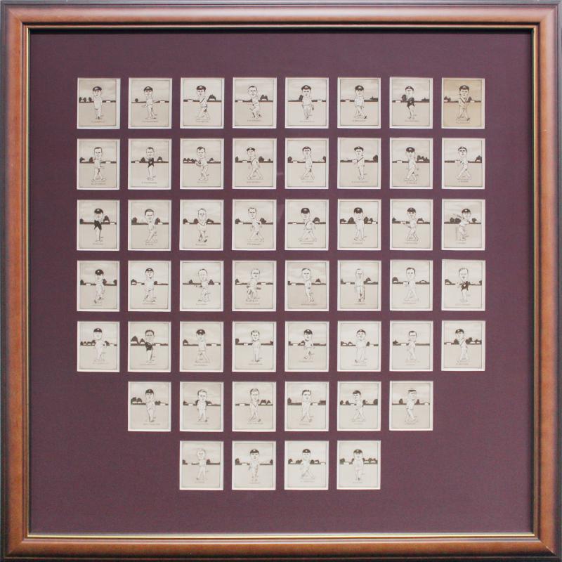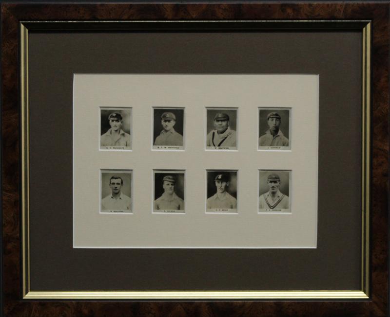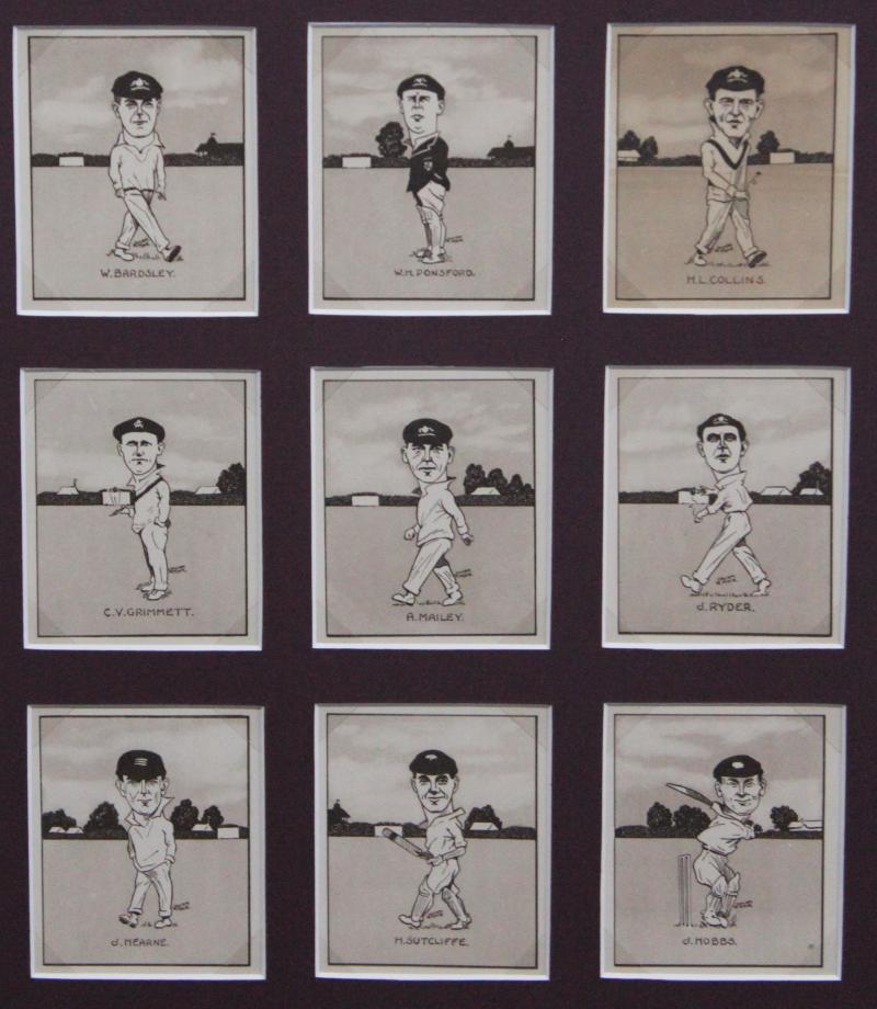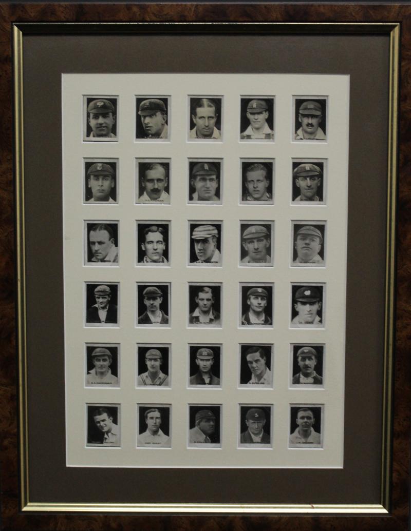 Press 'Famous Test Match Cricketers' [32]; Ogdens 'Cricket 1926' [50]; Wills (NZ) 'English Cricketers' [25]; Players 'Cricketers Caricatures by RIP' [50], all framed, various sizes, mainly Fine/Very Fine.