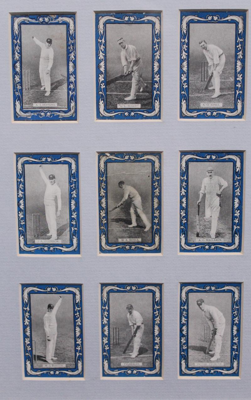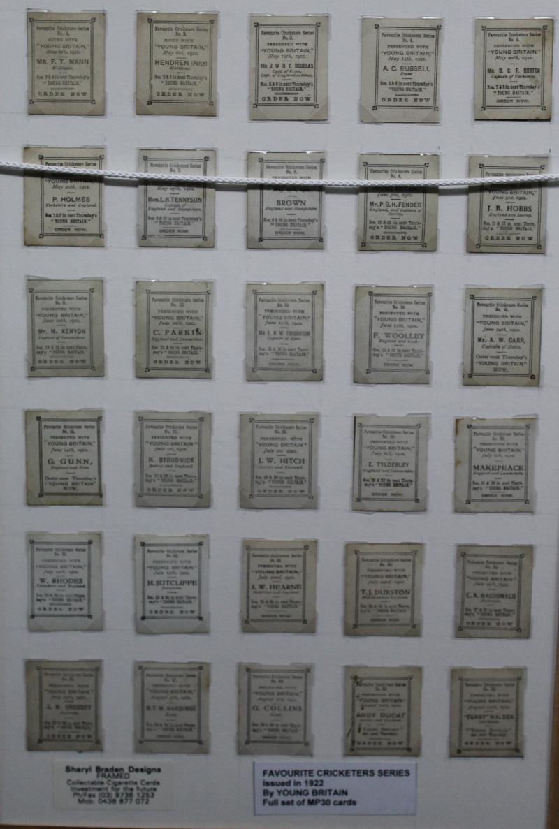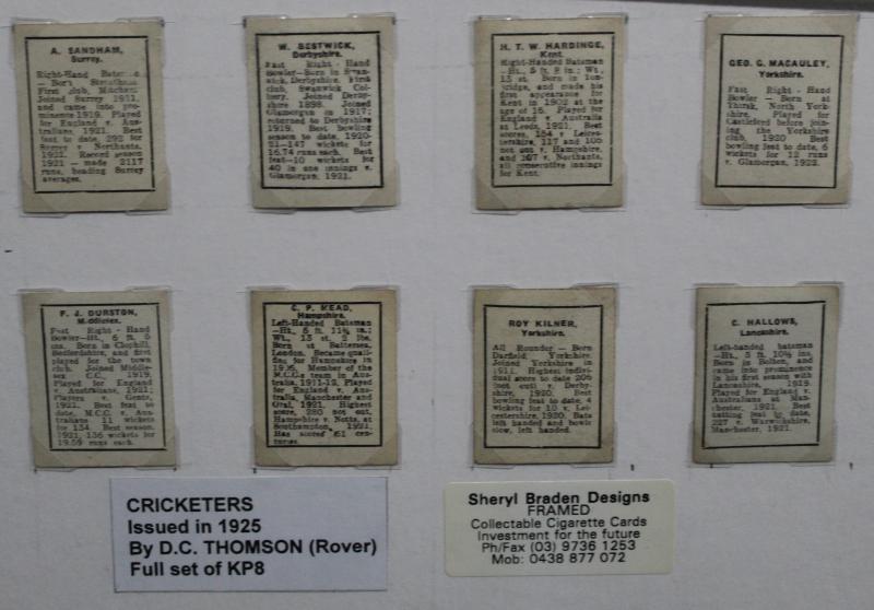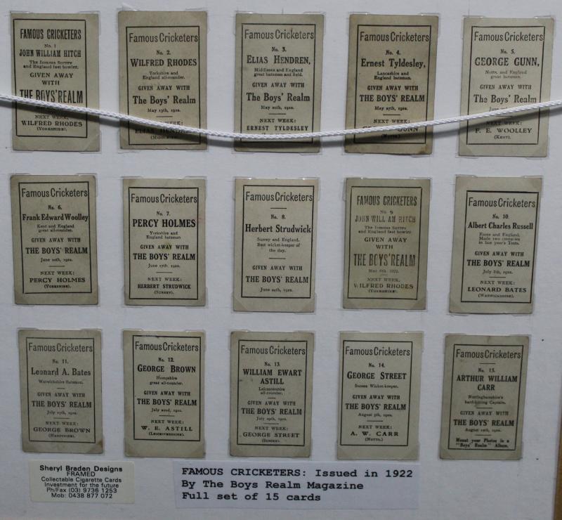 Press 'Famous Test Match Cricketers' [32]; Ogdens 'Cricket 1926' [50]; Wills (NZ) 'English Cricketers' [25]; Players 'Cricketers Caricatures by RIP' [50], all framed, various sizes, mainly Fine/Very Fine.