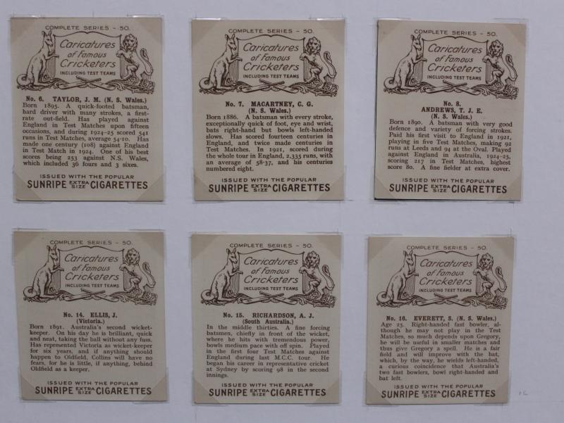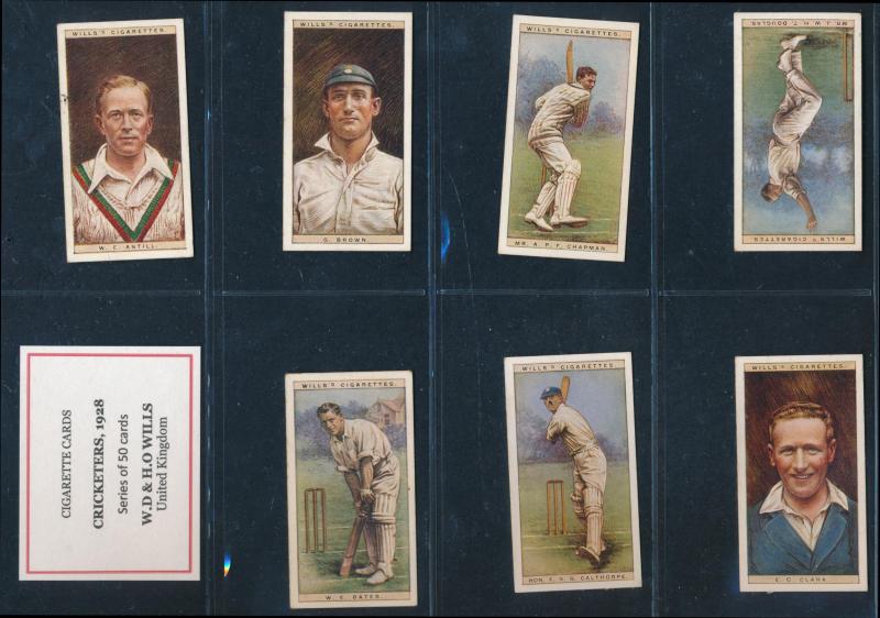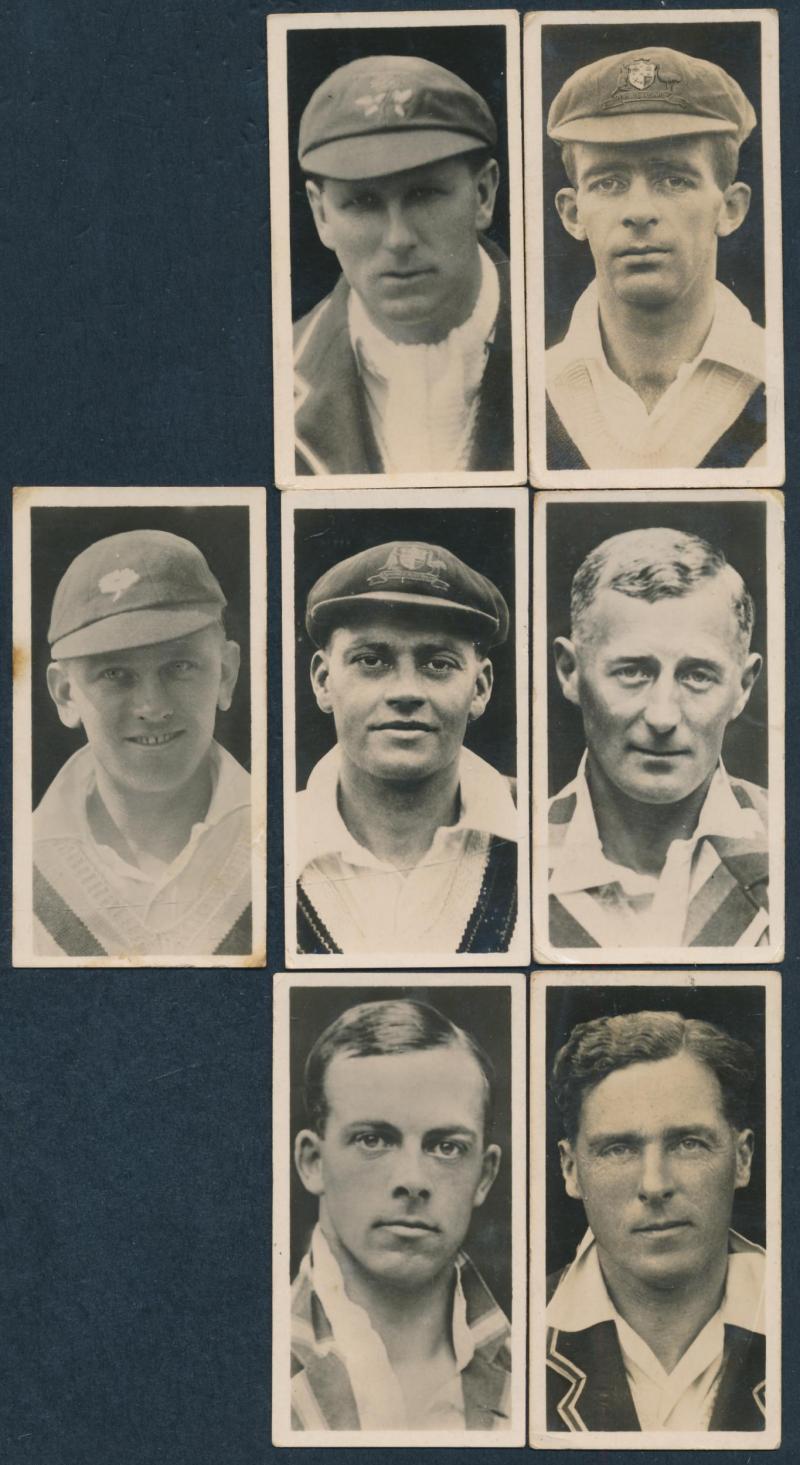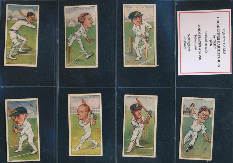 [25]; Players 1926 'Cricketers Caricatures by RIP' [50], 'Cricketers 1930' [50] with card No.4 signed by Don Bradman, 'Cricketers 1934' [50] & 'Cricketers 1938' [50]; 1926 Wills 'English Cricketers' [25]; 1928 'Englands Test Match Cricketers' [16];