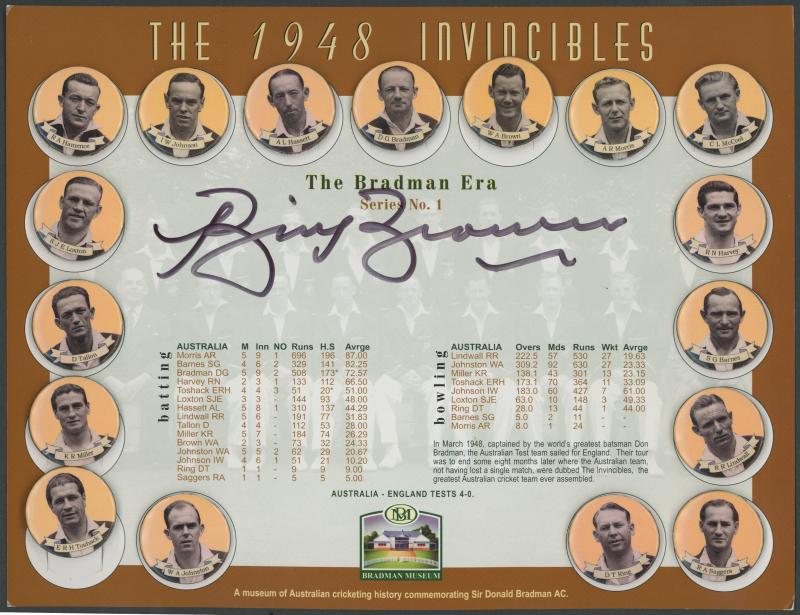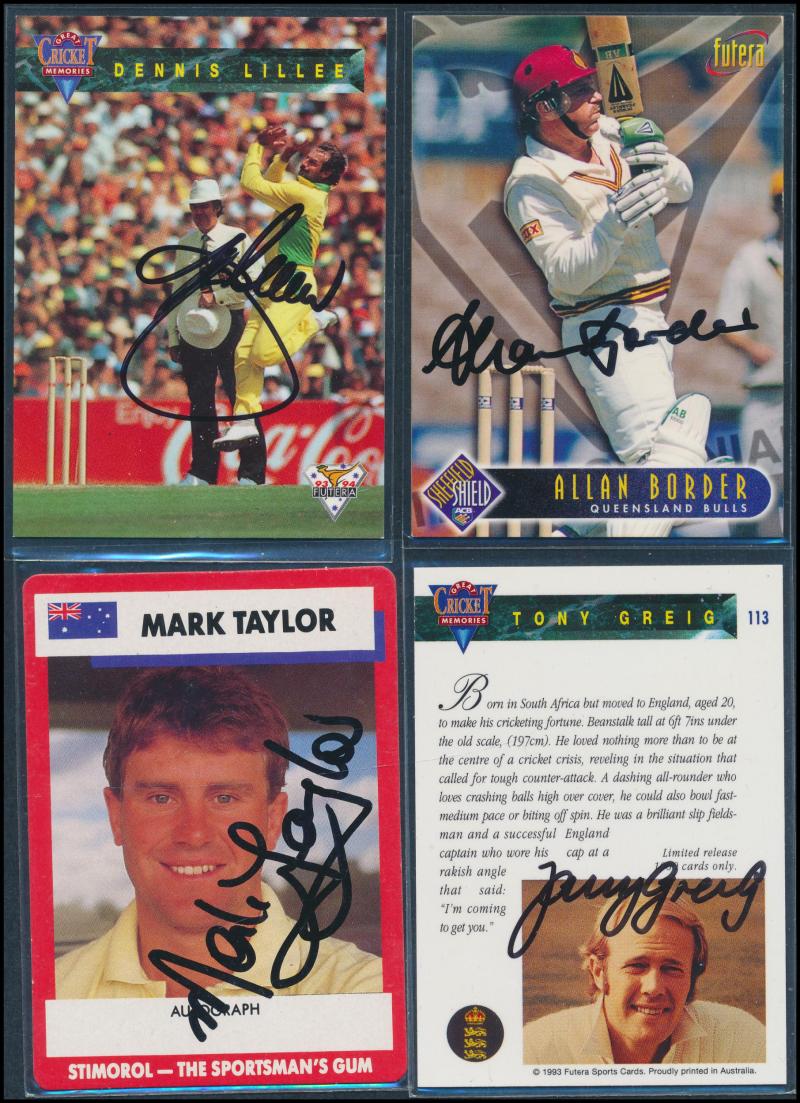 [100] in album; signed cards (4) - Allan Border, Mark Taylor, Dennis Lillee & Tony Greig; 1988 'The First Australians' [15]; also 'Friends of Bradman Museum' badge, mainly Fine/Very Fine.