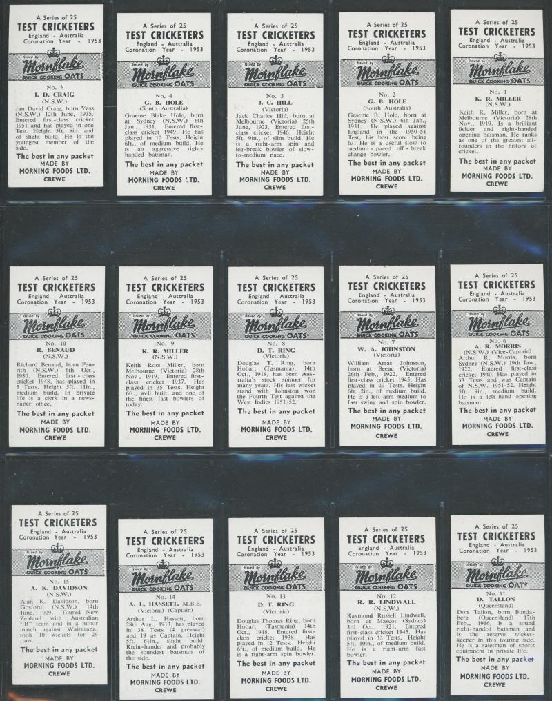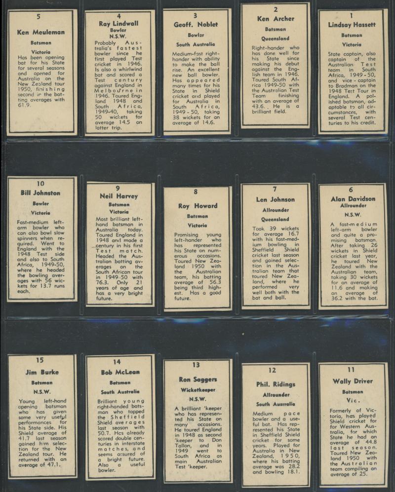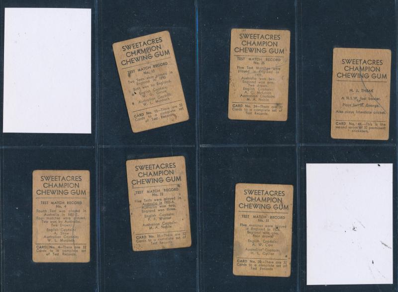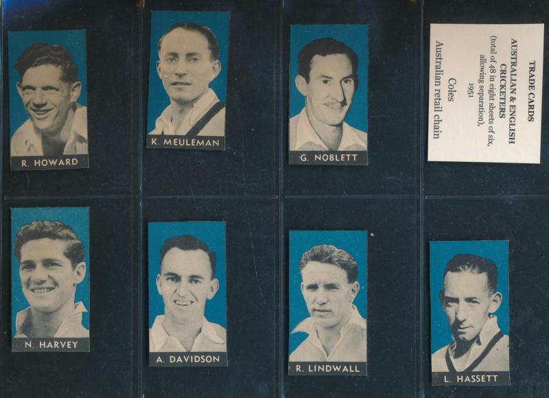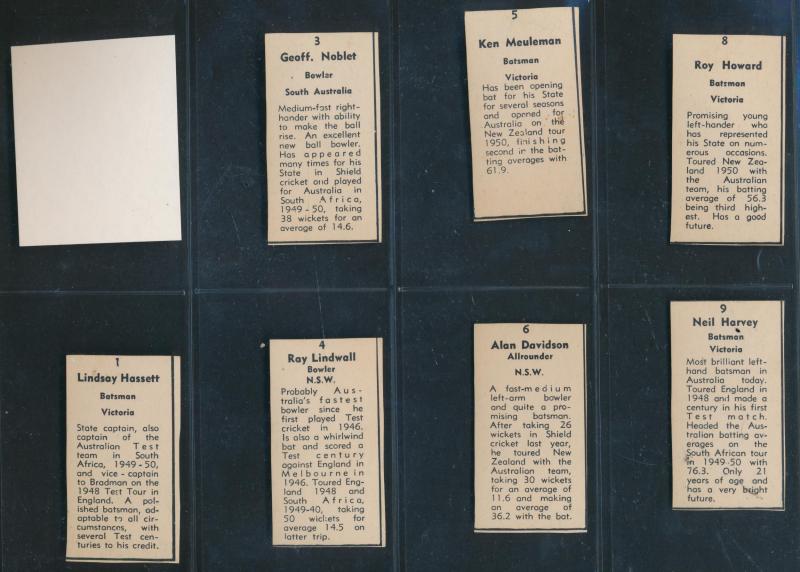 Cricketers' [48]; 1953 Morning Foods 'Test Cricketers' [25]; 1956 Kane Products '1956 Cricketers' [25], mainly Poor/Fine.