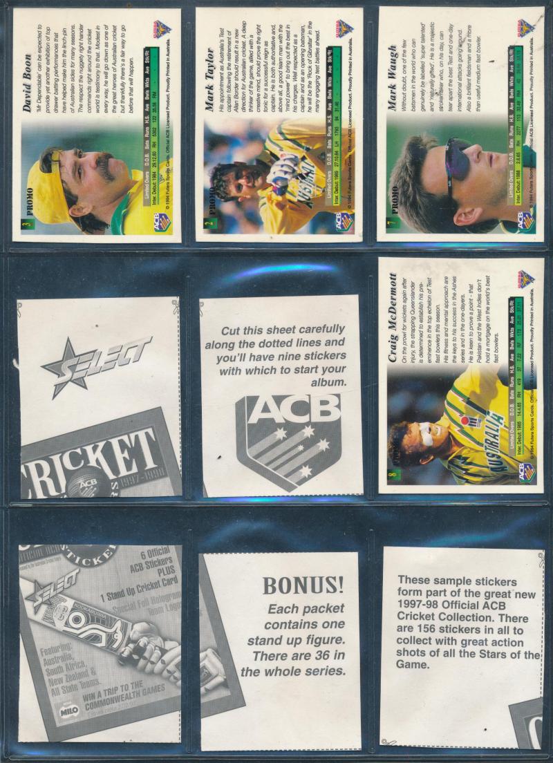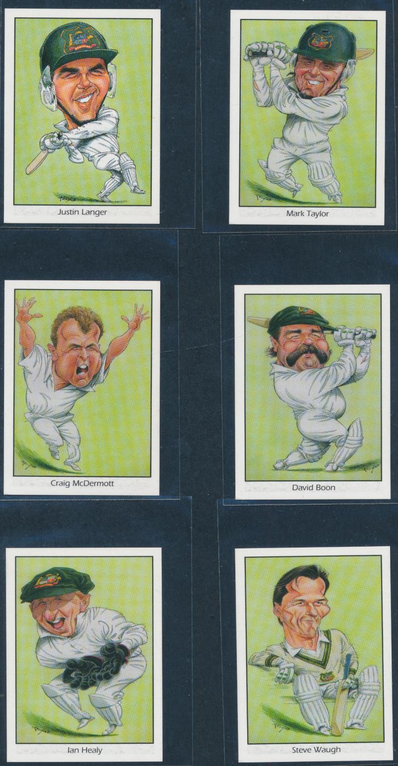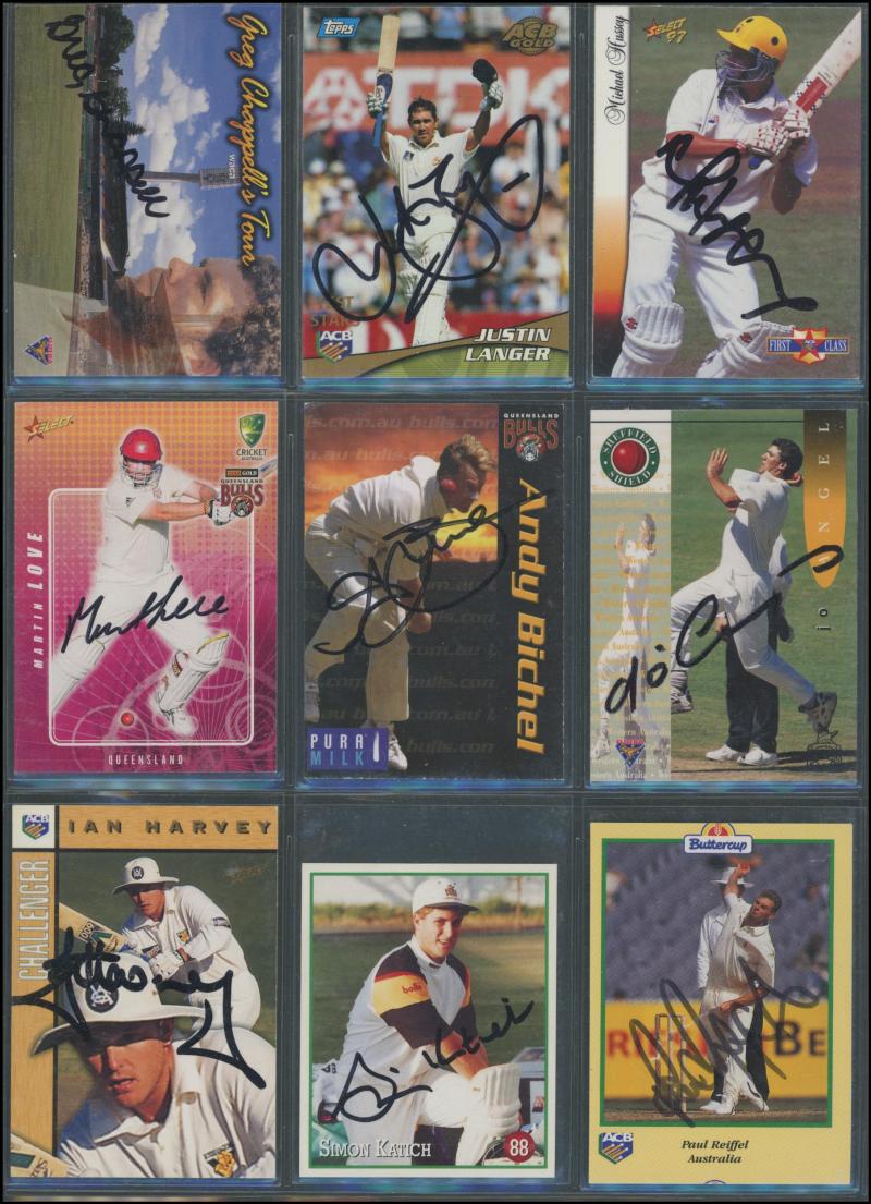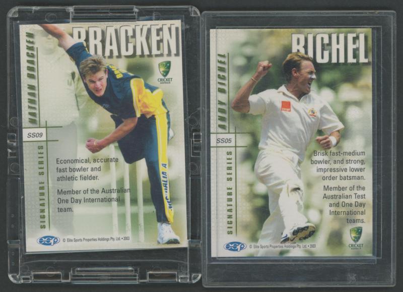 'Cricketers' [1/18]; 1955 Lifebuoy Soap 'Cricketers' [3/18]; 1974 Ajax 'Australian Cricketers' [8/11] (one with tape repair); 2003 Elite Sport 'Signature Cards' - Andy Bichel & Nathan Bracken; 2022 'Georgia Wareham Signature Card' number 009 of 126,