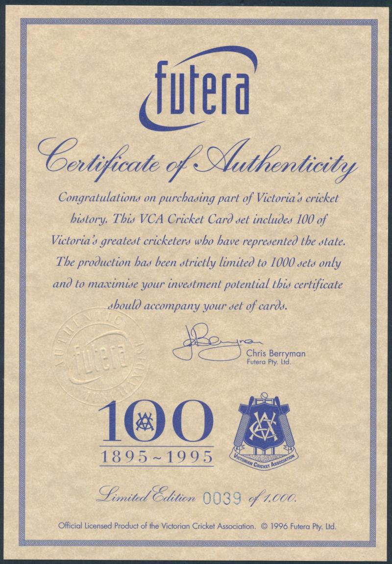 Balance of collection 1928-97 cricket cards, noted 1996 Futera 'Brian Lara 375' number 0037 of 375; 1995 Futera 'VCA Centenary'
