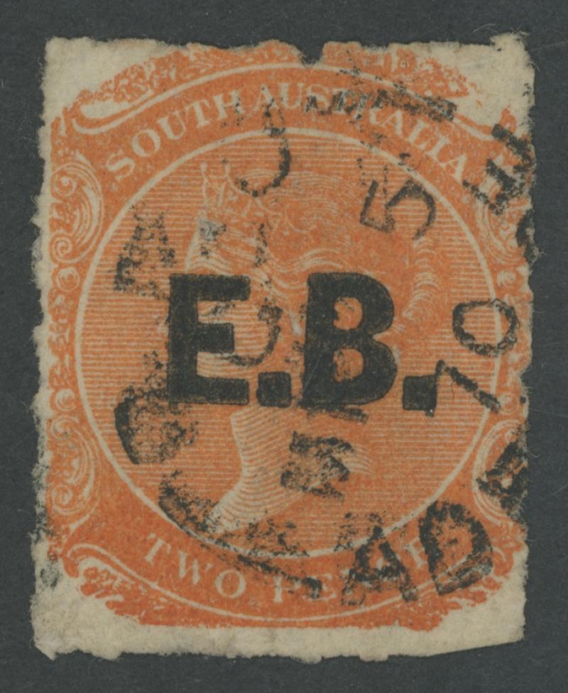 301 F imageBLACK OVERPRINT: 'E.B.' on QV De La Rue Large Star Wmk Rouletted 2d orange SG DO216a, rouletting on all sides, GPO cds of 'MR5/70', under-catalogued at £150. Rated RRR; unrecorded unused. Ex Victor Bullock: sold for $350 (Sale 130 Lot 438) and sold at an Adelaide auction of unknown date for $890. The very fine 'Besancon' example sold for SFr1450. Don Pearce's example with a small stain sold for $275 (Sale 247 Lot 281). [Date range 1.2.1870 to 3.12.1870] (Image1) (Image2)