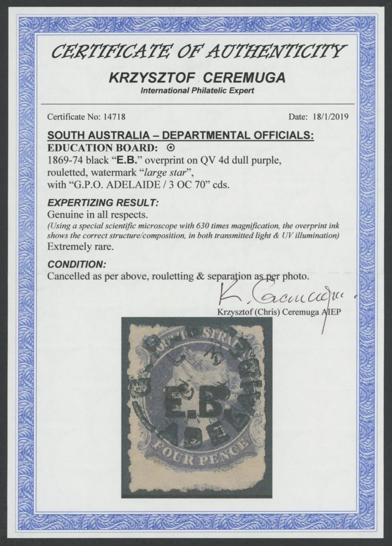 304 G imageBLACK OVERPRINT: 'E.B.' on QV Perkins Bacon Large Star Wmk Rouletted 4d deep violet SG DO217, rouletting on all sides with a fragment of the adjoining unit below, rounded lower-right corner well clear of the design, bold GPO cds of 'OC3/70', Cat £250. Rated RRRR; unrecorded unused. Ex Victor Bullock: sold for $221 (Sale 130 Lot 441). Chris Ceremuga Certificate (2019) states "extremely rare". The fine 'Tamiami' and very fine Don Pearce examples sold for $383 (Sale 236 Lot 599) and $407 (Sale 247 Lot 287) respectively. [Date range -.-.1869 to 9.8.1871] (Image1) (Image2) (Image3)