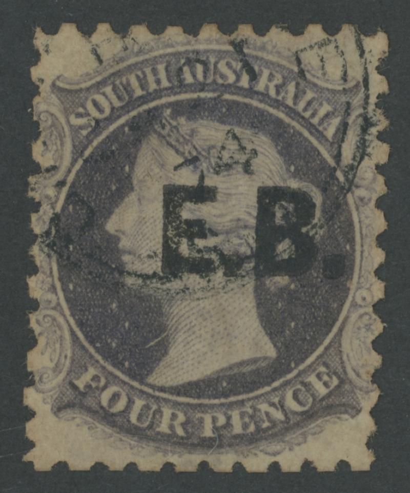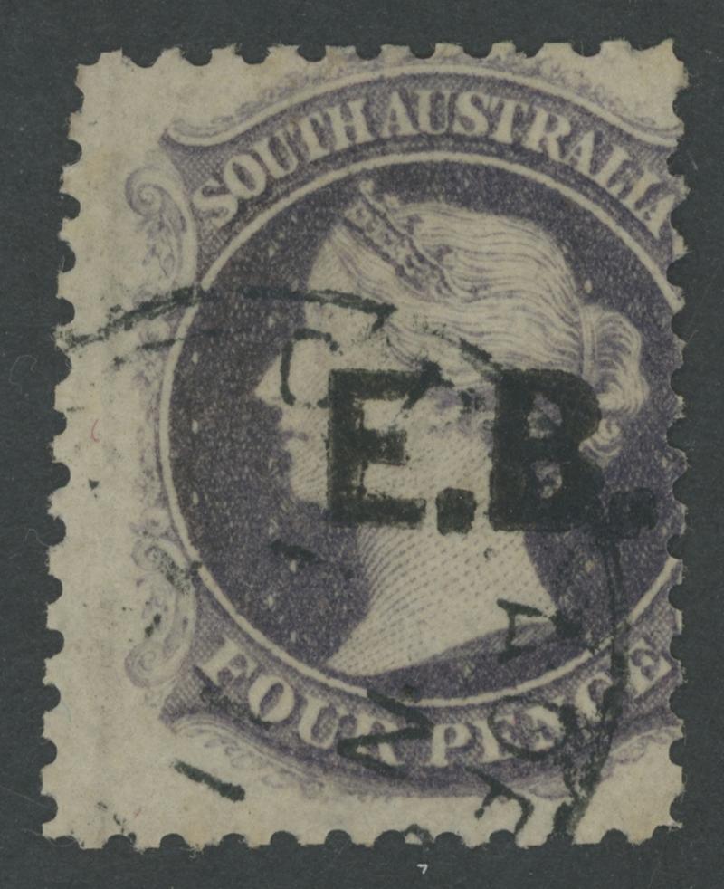 306 F imageBLACK OVERPRINT: 'E.B.' on QV Perkins Bacon Large Star Wmk Perf 10 4d deep violet SG DO222, well-centred, GPO cds of 1874, Cat £100+. Rated RR; unrecorded unused. Ex 'Sir Humphrey' (Brian Farmer): sold for $186 (Sale 118 Lot 340). Better centred than Don Pearce's example that sold for $179 (Sale 247 Lot 288). (Image1) (Image2)